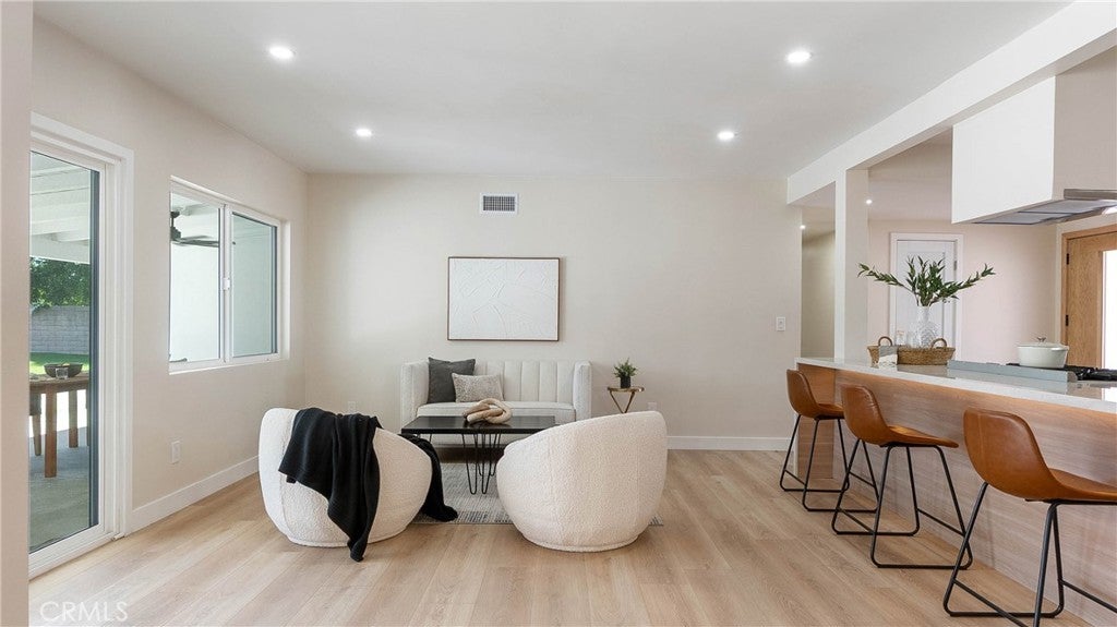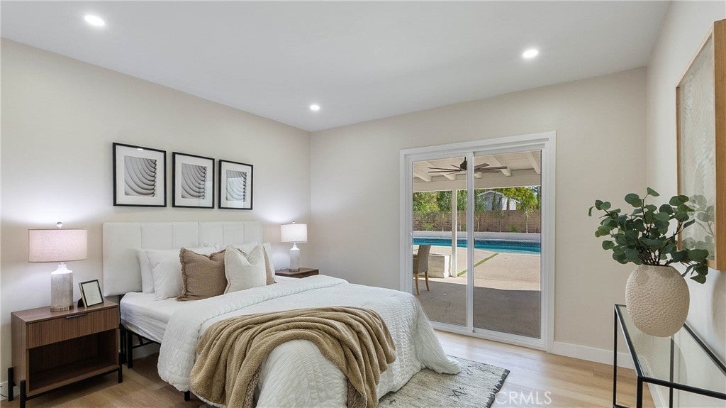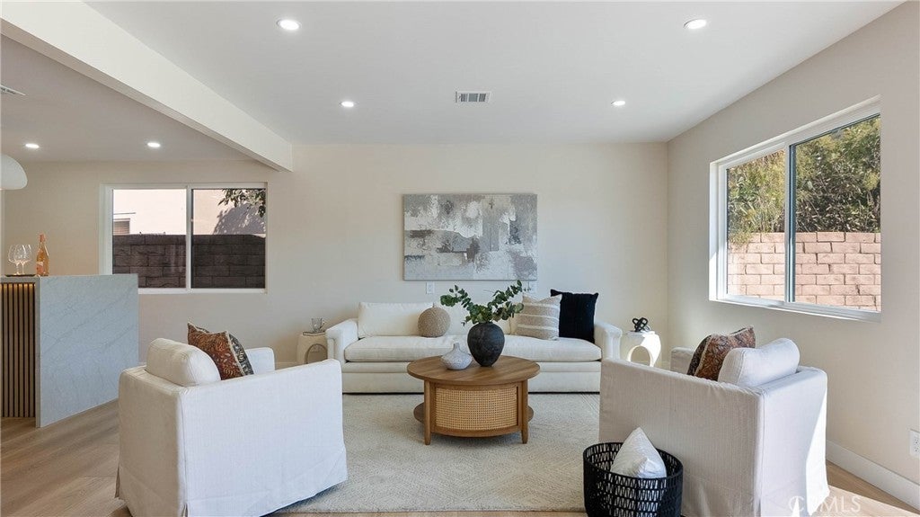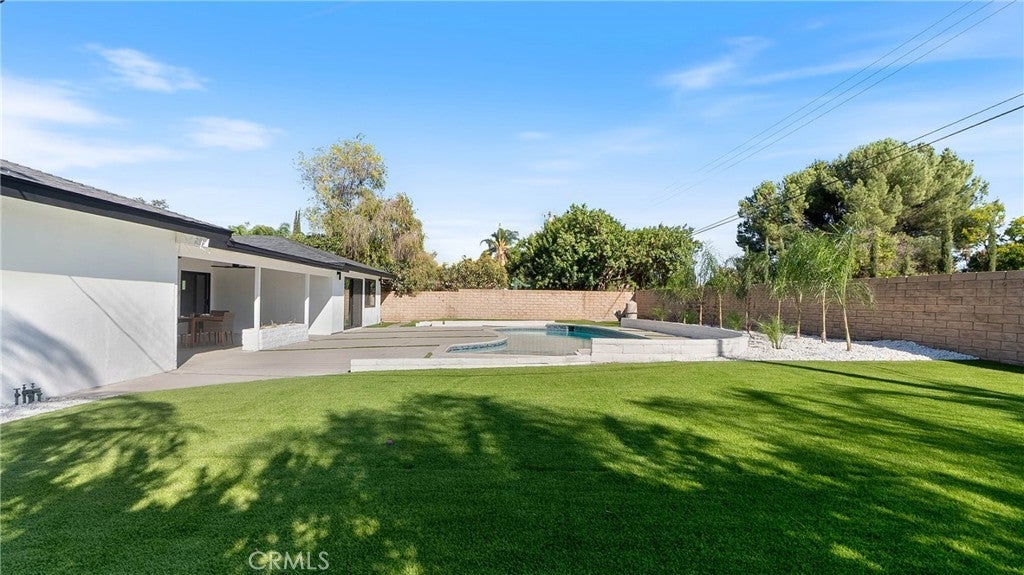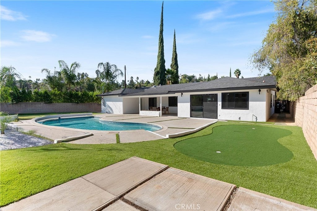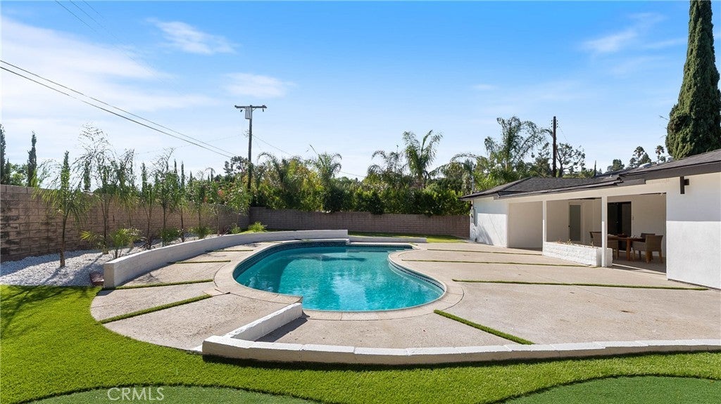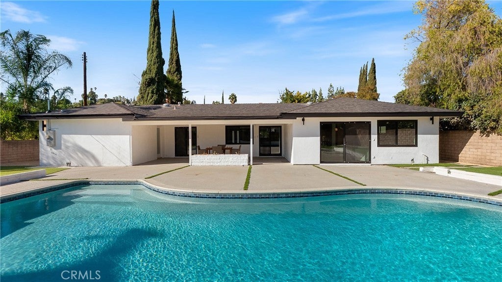 Welcome to this modern luxury retreat tucked away on a peaceful cul-de-sac in West Hills. With 4 bedrooms, 2 bathrooms, and 2,237 sq. ft. of designer living space on a 0.26-acre lot, this residence combines sophistication, comfort, and resort-style living in one remarkable property. Inside, soaring ceilings and an open-concept floor plan set the tone for elegant gatherings and relaxed family living. The spacious dining room showcases a stunning chandelier and custom wood-paneled ceiling detail, flowing seamlessly into the expansive living room and custom bar. The chef’s kitchen is a true showpiece, featuring a 6-burner island cooktop with range hood, built-in microwave, refrigerator, dishwasher, and abundant white oak cabinetry. The primary suite offers a spa-like sanctuary with a walk-in shower, soaking tub, and expansive walk-in closet, creating the perfect escape at the end of the day. Outdoors, the property transforms into an entertainer’s paradise with a sparkling pool surrounded by swaying palm trees, a mini golf area, spacious turf yard, and a covered patio with dual fans for year-round enjoyment. Located in a private, family-friendly neighborhood just minutes from Topanga Mall, The Village, scenic parks, and top-rated schools, this home offers the ultimate blend of modern elegance and California lifestyle.