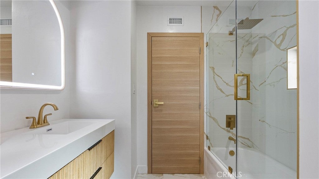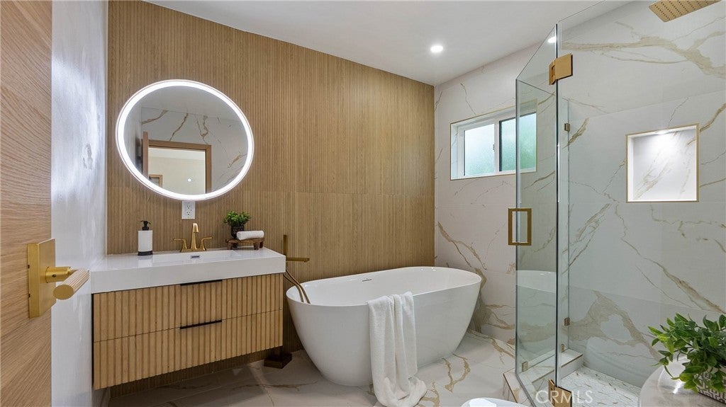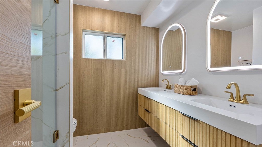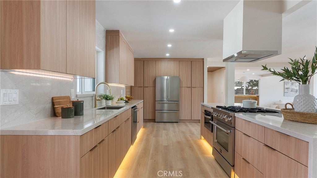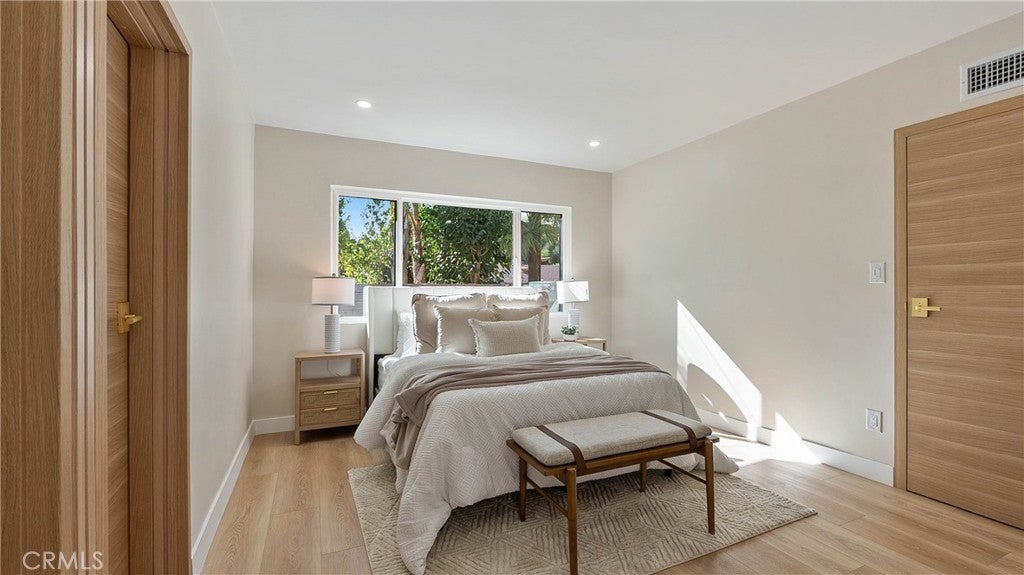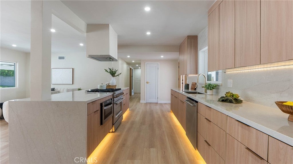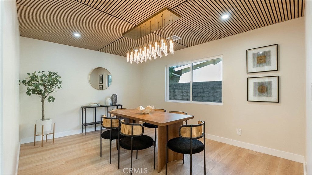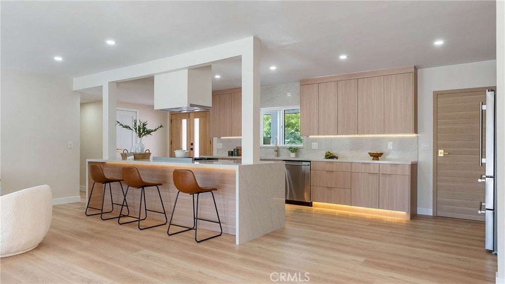 Welcome to this modern luxury retreat tucked away on a peaceful cul-de-sac in West Hills. With 4 bedrooms, 2 bathrooms, and 2,237 sq. ft. of designer living space on a 0.26-acre lot, this residence combines sophistication, comfort, and resort-style living in one remarkable property. Inside, soaring ceilings and an open-concept floor plan set the tone for elegant gatherings and relaxed family living. The spacious dining room showcases a stunning chandelier and custom wood-paneled ceiling detail, flowing seamlessly into the expansive living room and custom bar. The chef’s kitchen is a true showpiece, featuring a 6-burner island cooktop with range hood, built-in microwave, refrigerator, dishwasher, and abundant white oak cabinetry. The primary suite offers a spa-like sanctuary with a walk-in shower, soaking tub, and expansive walk-in closet, creating the perfect escape at the end of the day. Outdoors, the property transforms into an entertainer’s paradise with a sparkling pool surrounded by swaying palm trees, a mini golf area, spacious turf yard, and a covered patio with dual fans for year-round enjoyment. Located in a private, family-friendly neighborhood just minutes from Topanga Mall, The Village, scenic parks, and top-rated schools, this home offers the ultimate blend of modern elegance and California lifestyle.