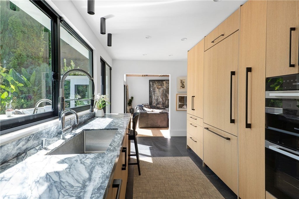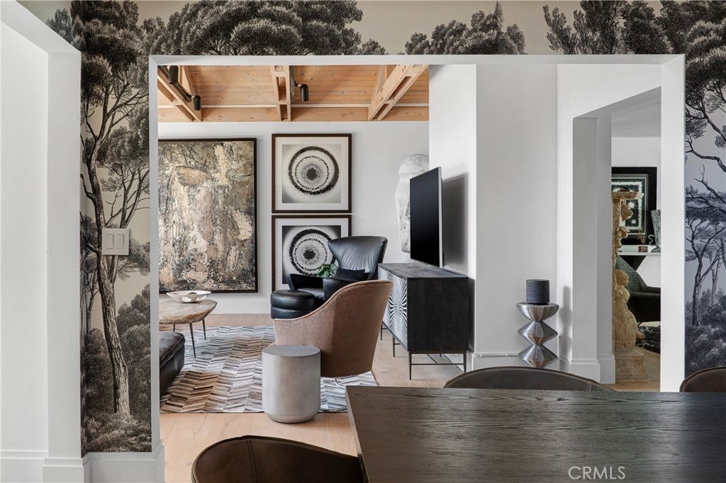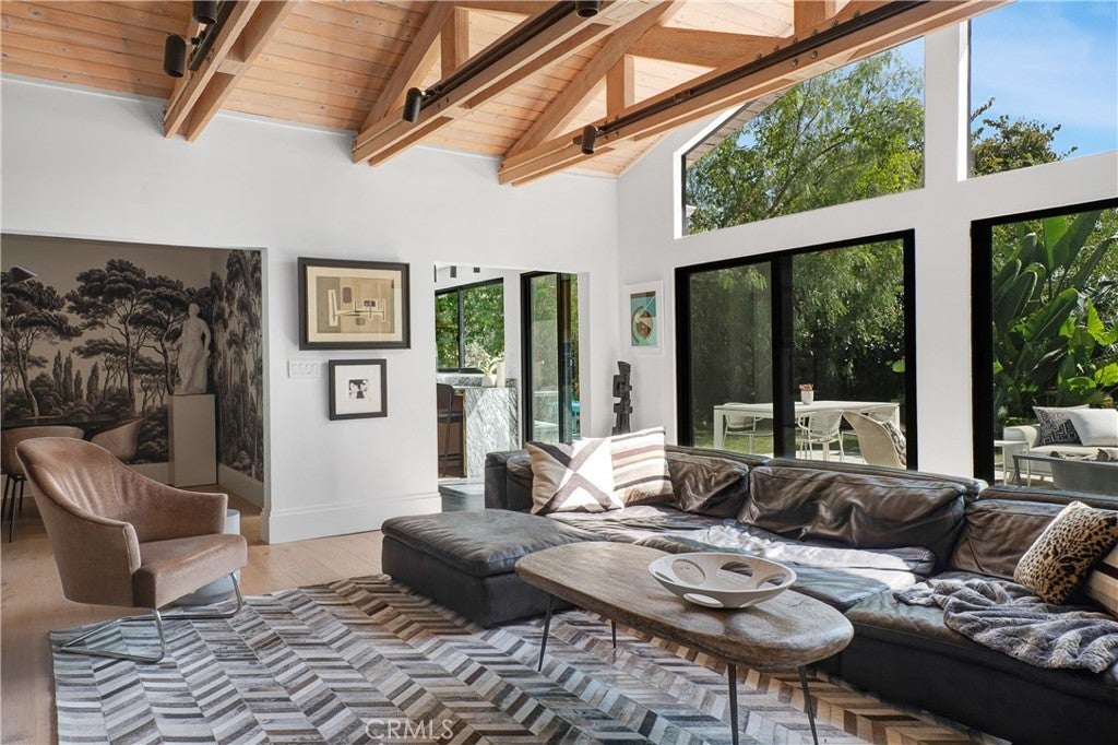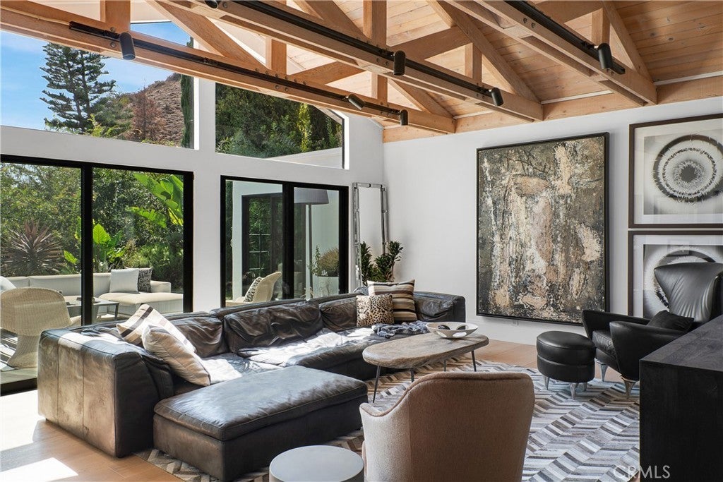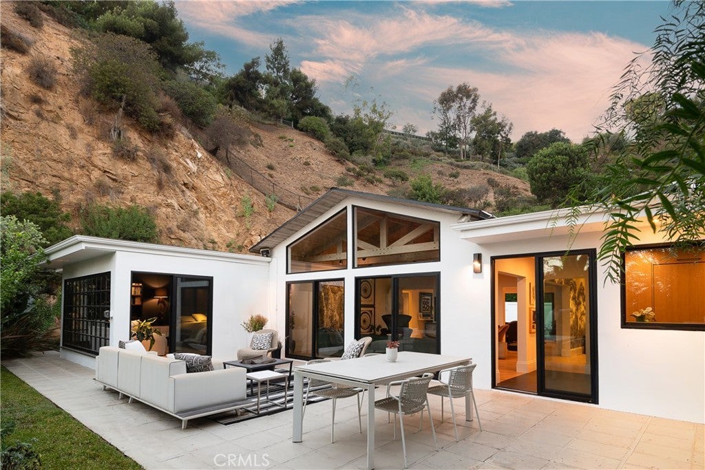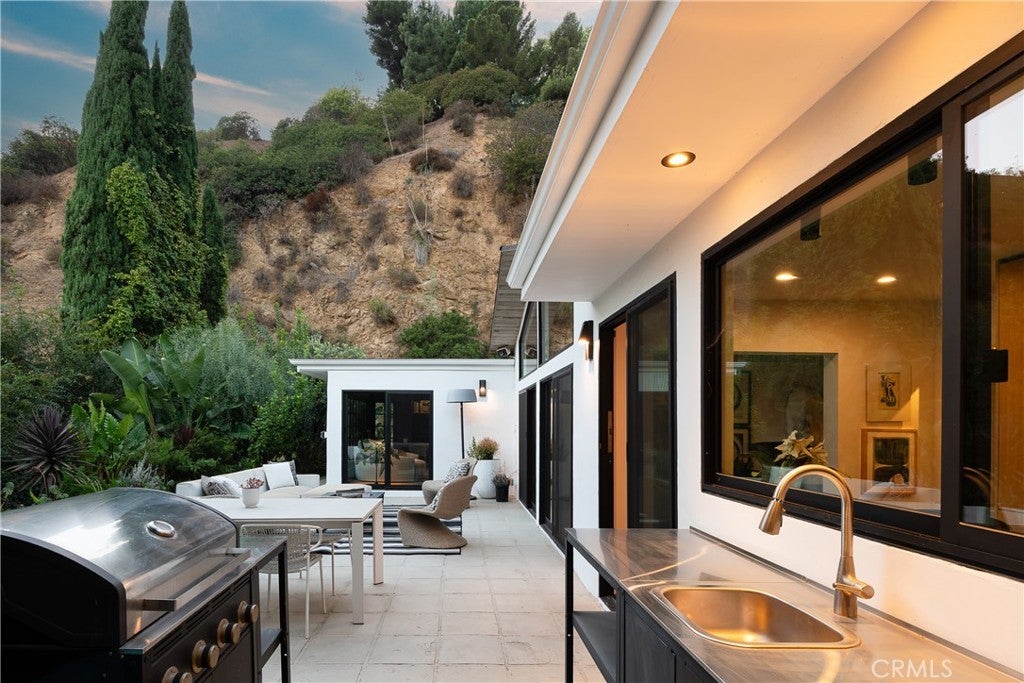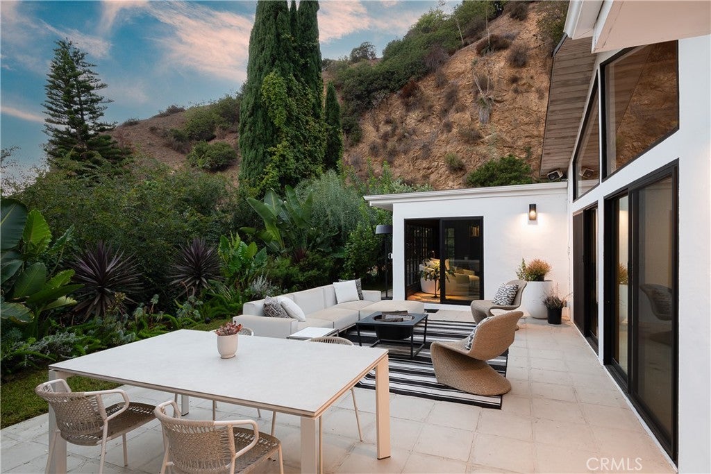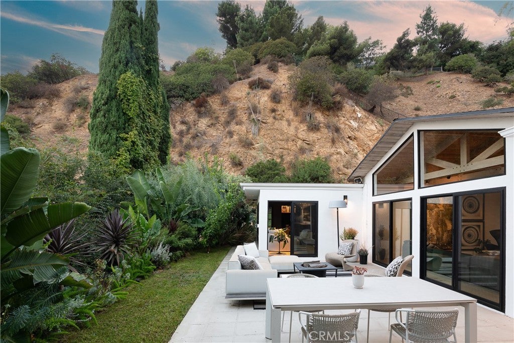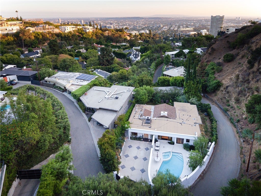 Perched on a serene cul-de-sac just above Sunset Boulevard in the coveted Bird Streets, this meticulously redesigned single-story residence blends high-end luxury with effortless indoor/outdoor living. Spanning approximately 2,300 sq ft on an expansive 8,400+ sq ft lot, the home features 3 bedrooms, 4 bathrooms, and a versatile den, all thoughtfully laid out for comfort and entertaining. Inside, a sun-filled open floor plan adorned with high end finishes, custom Parisian wall coverings, recessed lighting, and designer details throughout. The gourmet kitchen boasts top-of-the-line Miele appliances and sleek marble countertops, flowing seamlessly into the formal living room with an elegant statement fireplace. The spacious primary suite offers a custom closet, spa-like bathroom with a walk-in steam shower, spa tub, sauna, and dual custom vanities. Each bathroom has been exquisitely upgraded with luxurious materials and finishes. Outdoors, the beautifully landscaped flat backyard features a sparkling pool and patio space perfect for entertaining, all set against tranquil treetop canyon views. Additional highlights include state-of-the-art surround sound, security camera system, and newly painted interiors. Rare for the area, the property includes a gated private driveway with 4 parking spaces. Ideally located just minutes from the Sunset Strip, Soho House, Sunset Plaza, and Beverly Hills, this Hollywood Hills gem offers style, privacy, and convenience in one stunning package.