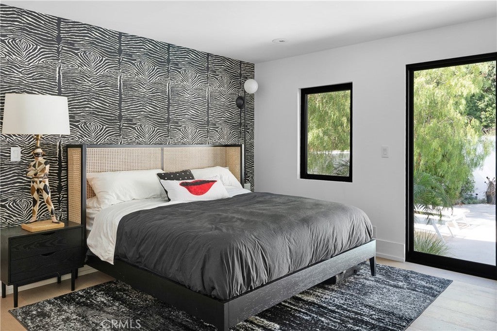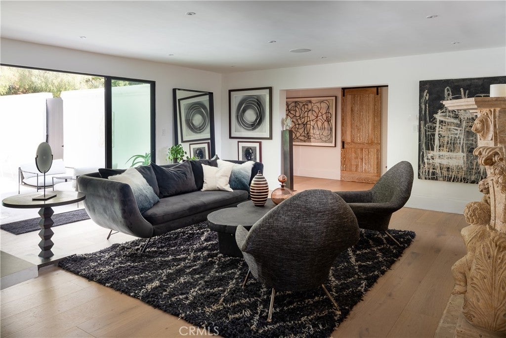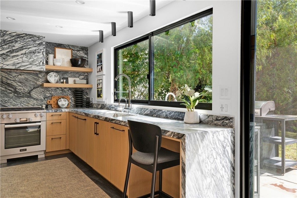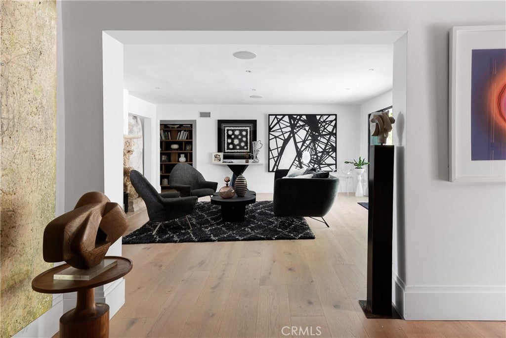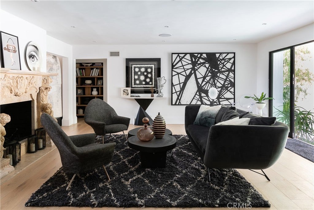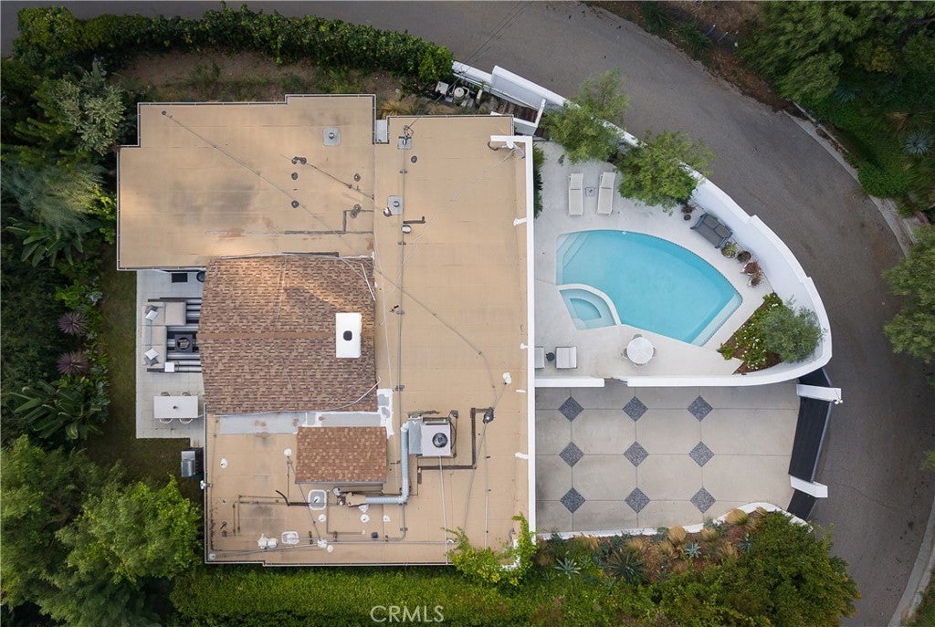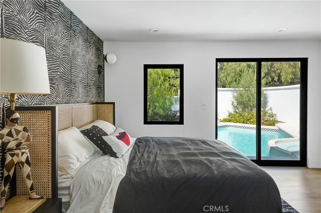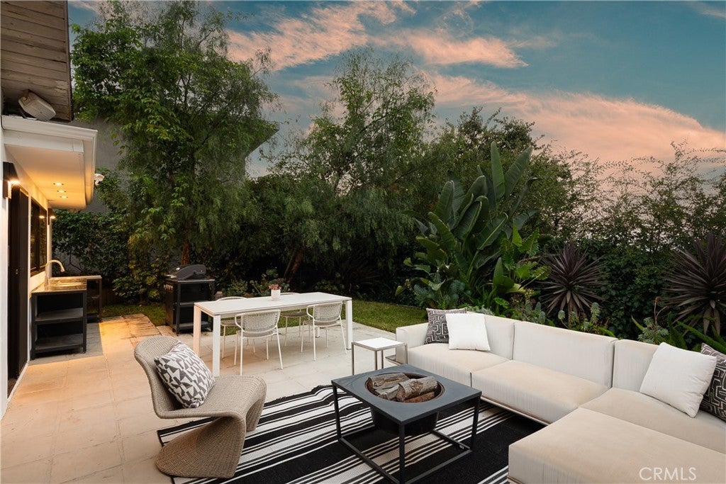 Perched on a serene cul-de-sac just above Sunset Boulevard in the coveted Bird Streets, this meticulously redesigned single-story residence blends high-end luxury with effortless indoor/outdoor living. Spanning approximately 2,300 sq ft on an expansive 8,400+ sq ft lot, the home features 3 bedrooms, 4 bathrooms, and a versatile den, all thoughtfully laid out for comfort and entertaining. Inside, a sun-filled open floor plan adorned with high end finishes, custom Parisian wall coverings, recessed lighting, and designer details throughout. The gourmet kitchen boasts top-of-the-line Miele appliances and sleek marble countertops, flowing seamlessly into the formal living room with an elegant statement fireplace. The spacious primary suite offers a custom closet, spa-like bathroom with a walk-in steam shower, spa tub, sauna, and dual custom vanities. Each bathroom has been exquisitely upgraded with luxurious materials and finishes. Outdoors, the beautifully landscaped flat backyard features a sparkling pool and patio space perfect for entertaining, all set against tranquil treetop canyon views. Additional highlights include state-of-the-art surround sound, security camera system, and newly painted interiors. Rare for the area, the property includes a gated private driveway with 4 parking spaces. Ideally located just minutes from the Sunset Strip, Soho House, Sunset Plaza, and Beverly Hills, this Hollywood Hills gem offers style, privacy, and convenience in one stunning package.