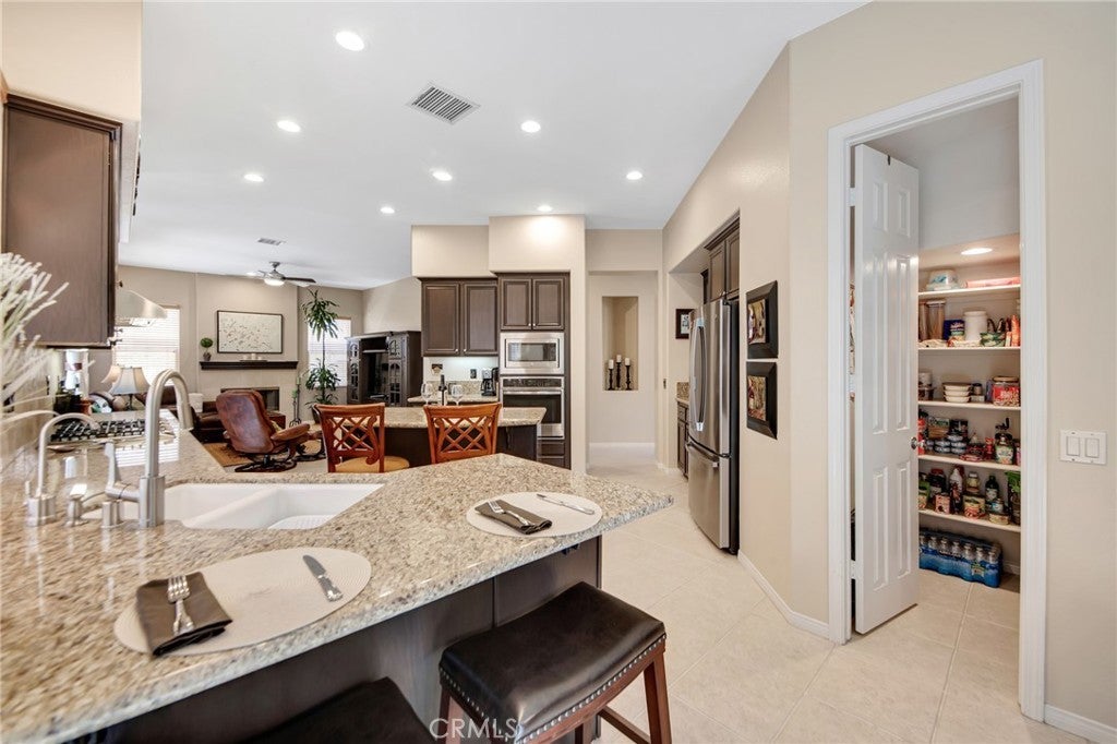 Breakfast Bar, Ceiling Fan(s), Separate/Formal Dining Room, Eat-in Kitchen, Granite Counters, High Ceilings, Open Floorplan, Pantry, Recessed Lighting, Bedroom on Main Level, Primary Suite, Walk-In Pantry, Walk-In Closet(s), Suspended Ceiling(s), Wired for Sound