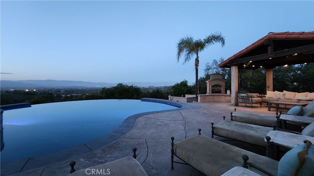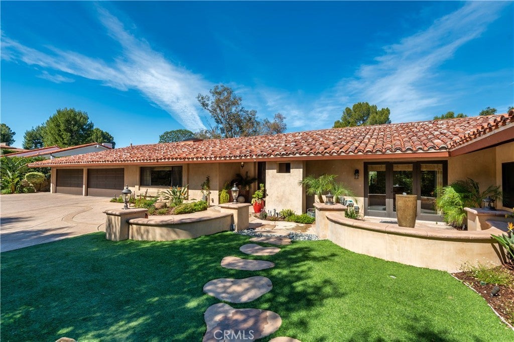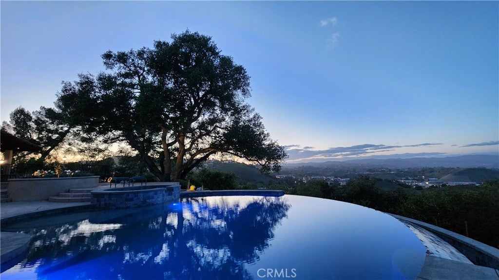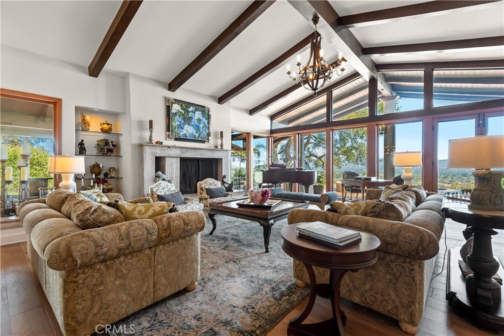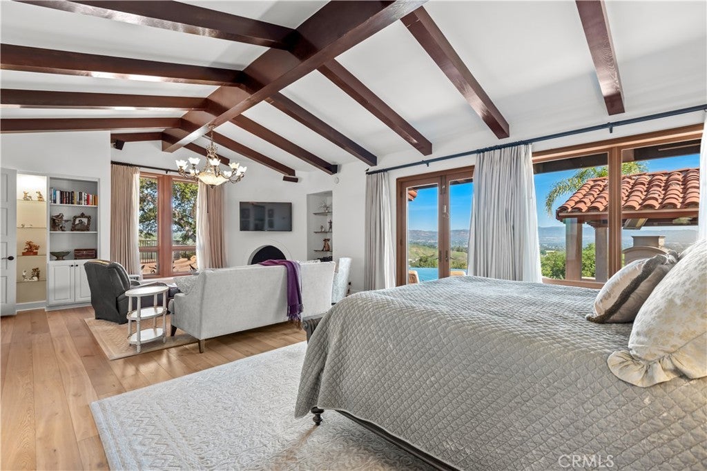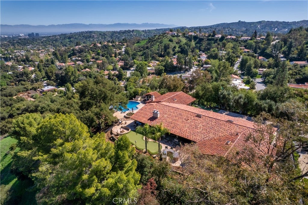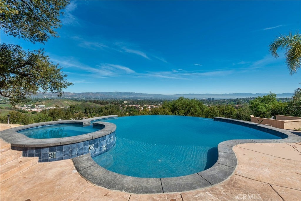 A very rare find! First time on the market in 24 years, this privately gated, nicely upgraded one-story home features panoramic views and a big private lot. Amenities include a spacious chef's kitchen with two islands, freestanding Viking Range and a sunny breakfast room, plus a large great room with vaulted, open beam ceilings, stone fireplace, & walls of glass capturing the expansive views, with an adjoining, open dining room for casual entertaining, and two private offices. The big primary suite includes a fireplace, stone bath with walk-in shower & soaking tub, dual vanities, and a large walk-in closet. There is also an adjoining room (second office) that could be an additional large walk-in closet if desired. Additional amenities include wood floors, stone countertops and big picture windows that fill the home with natural light. The lushly landscaped grounds include a superb, just remodeled, infinity edge swimmers pool with spa, two covered patios, full barbecue center with refrigerator, stone countertops & seating, outdoor fireplace, and beautiful mature oak trees. With a prime location near several public and private schools, just minutes from Calabasas Park Lake and The Commons shopping center, this custom home has much to offer.