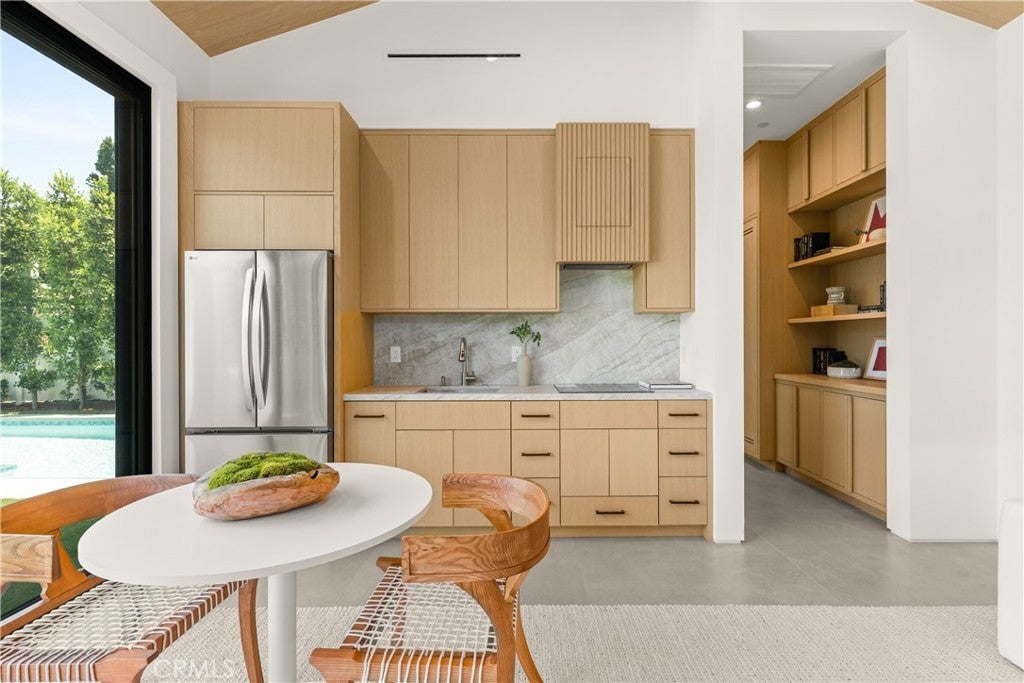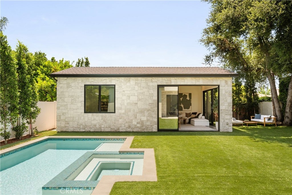 Newly constructed residence defines elevated contemporary living, offering 5 beds and 5 full baths in the main house, along with a detached 1 bed and 1 bath ADU, ideal for guests, extended family, or flexible use. Walls of glass and an open-concept layout fill the home with natural light, creating a warm and inviting atmosphere. At the heart of the home, the designer chef’s kitchen is a true showpiece, featuring top-of-the-line Thermador appliances, a dramatic waterfall island and dual wine refrigerators for effortless entertaining. The kitchen flows into the expansive living room, which opens to the backyard and central courtyard through two oversized sliding glass doors- seamlessly connecting indoor and outdoor living spaces. The main level also includes a formal dining room, a state-of-the-art home theater, an ensuite bedroom, mudroom and a stylish powder room. Upstairs, four spacious bedrooms include a luxurious primary suite with a private balcony, custom walk-in closet and spa-style bath complete with soaking tub, rainfall shower and double vanity. A convenient laundry room and two additional full bathrooms complete the second level. The fully detached ADU offers a private entrance and includes a spacious living room with kitchenette, full bathroom and one bedroom—perfect as a guest house, office, gym, or income-producing unit. The backyard is your personal retreat, complete with a sparkling pool and spa, outdoor kitchen, low-maintenance turf and ample patio space for dining and lounging. Additional highlights include soaring ceilings, a whole-home smart system with integrated speakers, a robust security system, sleek two-car garage with EV charging capabilities. Ideally located near Westfield Fashion Square, Ventura Boulevard’s premier shopping and dining, and top private schools including Notre Dame, Harvard-Westlake and Campbell Hall.