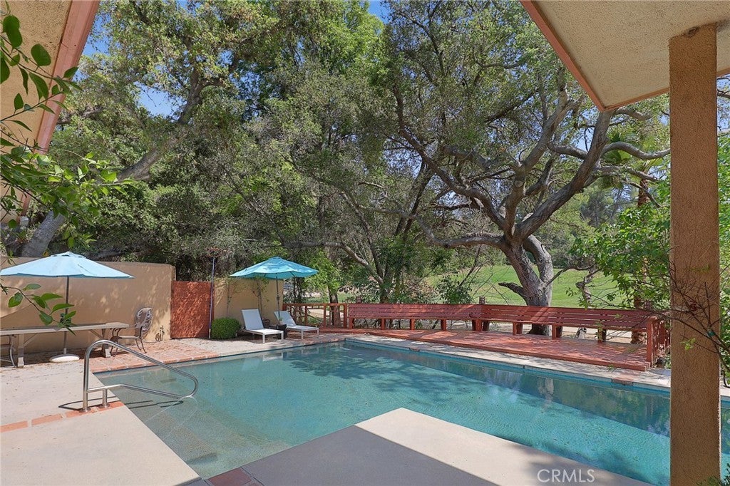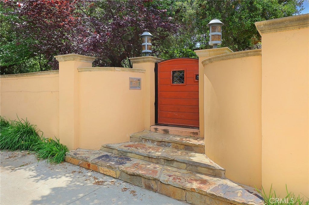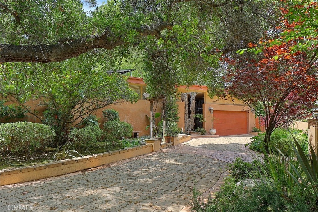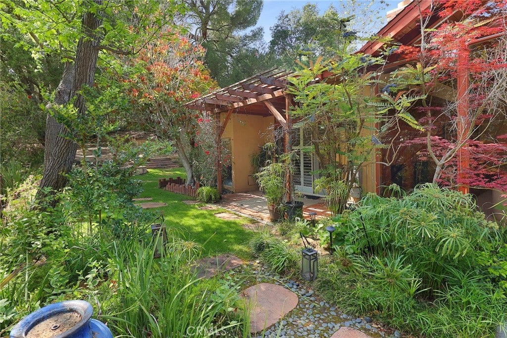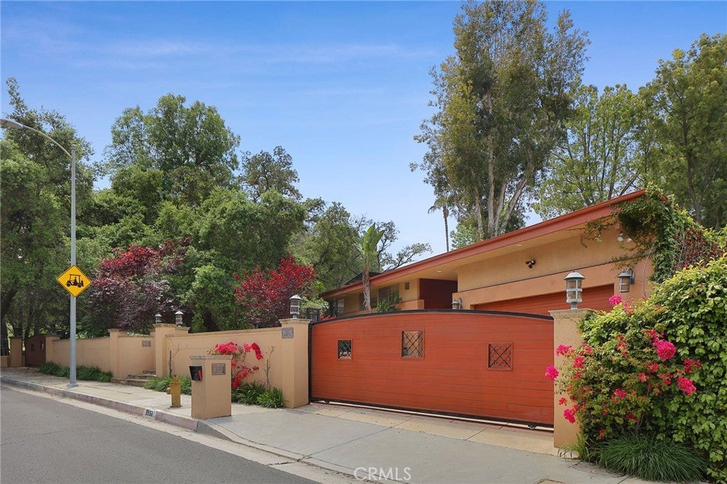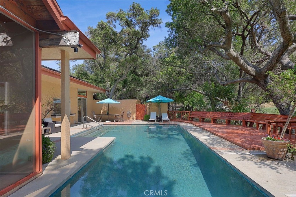 Gated Custom Built, Single story architectural mid century estate bordering Braemar Golf Course on three sides for ultimate privacy. Excudes Hollywood vibe. Located on the Quiet part of Vanalden, 2 ½ miles S. of Ventura. Solar Panels recently installed. Enclosed courtyard entry features captivating water fountain. All major rooms include wall to wall glass doors and windows taking advantage of the views of lush landscaping, towering trees, golf course, and pool connecting you to nature. In addition, high ceilings in every room. Living, Family and Primary bedroom include their own fireplaces. Family Room includes a built-in library, cabinets and wet bar. Sandblasted high beamed wood ceilings flows from exterior to interior. Updated kitchen with quartz counter tops, upgraded appliances and lots of cabinets. Sensational rear yard highlighting Redwood deck providing a picturesque view of the golf course, great for entertaining or enjoying the natural surroundings. Upgraded Salt water, Pebble Tec pool. Lots of yard space with possible room for ADU. Hiking trails nearby. This masterpiece designed home with its harmonious design, luxurious features and connection to nature is a one of a kind coveted retreat. Room for multiple cars behind the gates. Seller will entertain financing!