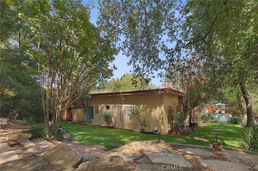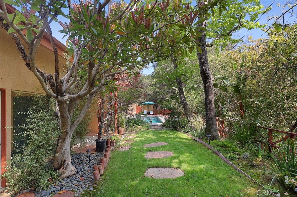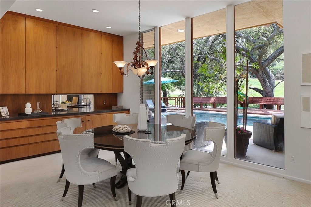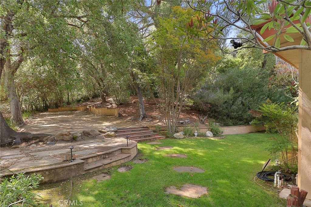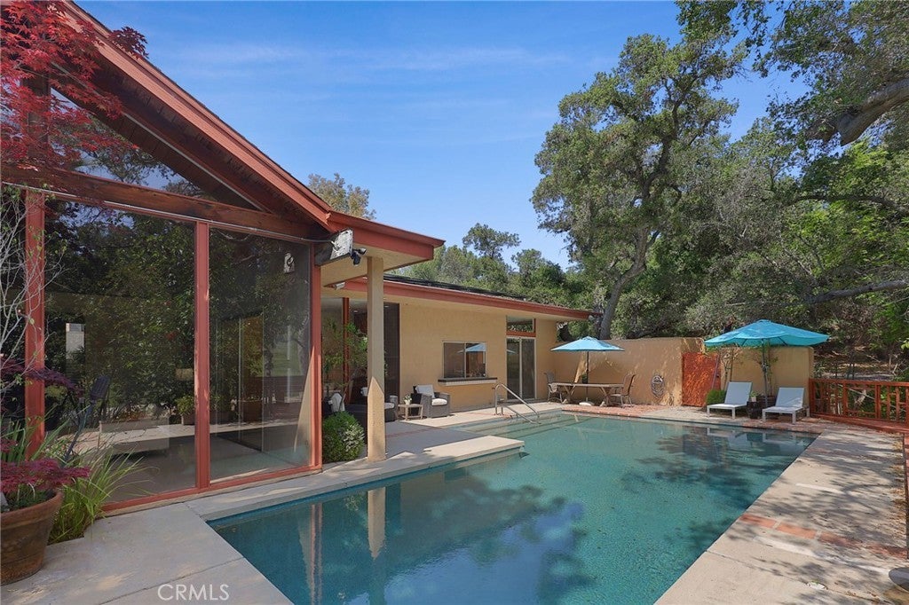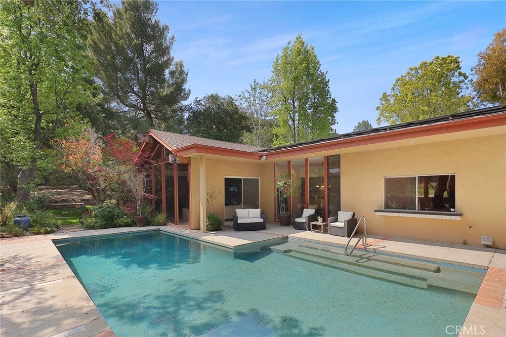 Gated Custom Built, Single story architectural mid century estate bordering Braemar Golf Course on three sides for ultimate privacy. Excudes Hollywood vibe. Located on the Quiet part of Vanalden, 2 ½ miles S. of Ventura. Solar Panels recently installed. Enclosed courtyard entry features captivating water fountain. All major rooms include wall to wall glass doors and windows taking advantage of the views of lush landscaping, towering trees, golf course, and pool connecting you to nature. In addition, high ceilings in every room. Living, Family and Primary bedroom include their own fireplaces. Family Room includes a built-in library, cabinets and wet bar. Sandblasted high beamed wood ceilings flows from exterior to interior. Updated kitchen with quartz counter tops, upgraded appliances and lots of cabinets. Sensational rear yard highlighting Redwood deck providing a picturesque view of the golf course, great for entertaining or enjoying the natural surroundings. Upgraded Salt water, Pebble Tec pool. Lots of yard space with possible room for ADU. Hiking trails nearby. This masterpiece designed home with its harmonious design, luxurious features and connection to nature is a one of a kind coveted retreat. Room for multiple cars behind the gates. Seller will entertain financing!