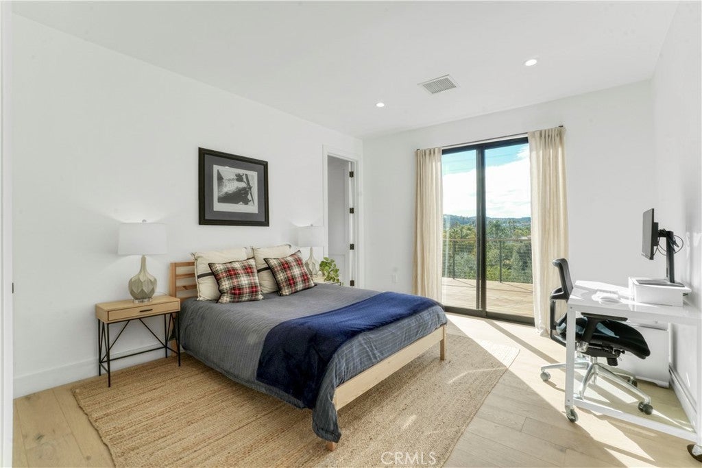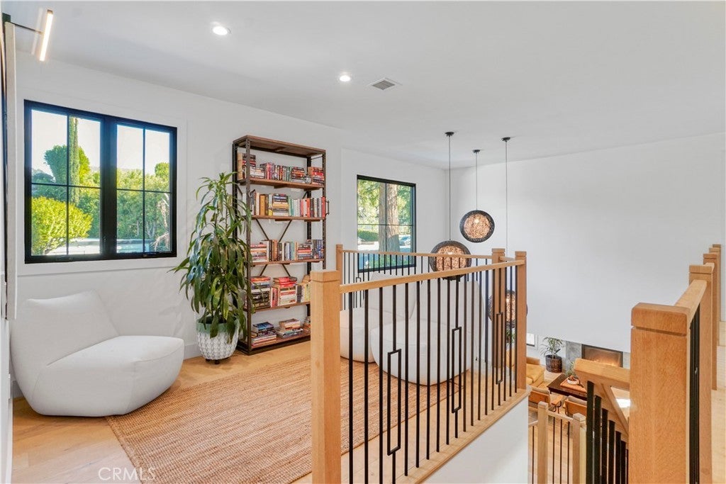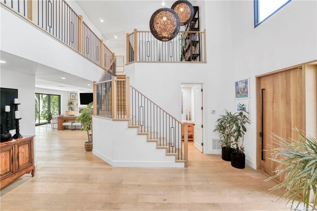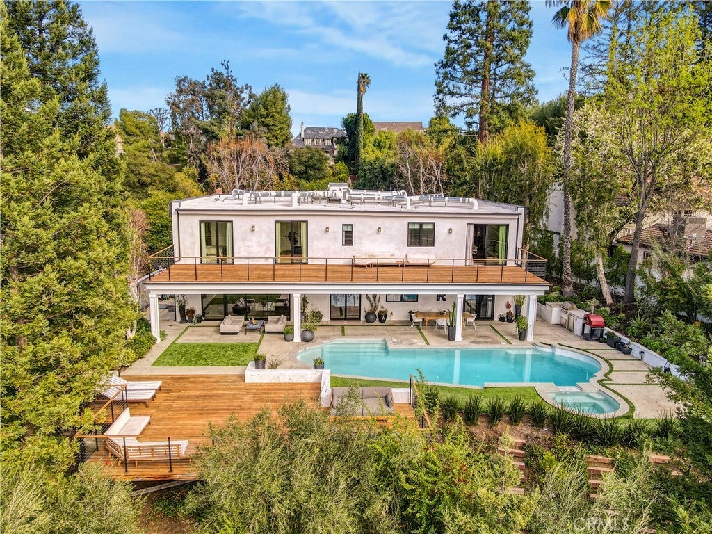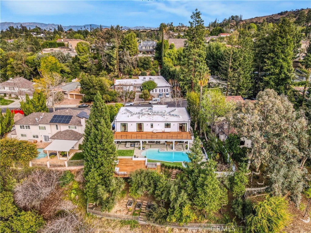 Nestled in the quiet and serene neighborhood of Encino Hills and surrounded by mature trees, this recently and completely renovated home offers stunning views and a thoughtfully designed floor plan featuring five spacious en-suite bedrooms, a powder room and library that could also function as a playroom. The expansive primary suite includes a large walk-in closet and a peaceful seating area, creating a true retreat. A beautiful wooden deck on the second floor, extending across the length of the house, provides a panoramic viewing point. The gourmet kitchen boasts high-end stainless steel appliances and custom cabinetry, complemented by abundant natural light throughout the home. Set on nearly half an acre, the property features a sparkling pool and jacuzzi—both with new tile and plaster—a dedicated dog run, fruit trees, and a vegetable garden. The yard is thoughtfully divided into several seating areas, perfect for relaxation and entertaining. Additional highlights include a three-car garage, integrated smart home technology for convenience and security, and a community tennis court. Elegant interior finishes evoke a relaxed yet refined atmosphere. This home is perfect for entertaining or simply relaxing and enjoying the serene surroundings.