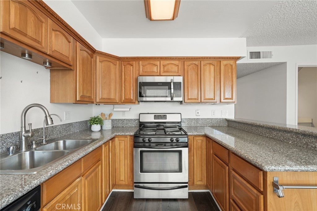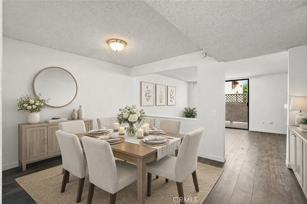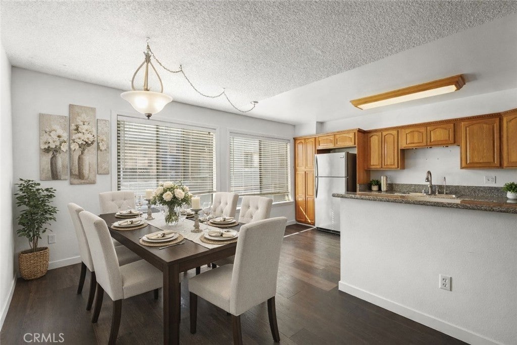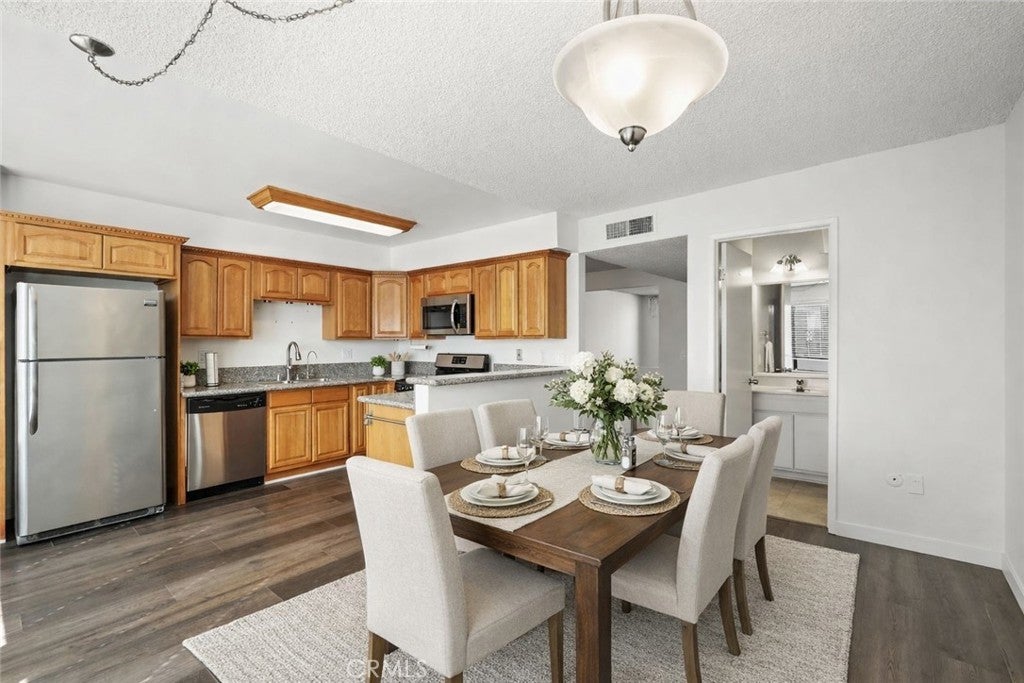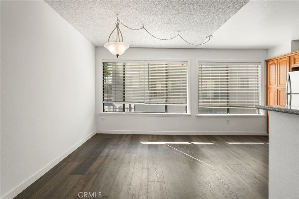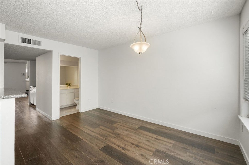Welcome to this spacious two-story condo in the heart of Woodland Hills. With a practical layout and new vinyl flooring throughout, this home offers comfort, functionality, and room to make it your own. The main level features two separate dining areas, a generously sized kitchen with ample counter space and modern appliances, and a cozy living room with a fireplace — perfect for relaxing evenings at home. Just off the living area, sliding glass doors open to a private enclosed patio, ideal for enjoying your morning coffee, entertaining guests, or getting some fresh air. Upstairs, you’ll find two well-sized bedrooms, each with its own walk-in closet. One bedroom includes an ensuite bathroom, offering privacy and convenience. The laundry area is tucked into a hallway closet with hookups for a side-by-side washer and dryer. Additional highlights include central air and heat, and two assigned parking spots in a gated garage. The community features a pool, spa, and landscaped courtyards, all within a secure and well-maintained complex. Conveniently located near Warner Center, Westfield Topanga, The Village, restaurants, cafes, and with easy access to the 101 and 118 freeways — this condo offers space, comfort, and a great Woodland Hills location.