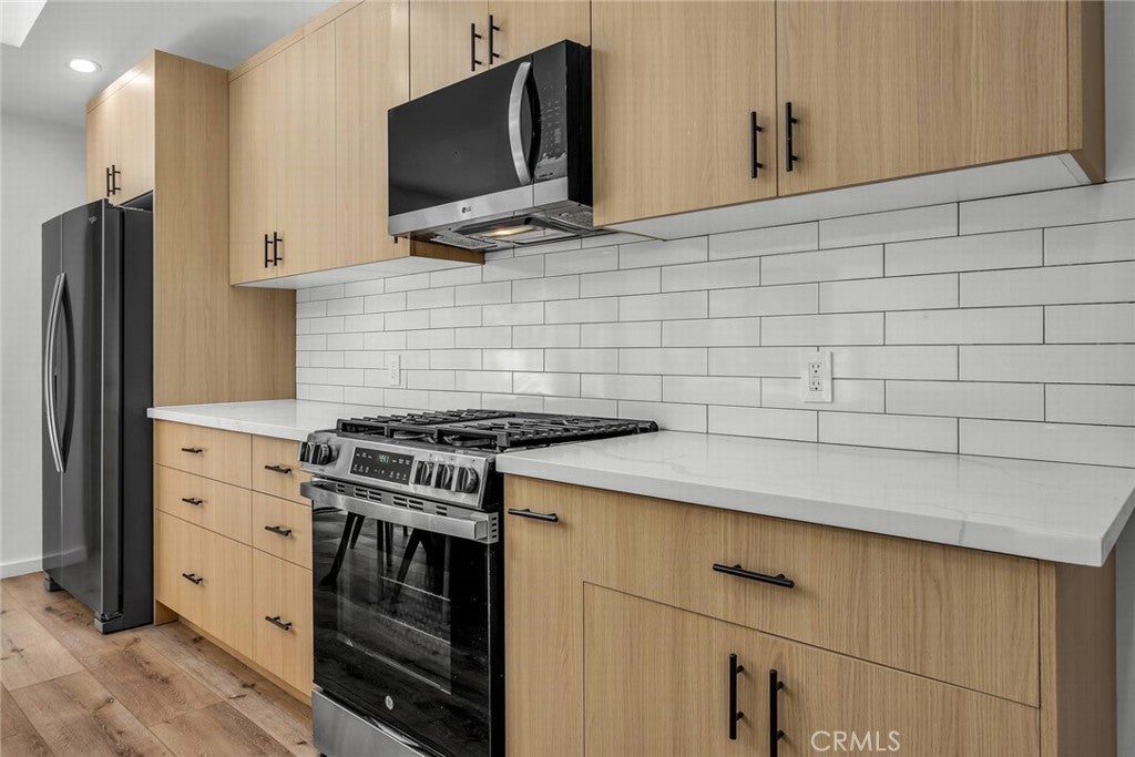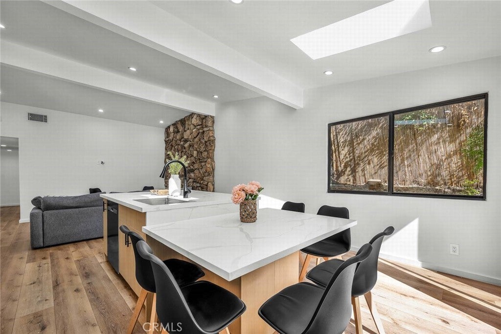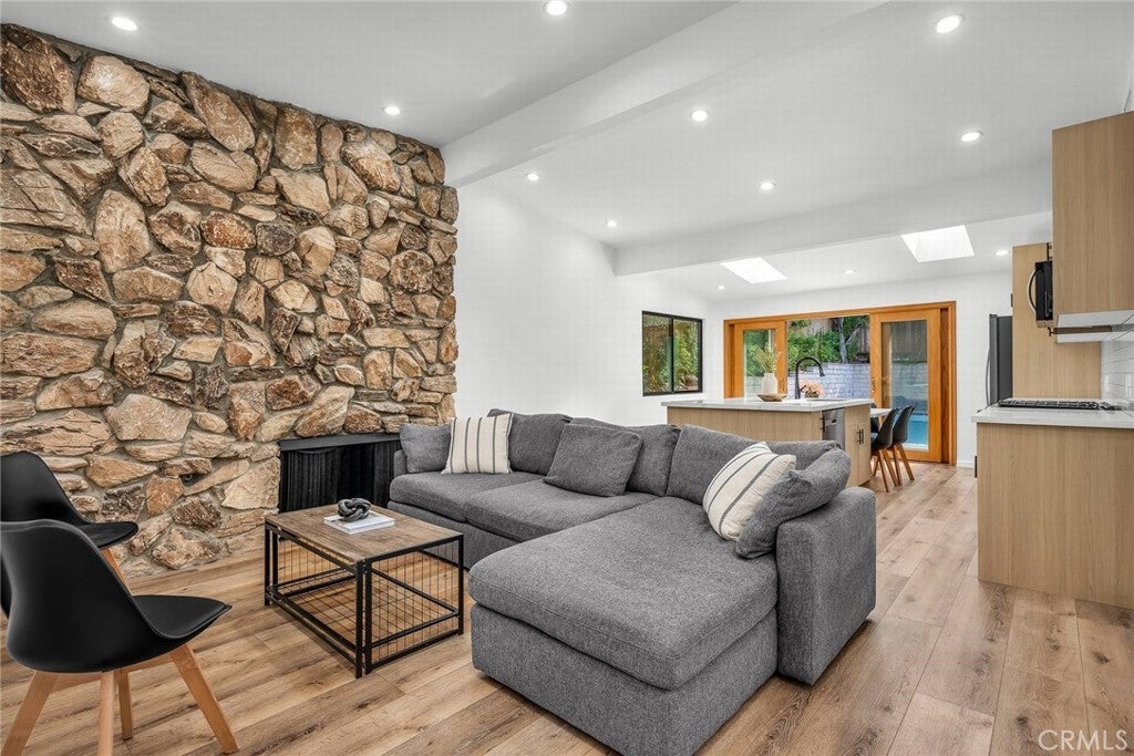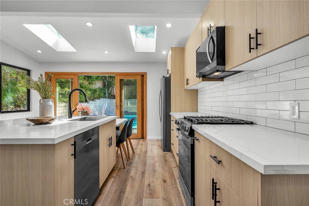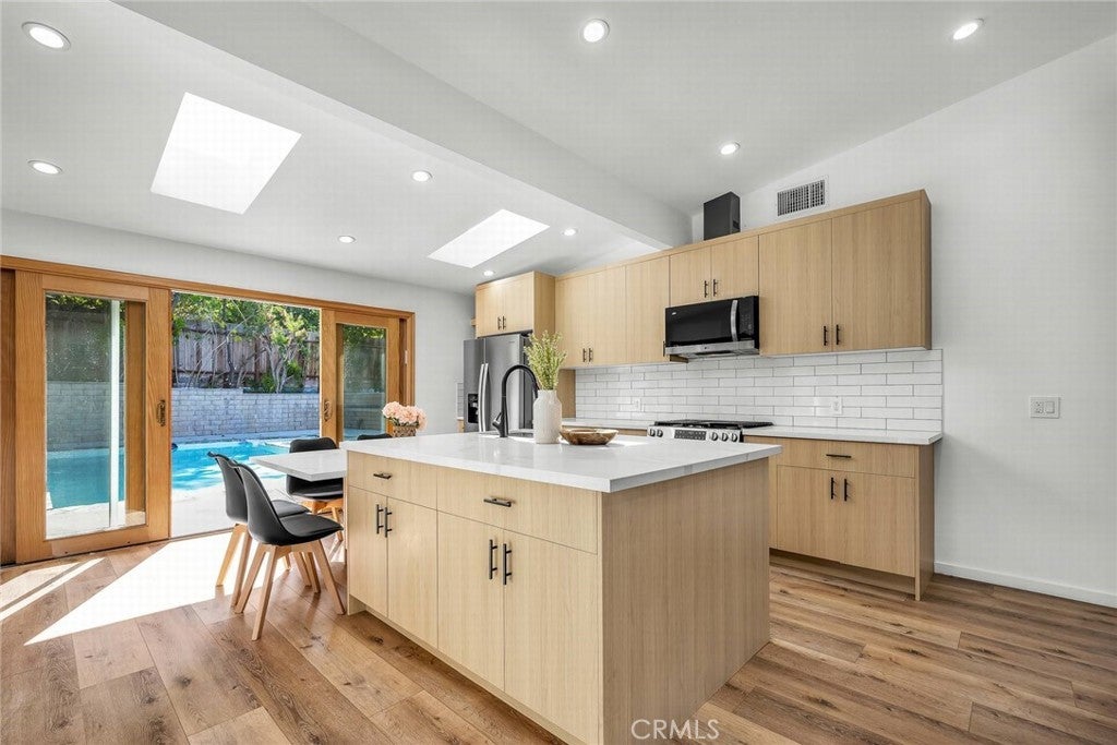 Step into this beautifully remodeled single-story home in desirable Woodland Hills, where modern style meets everyday comfort. This light-filled residence offers 3 spacious bedrooms and 2 beautifully updated bathrooms, thoughtfully designed with sleek finishes and an inviting open flow. The contemporary kitchen features quartz countertops, stainless steel appliances, and clean-lined cabinetry, opening to a warm living area with views of the backyard. Enjoy wide-plank wood flooring throughout, recessed lighting, and a convenient in-home laundry nook with washer and dryer. Outside, a sparkling pool creates the perfect setting for relaxation or entertaining under the California sun and stars. Conveniently located near shopping, dining, and Ventura Blvs., this Woodland Hills gem blends tranquility, functionality, and modern charm.