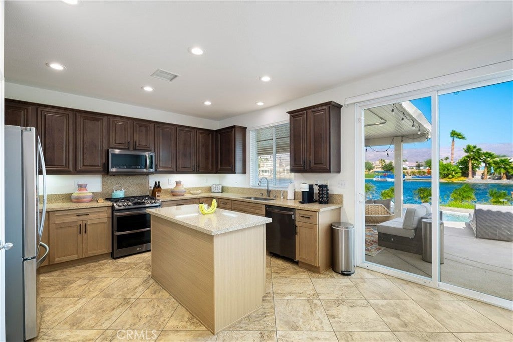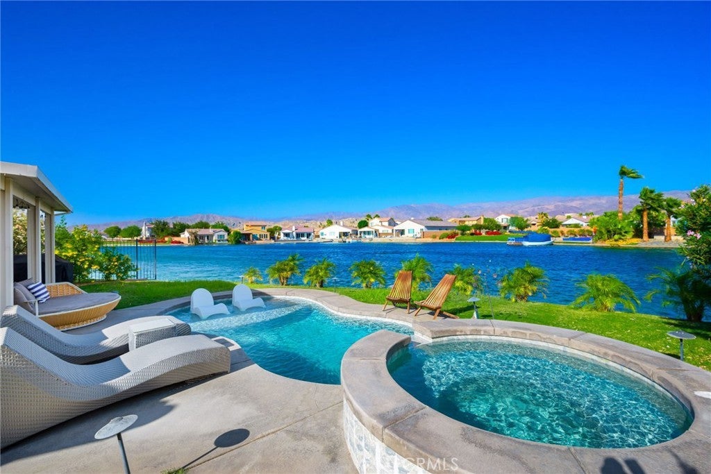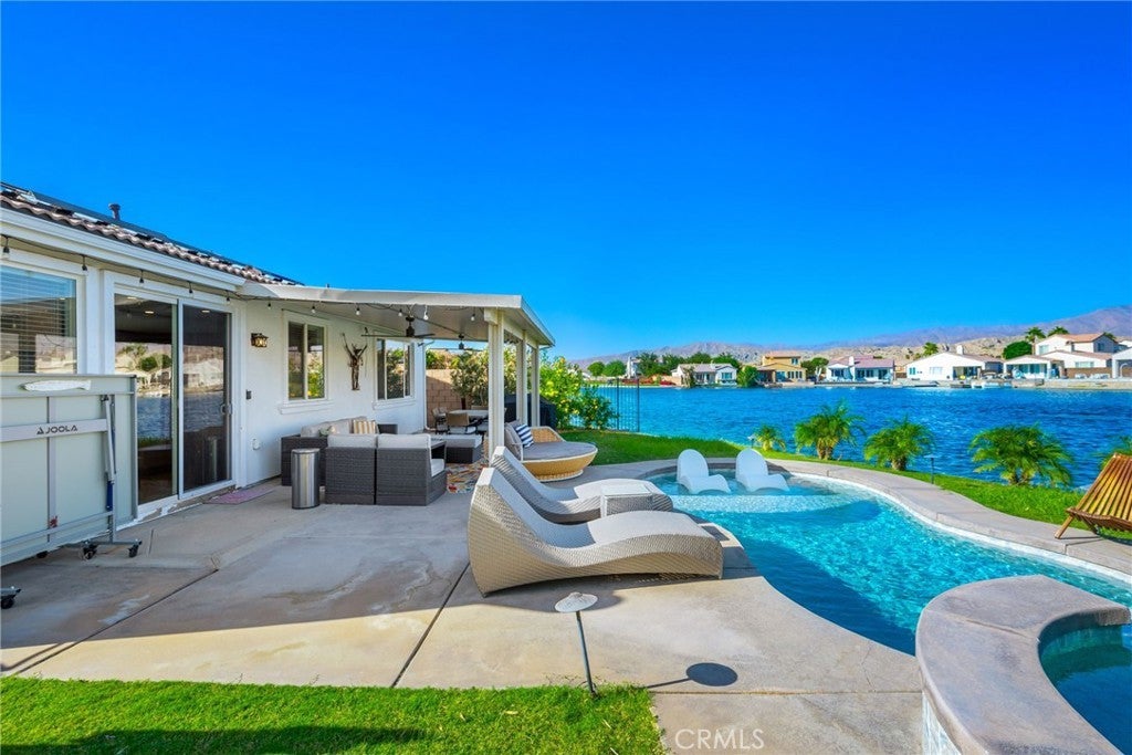 WOW... Lowest Priced Lake Front Home!Terra Lago Lake One Story Detached Pool/Spa Home by Woodside, Former Model. Featuring 4 bedroom, 3 beautifully updated baths with East Facing Leisure view of Lake, Mountains and Terra Lago's Signature bridge. Updated Chef's Kitchen with center island, quartz counter tops, Newer Stainless Steel appliances, Fridge Included. Spacious Great room, dining area. The primary bedroom offers Lake, Mountain view! Walk in closet, the large ensuite primary bath offers updated vanity with dual sink, separate tub and shower. 3 Guest Bedrooms all with walk in closets. Built in speakers. Sep outside to the private large entertainers back yard with grass area, salt water pool & spa, Recent upgrades include newer laminated flooring and paint throughout, Solar, tankless water heater, newer AC System! Aluma wood patio cover with misters. Great Location, walk to Clubhouse, easy access to Avenue 43 gate for shopping, dining, entertainment, nearby New Acrisure Arena for awesome concert events, Ice Hockey and more! Terra Lago allows Short Term Rentals. Resort Style Living At Its BEST!!!