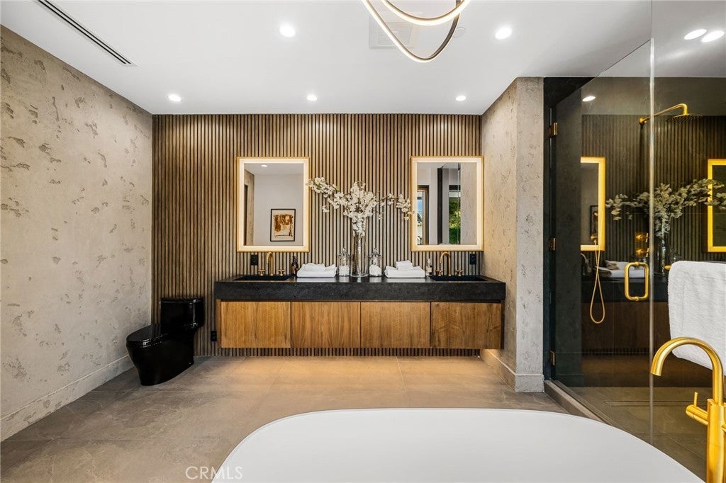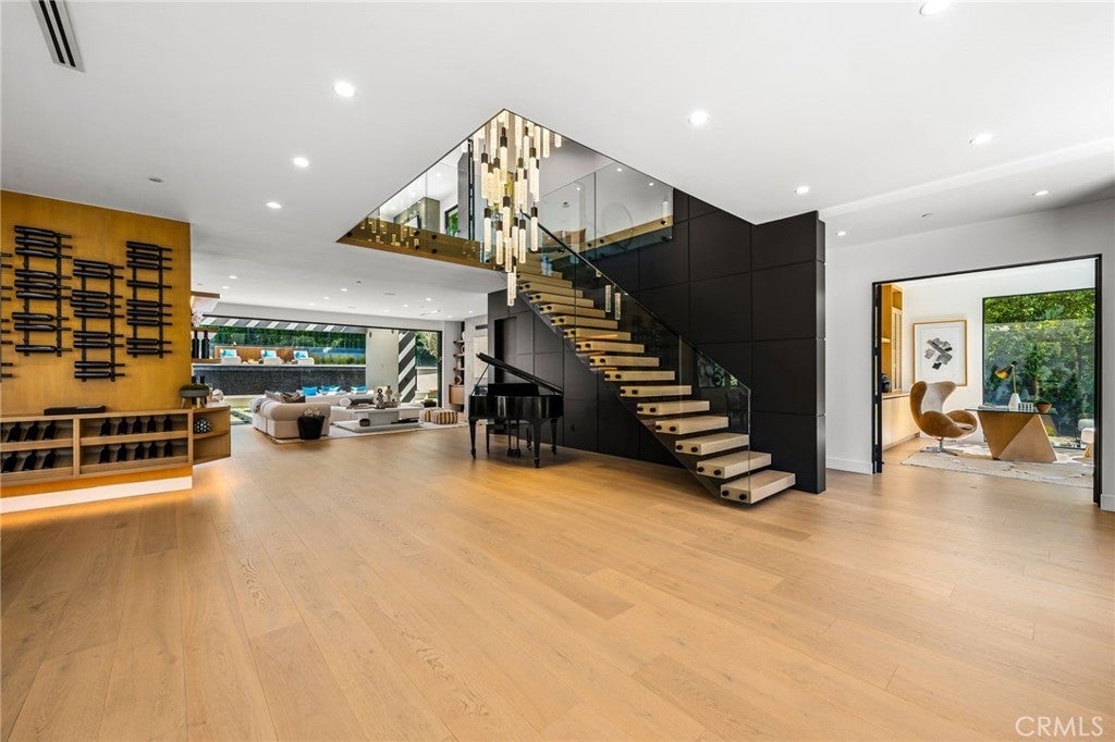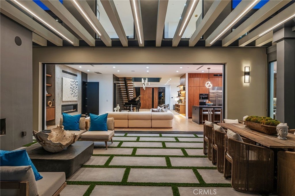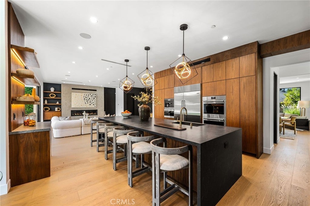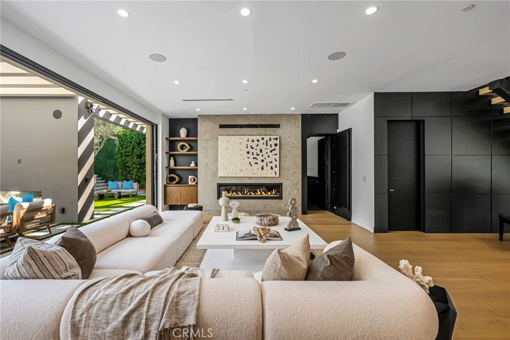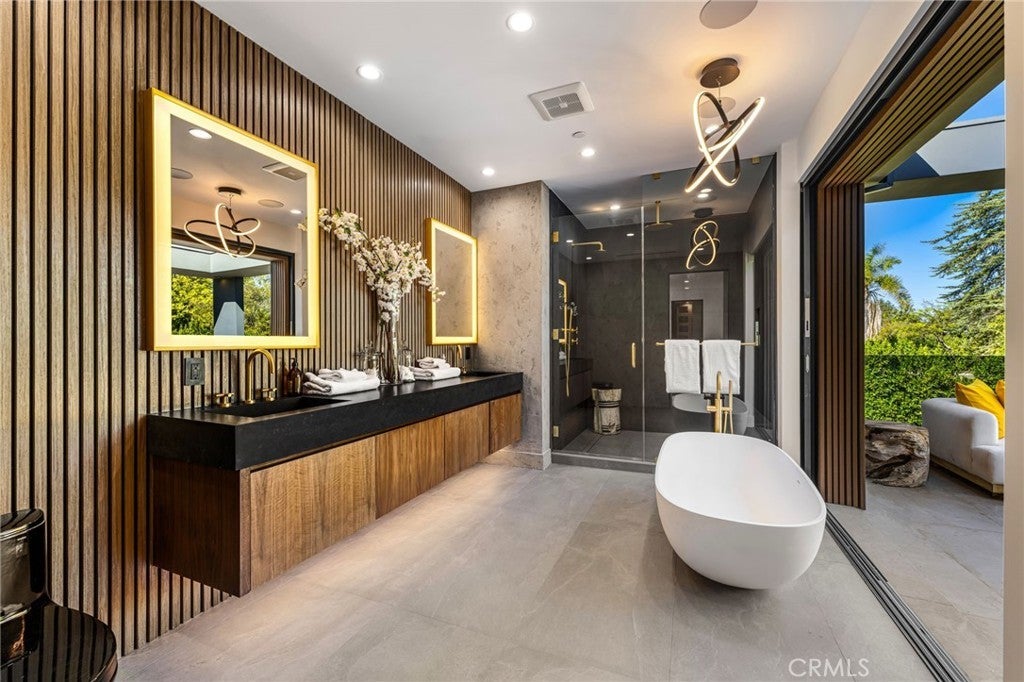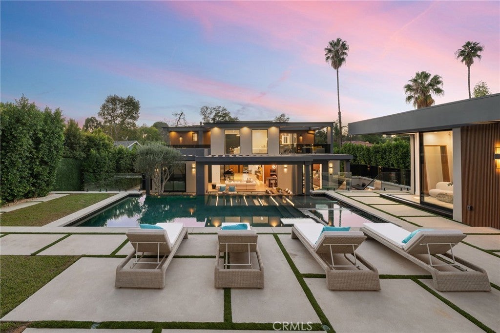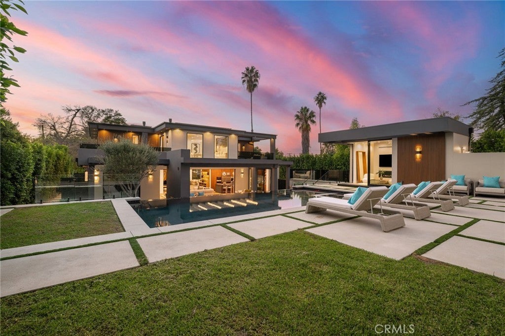 Stunning Private Estate South of the Boulevard located in one of the most desirable neighborhoods in Tarzana, this exceptional private gated estate offers the perfect blend of modern design and luxurious living. Set on beautifully landscaped grounds, the home boasts 5 bedrooms, 7 bathrooms, a study, a media room, and an array of high-end amenities that make it an entertainer's dream. The open floor plan creates a seamless flow between the living spaces, making it ideal for both intimate gatherings and large-scale entertaining. The chef’s kitchen is a culinary masterpiece, featuring Wolf and Sub-Zero appliances, a large center island, quartz countertops, a breakfast area, and a Miele coffee maker. The romantic primary suite serves as a serene retreat with a cozy fireplace, a spa-like bathroom, a large walk-in closet, and two private balconies. Additional highlights include 6 fireplaces throughout the home, a Crestron smart home system, Fleetwood pocket doors, integrated indoor and outdoor speaker systems, and security cameras. The exterior is just as impressive, with lush landscaping, a large reverse infinity pool and spa, a pool house, and a fully equipped outdoor kitchen with a 5-burner stove, BBQ, and beverage refrigerator. A covered patio with dual fireplaces is perfect for year-round entertaining and relaxation. For active pursuits, there’s a lighted sport court and a putting green, ensuring there’s something for everyone. Other standout features include a detached garage with ample parking space for luxury vehicles, RVs, and tour buses, as well as room for 10+ additional cars. The property is fully equipped with solar panels and underground utilities for enhanced sustainability. This home offers unparalleled privacy, comfort, and style, making it an ideal sanctuary for those seeking the ultimate in luxury living.