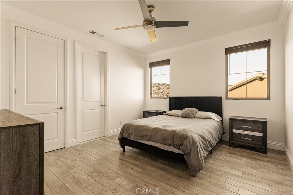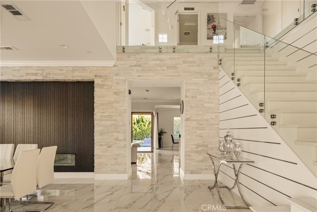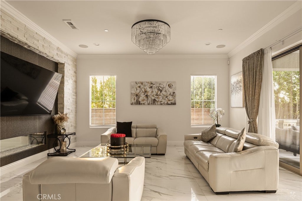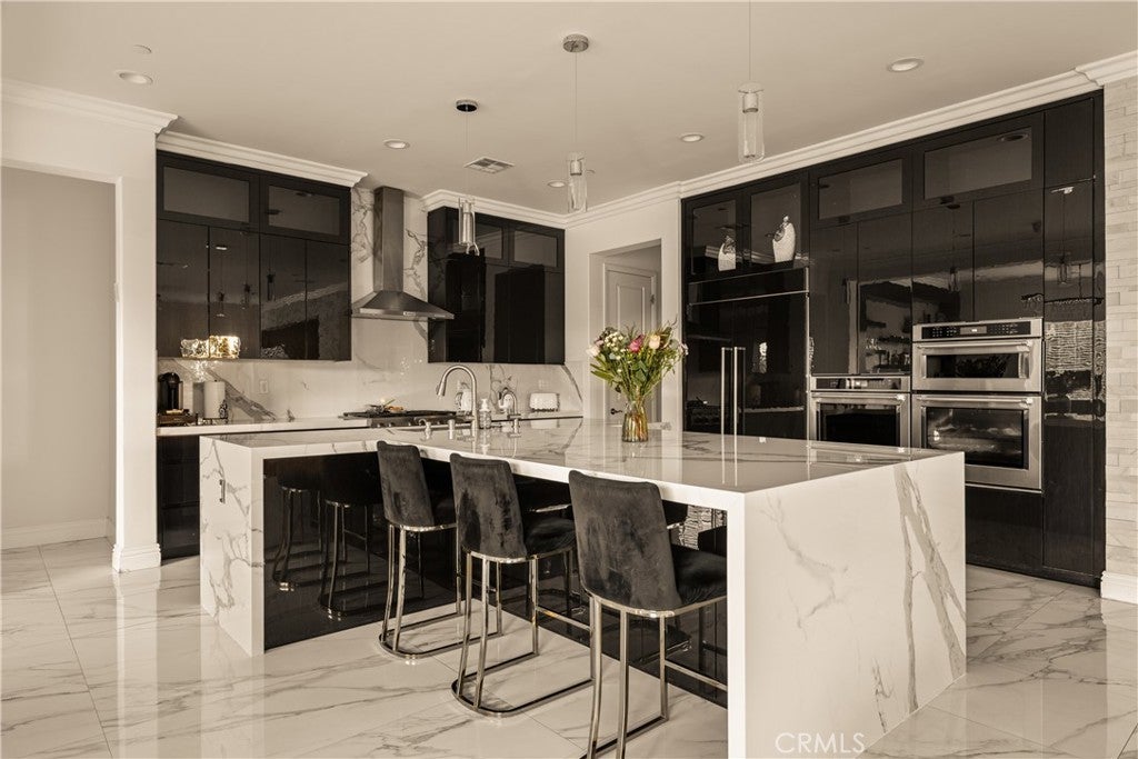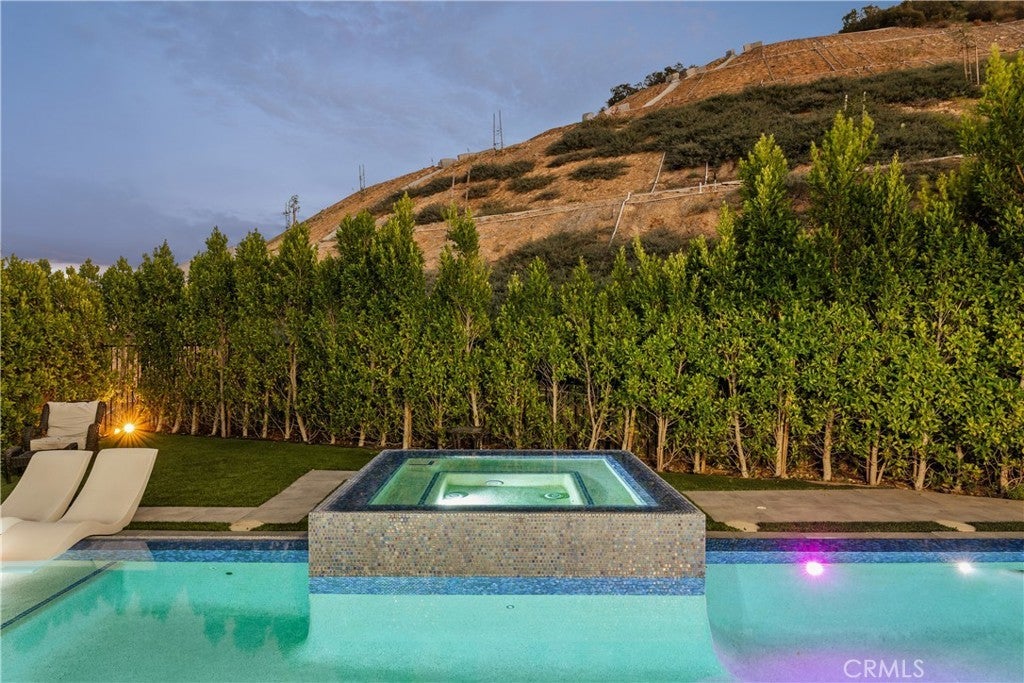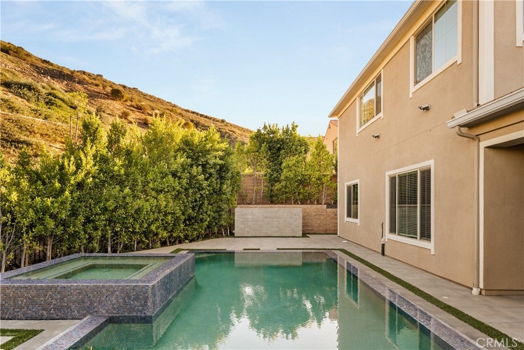 Welcome to this exquisite custom estate in the prestigious Sterling Ranch community of West Hills. Set on a quiet street, this modern masterpiece offers over 4,000 sq ft of refined living space with 5 bedrooms and 5.5 bathrooms on an expansive 11,006 sq ft lot. Designed for effortless California living, the open-concept floor plan features soaring ceilings, sleek porcelain tile floors, and walls of glass that flood the interiors with natural light. The spacious family room centers around a striking fireplace and pocket sliders that open to the backyard, creating a seamless indoor-outdoor flow. The gourmet kitchen is a showstopper, complete with porcelain countertops, premium KitchenAid appliances, a peninsula island with seating, a walk-in pantry, and an adjoining wet bar and dining area perfect for entertaining. A formal dining room adds elegance for special occasions. An attached ADU (or two-bedroom suite) with a private bath offers versatility for guests, family, or a home office. Upstairs, four en-suite bedrooms include a bright loft for lounging or work. The luxurious primary suite features dual walk-in closets, a vanity area, and a spa-inspired bathroom with dual vanities, a soaking tub, two showers, and private water closets. Step outside to your own resort-style oasis featuring a covered patio, Pebble Tec zero-edge pool and spa, built-in BBQ, pizza oven, and refrigerator—surrounded by lush landscaping and evening lighting for perfect ambiance. Conveniently located near top-rated schools, scenic hiking trails, and premier shopping and dining at The Village, Calabasas Commons, and the Fallbrook Center, with easy freeway access to Malibu’s beaches and Warner Center.