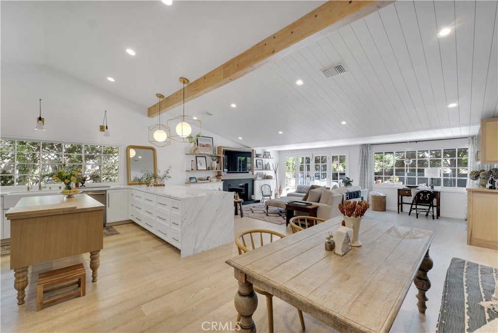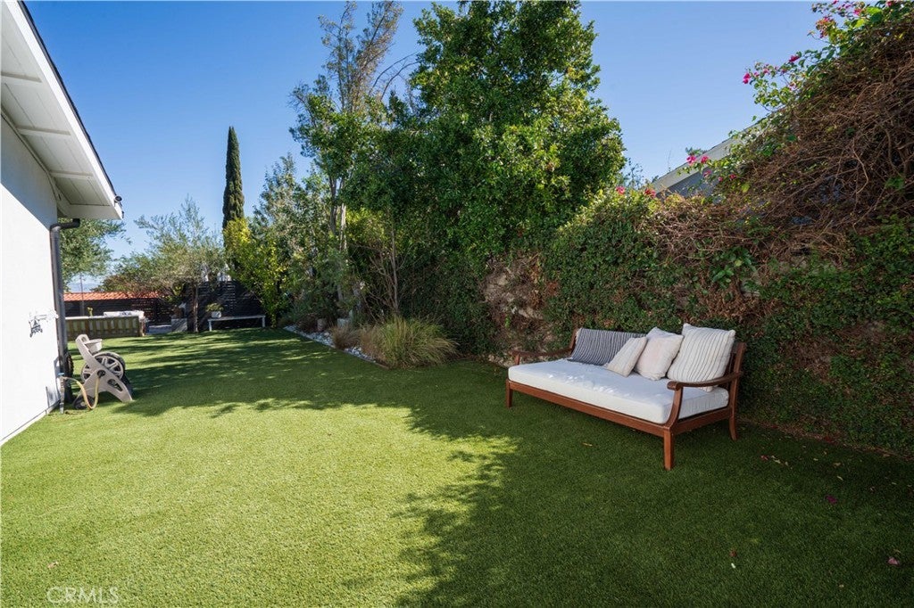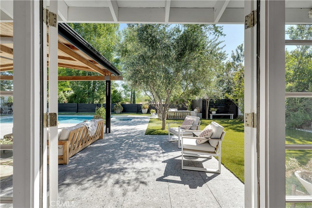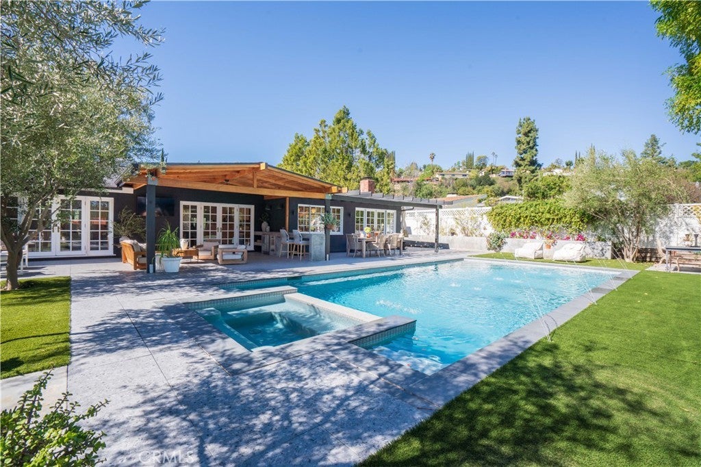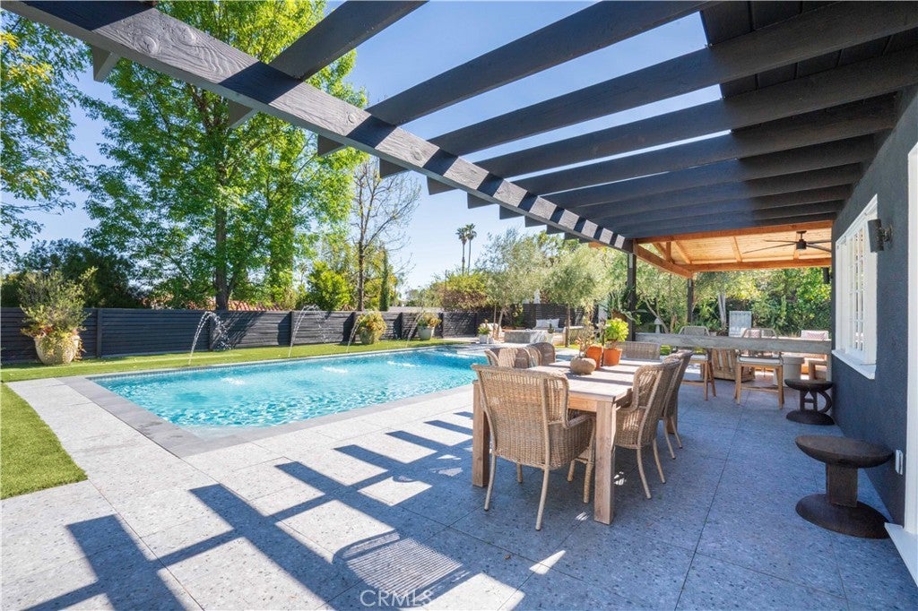 Stunning Mid-Century one story ranch seamlessly blends timeless charm with modern elegance. This is an interior designer’s home, every detail of this home has been carefully curated for style and functionality. A beautifully landscaped front yard sets a serene tone as you approach this 3,080-square-foot home, situated on an expansive 11,286-square-foot lot. Offering five bedrooms and four bathrooms, the layout is both spacious and versatile. The fifth bedroom and bath are privately positioned apart from the others, making it ideal for guests, extended family, or home office. The primary suite is a true retreat, featuring a walk-in closet plus an additional floor-to-ceiling closet space and French doors looking at the backyard. Its newly renovated ensuite bathroom boasts double sinks and a stunning marble shower. The additional bedrooms are generously sized, each offering ample closet space. One bedroom features a custom-built bunk bed, perfect for kids or anyone seeking a cozy, private space to read and relax. At the heart of the home, the open-concept kitchen is a chef’s dream. Designed with soaring ceilings, an exposed beam, and custom cabinetry adorned with unlacquered brass handles, this space is both elegant and practical. Premium Thermador appliances, including a six-burner stove, extensive counter space, a custom wood center island, and an inviting eat-in kitchen area. The kitchen seamlessly flows into the great room, featuring a custom fireplace surround, built-in dry bar, and French doors that open to the backyard—creating a warm and inviting atmosphere. Step outside into your private backyard retreat, where a sparkling pool with water jets, a relaxing spa, and a cozy firepit await. Multiple seating areas, a covered patio designed for outdoor dining and relaxing, and lush drought-tolerant landscaping—including stunning olive trees—make this space both breathtaking and low maintenance. This lovely backyard comes complete with an inspiring art studio and a welcoming craft corner. Located within the highly sought-after El Camino Charter School District, this exceptional property is just minutes from the freeway, Hidden Hills, Calabasas, and Warner Center. A rare blend of mid-century charm and modern luxury that must be seen to be fully appreciated.