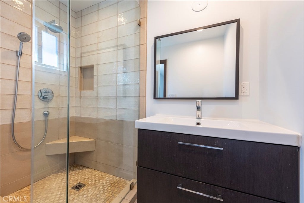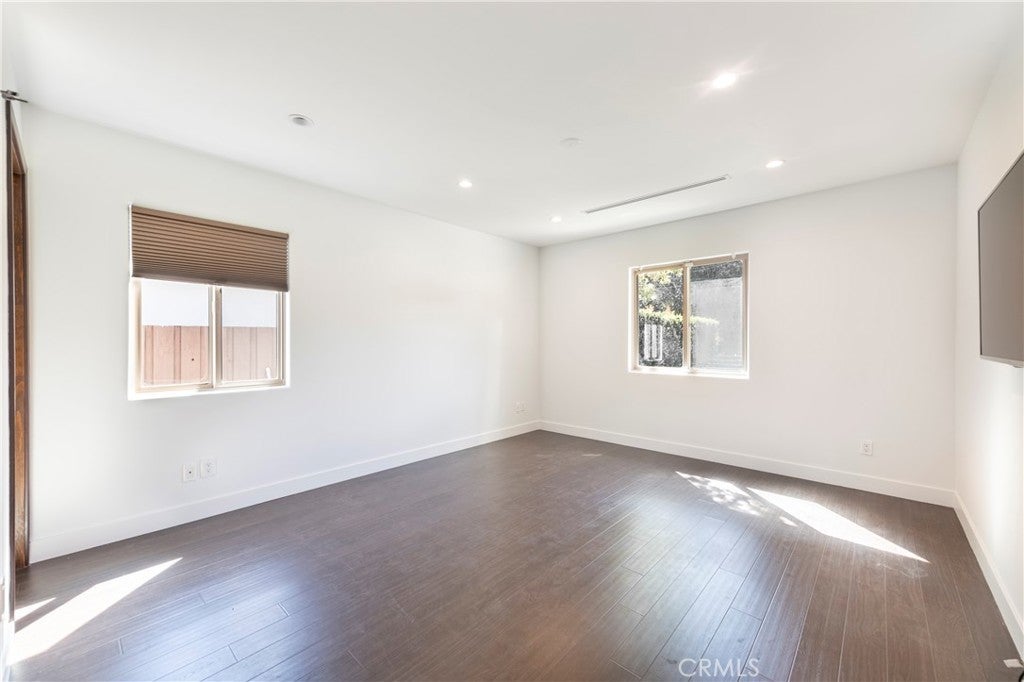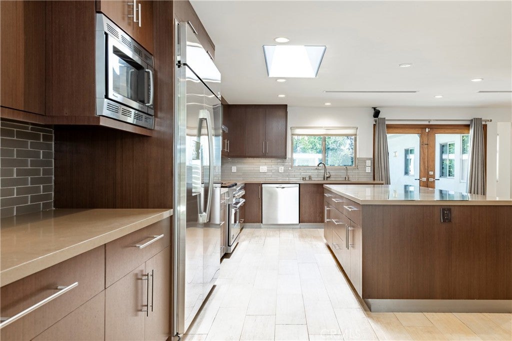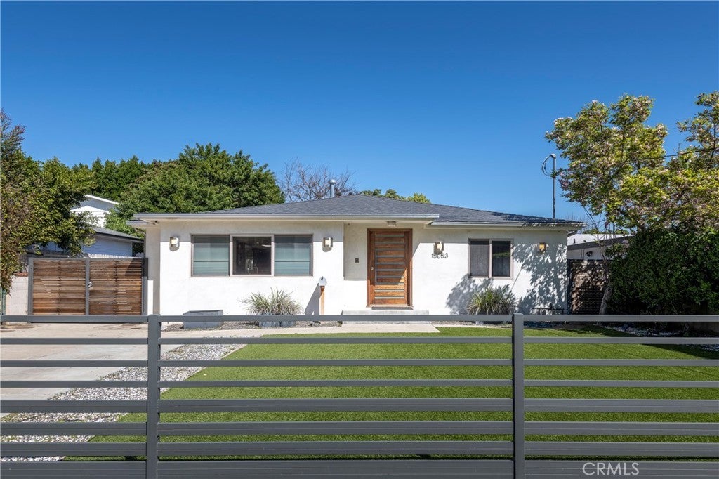 Set behind private gates in one of Sherman Oaks' most desirable south-of-the-Boulevard enclaves, this exquisitely renovated 4-bedroom, 4.5-bathroom single-level property offers the perfect blend of modern luxury and timeless design. Step inside to a sun-drenched open-concept floor plan where soaring ceilings, imported Italian porcelain tile flooring, and designer recessed lighting create an atmosphere of timeless sophistication. Beyond the living and family rooms at the heart of the home lies a gourmet chef’s kitchen, meticulously appointed with top-tier SS appliances, including a Viking Professional 6-burner range and Bosch dishwasher. Custom cabinetry with frosted glass accents, a skylight, sleek quartz countertops, classic subway tile backsplash, and an oversized center island with seating and built-in storage make this kitchen as functional as it is beautiful. The expansive primary suite is a serene retreat, complete with a cozy window seat, a professionally designed walk-in closet, and a spa-inspired ensuite bath featuring dual sinks, a jetted soaking tub, and an oversized 2-person walk-in rain shower with bench seating. Each of the three additional bedrooms is generously sized and offers its own ensuite bathroom and professionally organized closet—perfect for guests, or work-from-home flexibility. Outside, a private, beautifully landscaped backyard invites seamless indoor-outdoor living with mature fruit trees, a manicured turf lawn, and a charming patio ideal for al fresco dining and entertaining under the stars. Additional amenities include a stylish powder room, an interior laundry area with washer, dryer, and storage, 2 televisions, and dual zoned A/C. Perfectly situated minutes from the finest dining, shopping, and entertainment Sherman Oaks has to offer, with convenient access to major freeways. This is California living at its finest—schedule your private showing today.