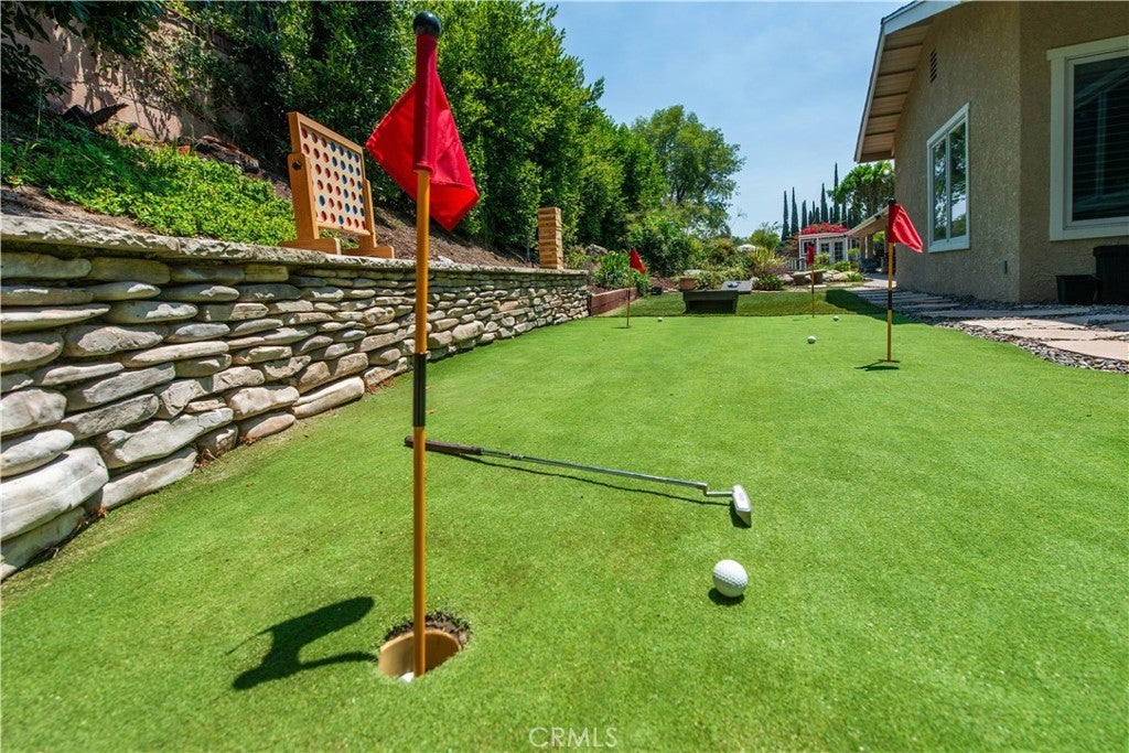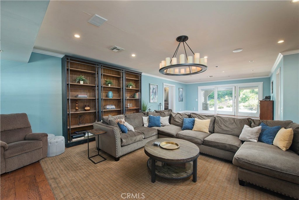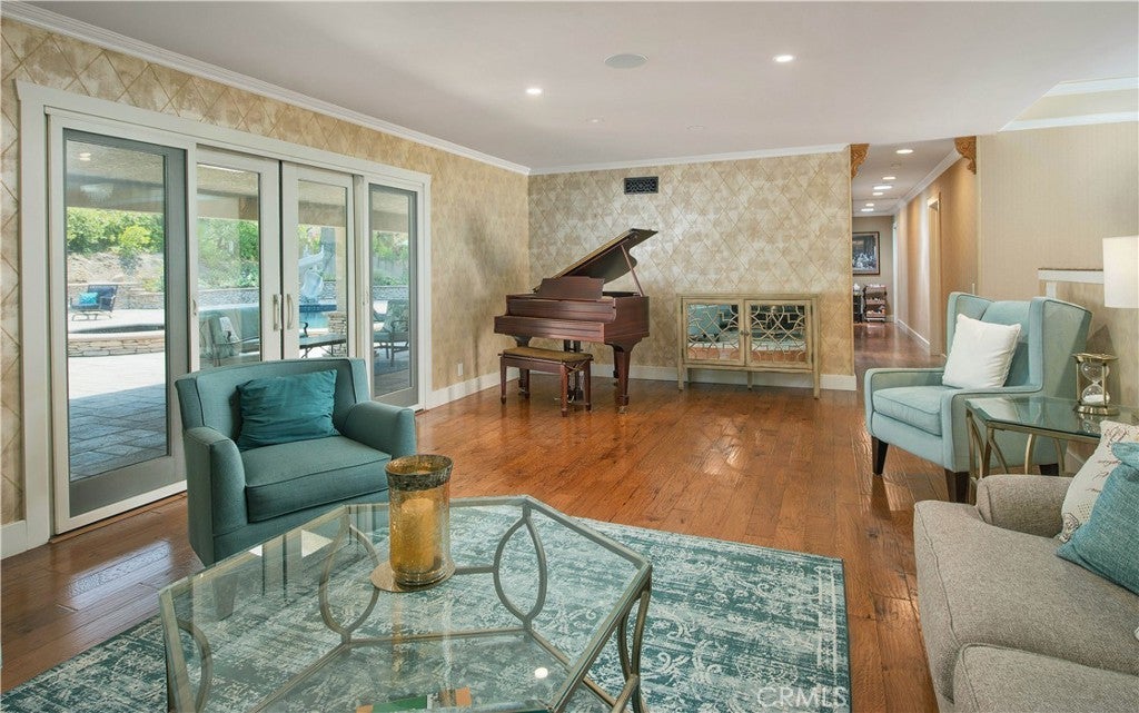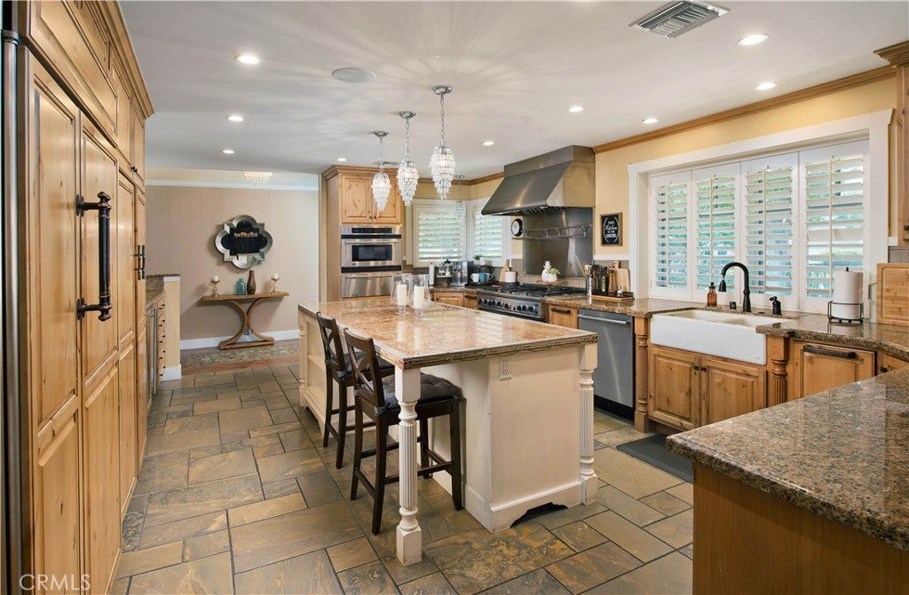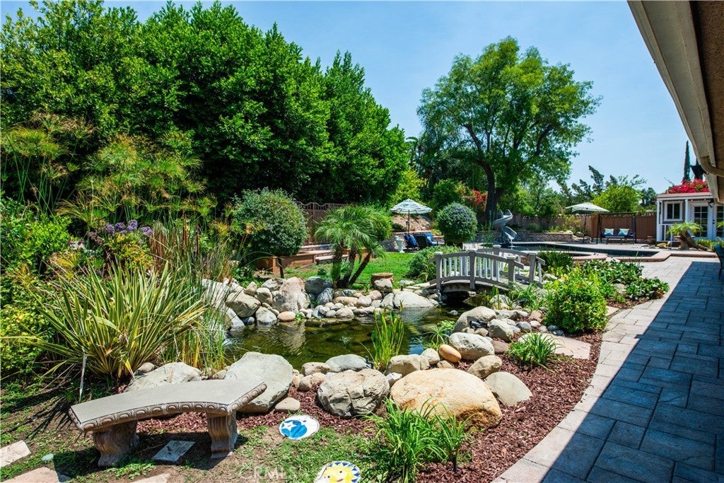 Welcome to one of the most spectacular single-story, ranch style custom estates in Knollwood! The moment you arrive, the striking curb appeal sets the tone—beautiful rock hardscaping leads to a private, gated courtyard with serene fountain and tranquil seating areas that greet you. Step through custom wood double doors w/beveled glass and discover nearly 4,300 sq. ft. of luxurious living space. Upon entry you immediately notice the views of the resort-like backyard through the oversized sliding glass doors of the spacious and bright living room that has custom built-ins and fireplace. At the heart of the home is a gourmet chef’s kitchen, designed to impress w/Argentinean marble floors, oversized center island, DCS 6-burner stove, double ovens, warming drawer, dual sinks, Sub-Zero refrigerator, wine fridge, fireplace & exceptional storage. The kitchen flows seamlessly into the dining room and onward to a step-down, expansive family room w/custom built-ins and cozy fireplace. Surrounding the family room is a bonus upper open area, ideal for bar or pool table- the perfect entertaining spot w/oversized glass sliders that frame serene views of the entertainer’s backyard—creating a seamless indoor-outdoor flow. Thoughtful floor plan features two private wings, creating an ideal layout for the five bedrooms and four baths. The primary retreat is a sanctuary of luxury, boasting a fireplace, custom up lighting, built-in wardrobes and fully finished walk-in closet. The spa-like primary bath features Carrera marble, heated floors, dual vanities, whirlpool soaking tub, oversized steam shower, and skylight that bathes the space in natural light. Two of the additional bedrooms are spacious en-suites, perfect for guests or family. A rare and impressive feature is the extra-large laundry room, designed to accommodate two washers and two dryers, with abundant cabinetry, a utility sink & direct access to yard. The resort-style backyard is an entertainer’s dream: an extended covered patio w/fireplace, Pebble Tec salt water pool w/slide, stylish spa-inspired outdoor shower, koi pond, putting green, low-maintenance turf, detached pool room & large gated/enclosed carport area. Additional highlights include mud room, finished three-car garage w/epoxy floors and built-in cabinets, solar, 3 A/C zones, CAT/cable wiring throughout. Homes like this are a rare find—offering custom design, privacy and luxury all in one. This extraordinary estate is truly one of a kind and won’t last!