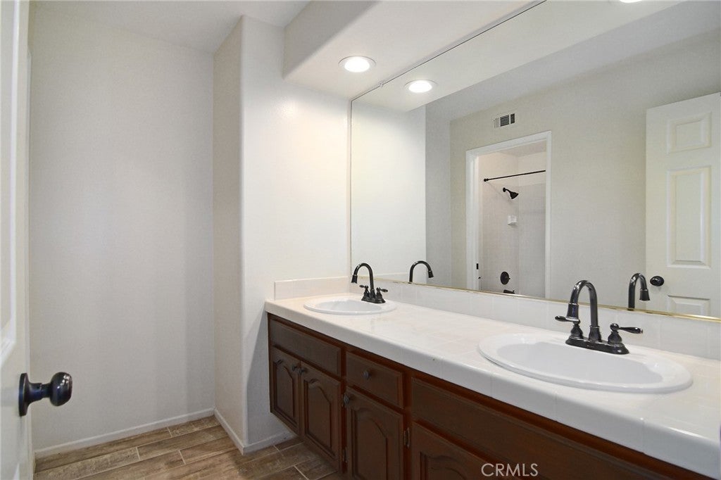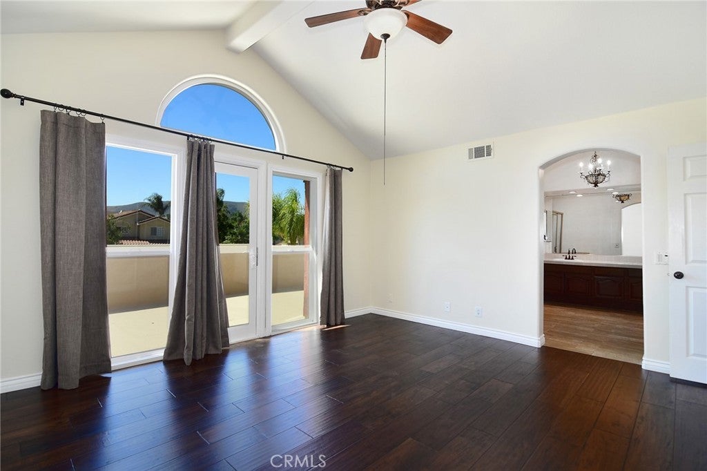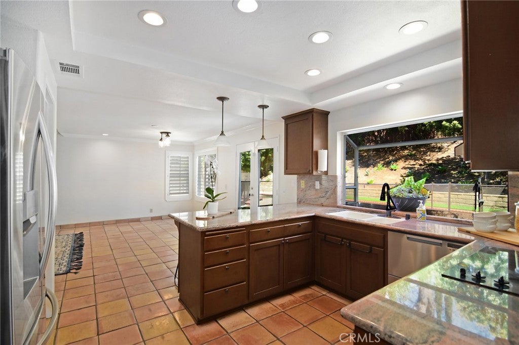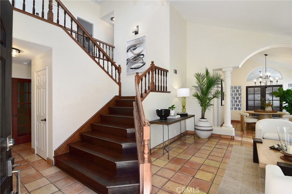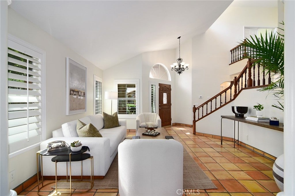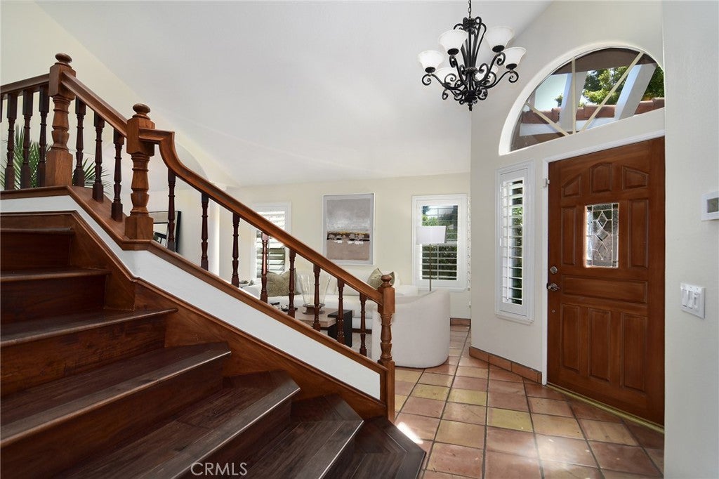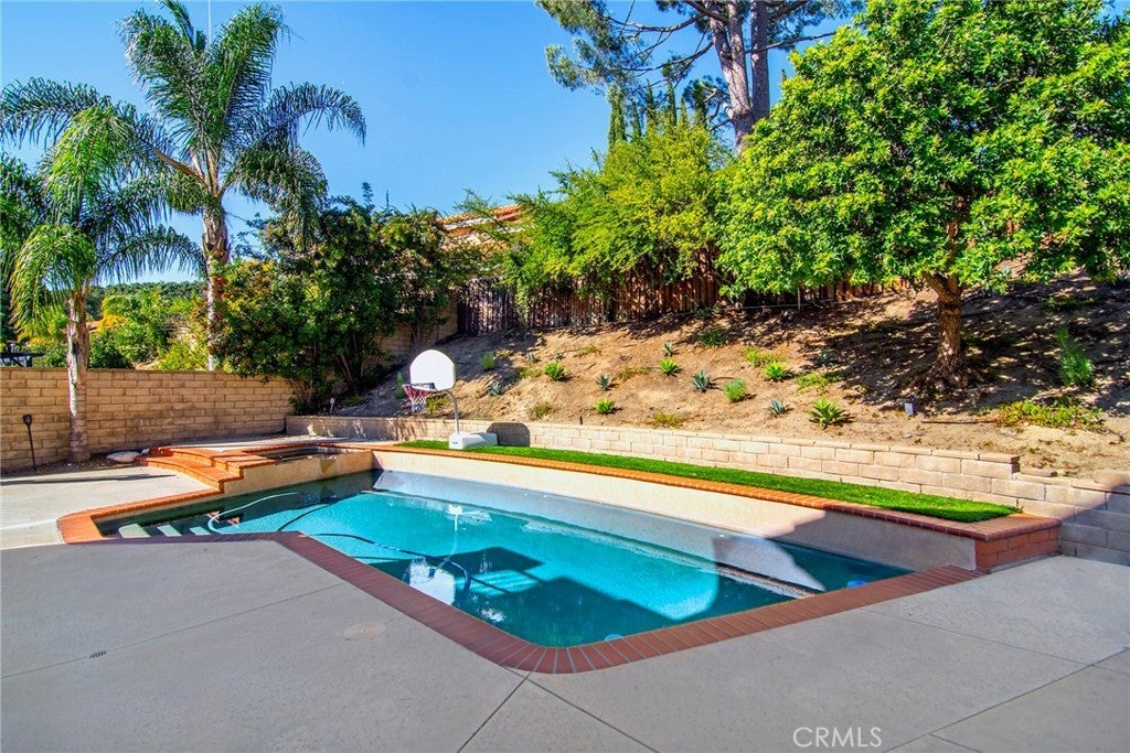 Nestled on a quiet cul-de-sac, this stunning Wood Ranch “Regalia” residence offers soaring ceilings, abundant natural light, and a spacious yet private backyard retreat. Relax by the serene Pebble Tec pool and spa while enjoying the diverse wildlife that call the hillside trees and shrubs home. Inside, you’ll find a rare main-floor multi-purpose bonus room with vaulted ceilings, a wall of built-in cabinetry, a bar sink, and two sets of double doors opening to both the formal dining room and the pool area—perfect as a home office, artist studio, gym, guest suite, or cabana bar. The upgraded kitchen features slab granite countertops, stainless steel appliances (including refrigerator and a back-saving double-drawer dishwasher), breakfast bar, and an oversized walk-in pantry. The downstairs bedroom—currently used as an office—offers soundproofed walls, double French doors, beautiful Acacia wood floors, and built-ins. A full shower bath is conveniently located nearby, along with a laundry room (washer and dryer included). Upstairs, rich Acacia wood floors flow through the hallway and primary suite, with newer carpet in the secondary bedrooms. The primary suite features a walk-in closet, water closet, double-sink vanity, and new decking off its expansive balcony. A second balcony is shared by one of the secondary bedrooms. Both upstairs baths feature newer wood-look tile, and a whole-house fan with timer adds comfort and efficiency. This home also includes solar, providing significant energy savings year-round, along with a large poolside cabana perfect for entertaining. Move-in ready with neutral paint, plantation shutters, and most windows replaced—this is a rare combination of style, comfort, and resort-style living in Wood Ranch.