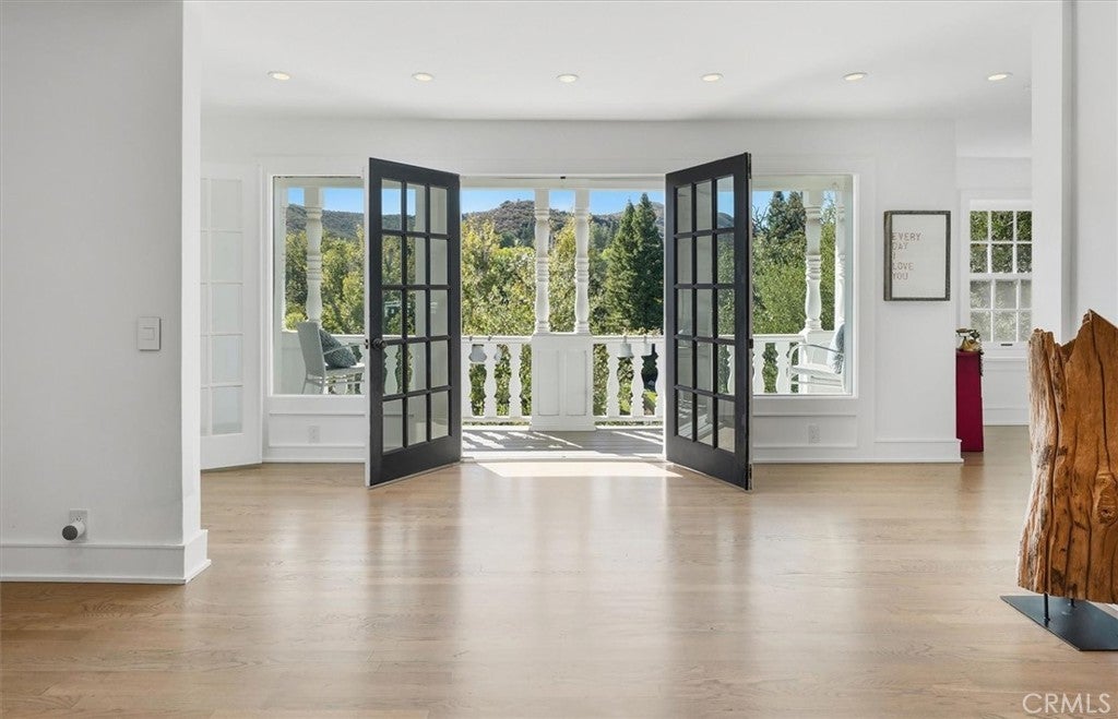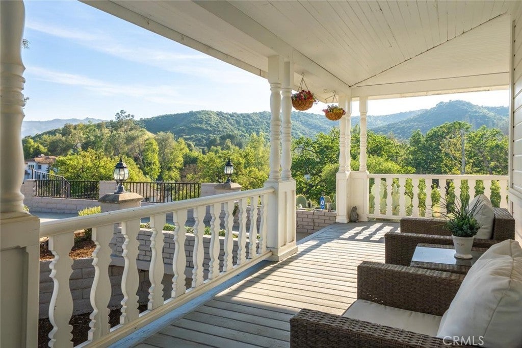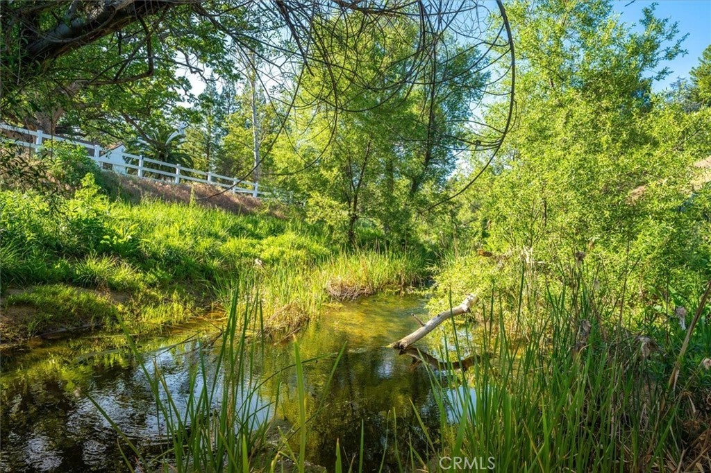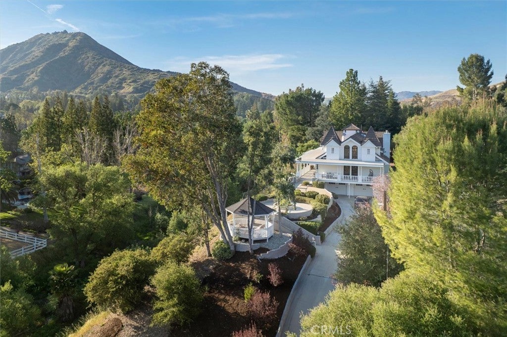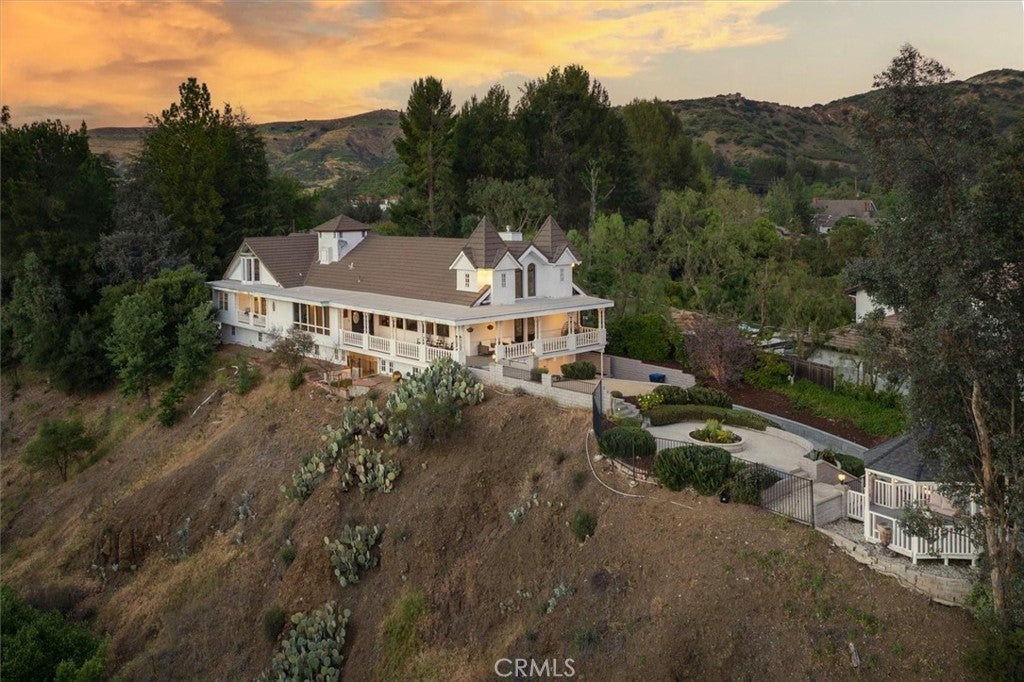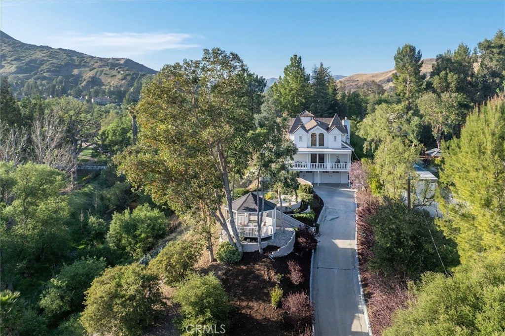 A rare private canyon estate set on its own elevated hilltop within a gated enclave south of the boulevard, offering sweeping views of Ladyface Mountain and a serene creek below. A cherry blossom-lined approach welcomes you into over 1.3 acres of serene natural beauty. The property overlooks surrounding horse properties and a year-round creek that flows toward Malibou Lake—where the sounds of water, birds, and evening frogs create a peaceful, immersive retreat. The approximately 6,167-square-foot residence features expansive living spaces filled with natural light, thoughtfully designed to capture the surrounding canyon views. A curated collection of custom glasswork—including stained, beveled, and etched details—adds warmth, character, and architectural distinction throughout. The home offers seamless indoor-outdoor living, with multiple balconies and outdoor spaces designed to take in the setting—from morning coffee off the kitchen to quiet evenings overlooking the canyon. A private top-floor primary suite serves as a true retreat, elevated above the landscape with a bird’s-eye view of the horses across the creek. The suite features a spa-inspired bathroom with steam room and an expansive walk-in closet. The lower level provides exceptional versatility with a professional recording studio complete with isolation booth, along with a separate guest apartment—ideal for a private creative compound, multigenerational living, or extended stays. Additional features include a dedicated mudroom, two large storage areas, a private outdoor patio, built-in garage storage, and an electric vehicle charger. Outdoor spaces are designed for both relaxation and entertaining, featuring a wraparound porch, multiple seating areas, pizza oven, gazebo, and mature fruit trees. Recent improvements include nearly $400,000 invested into the property, including interior updates, refreshed front landscaping, hardscape improvements, termite inspection, and a newly enhanced presentation for this relaunch. The home is also connected to sewer (no septic). Located within the award-winning Las Virgenes School District and just minutes from Malibu, this is a rare opportunity to own a truly special canyon estate. Agoura Hills living at its FINEst!