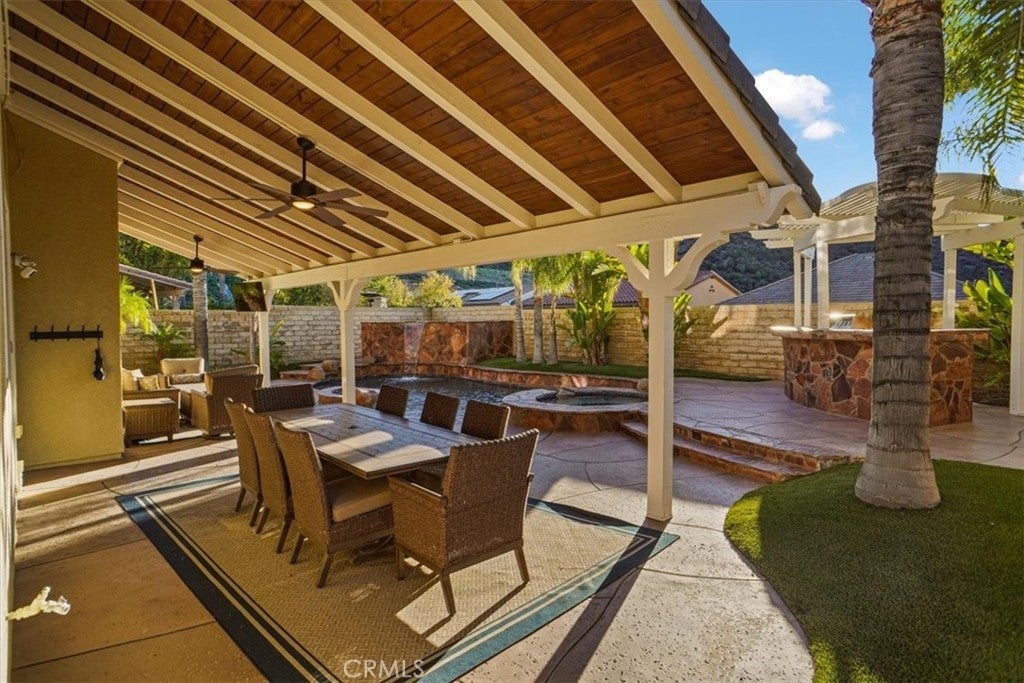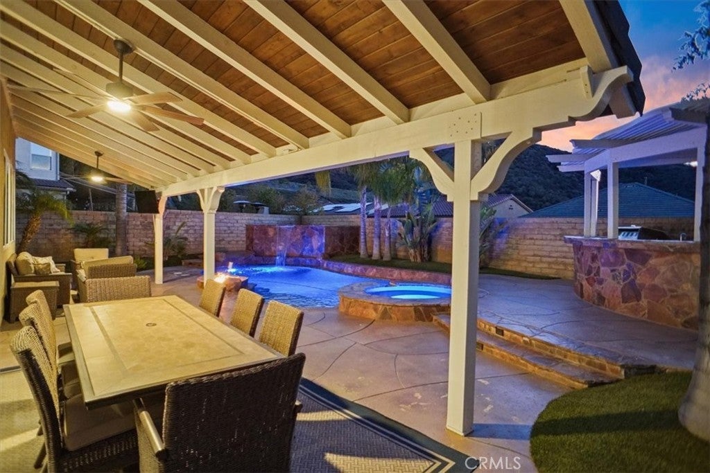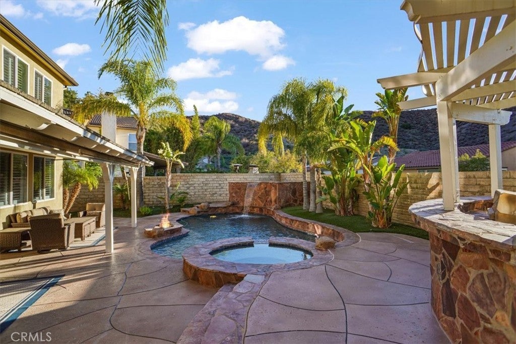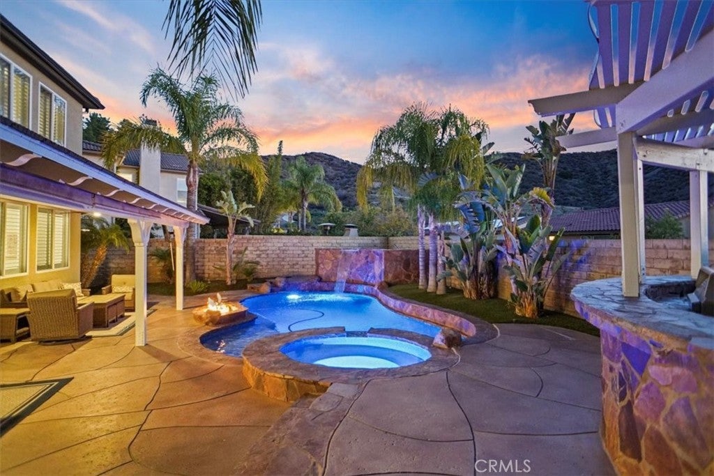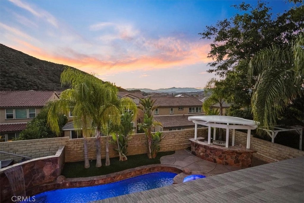 Welcome to this beautifully upgraded, turn-key Saugus POOL home where no detail has been overlooked. Downstairs features a formal living room, a dining room with custom built-in cabinetry, a convenient laundry room, and a powder room. The open-concept kitchen and family room create the perfect space for entertaining, complete with a large center island, oversized sink, and top-of-the-line appliances. On the second floor, the primary suite boasts stunning views of the backyard and surrounding hillsides, along with a luxurious ensuite bathroom featuring a walk-in shower, soaking tub with a view, and a large custom walk-in closet. The secondary bedrooms all include ceiling fans and generous closet space. The shared upstairs bathroom features dual sinks and a tub/shower combination. Step through the sliding doors to the expansive backyard, where you’ll find a covered patio overlooking a sparkling pool with waterfall and spa. The pool was recently re-finished with PebbleTec (within the last two years), and all pumps and filters were replaced at that time. The outdoor kitchen includes a large built-in BBQ and smoker, ideal for hosting gatherings. A separate side yard features a custom dog run, perfect for furry family members. Upstairs offers five spacious bedrooms. Additional highlights include a three-car tandem garage with epoxy floors and built-in cabinetry, owned solar, a recently replaced AC unit and ducting, and a built-in humidity control system. End of cul-de-sac location! This home has it all! MUST SEE!