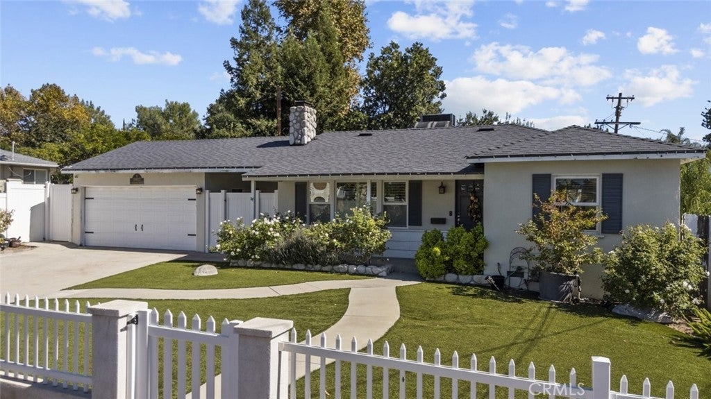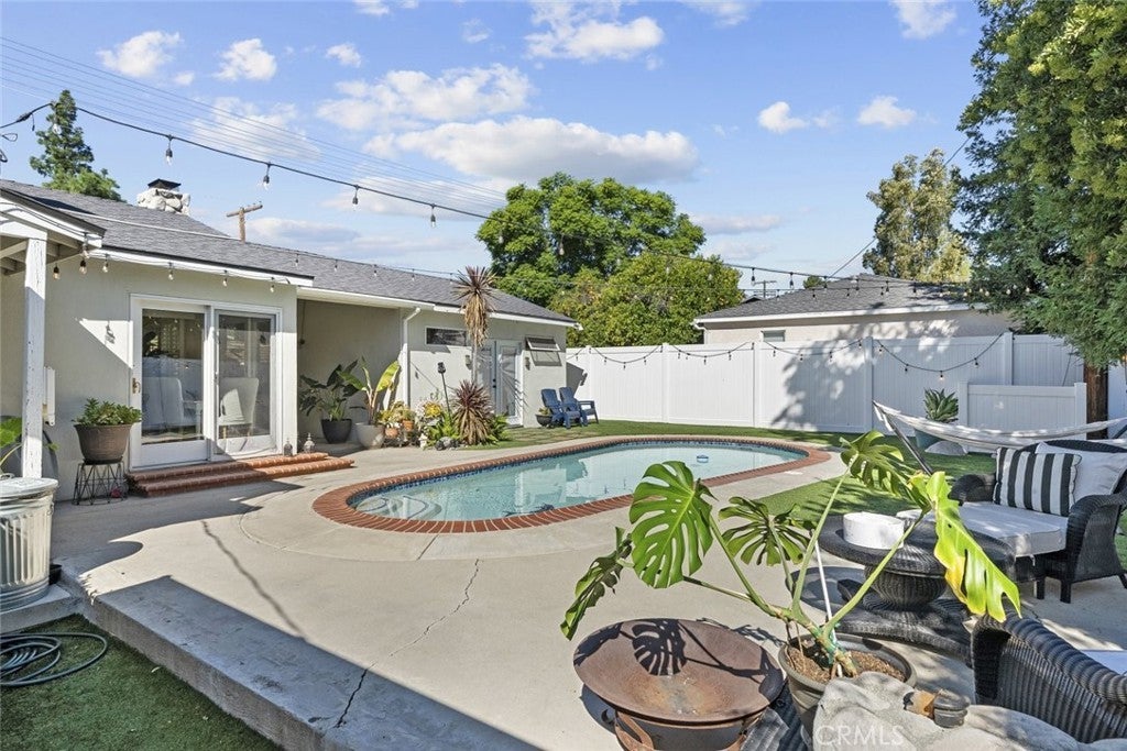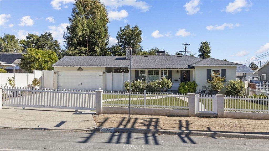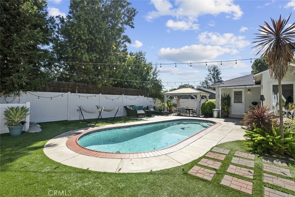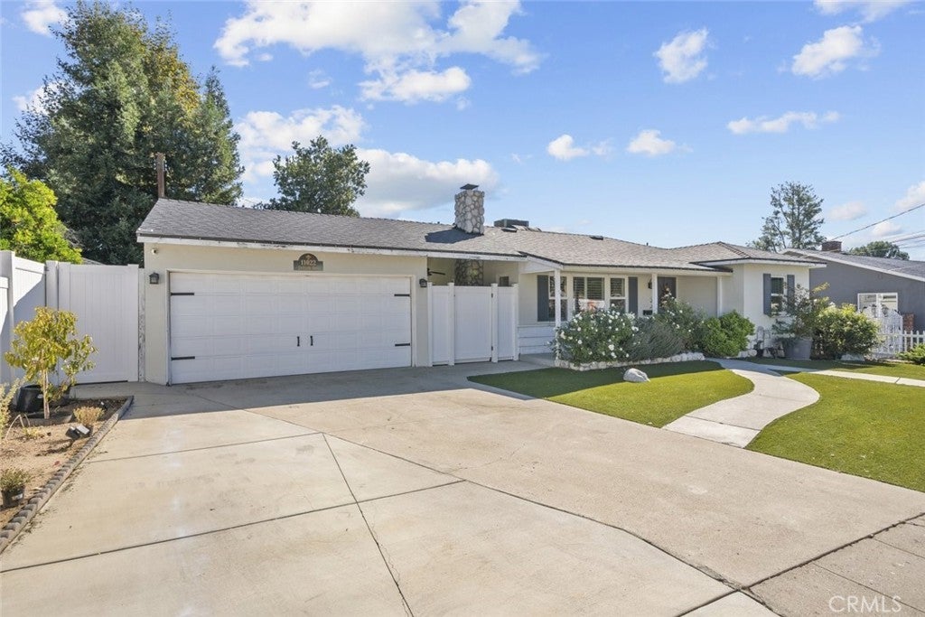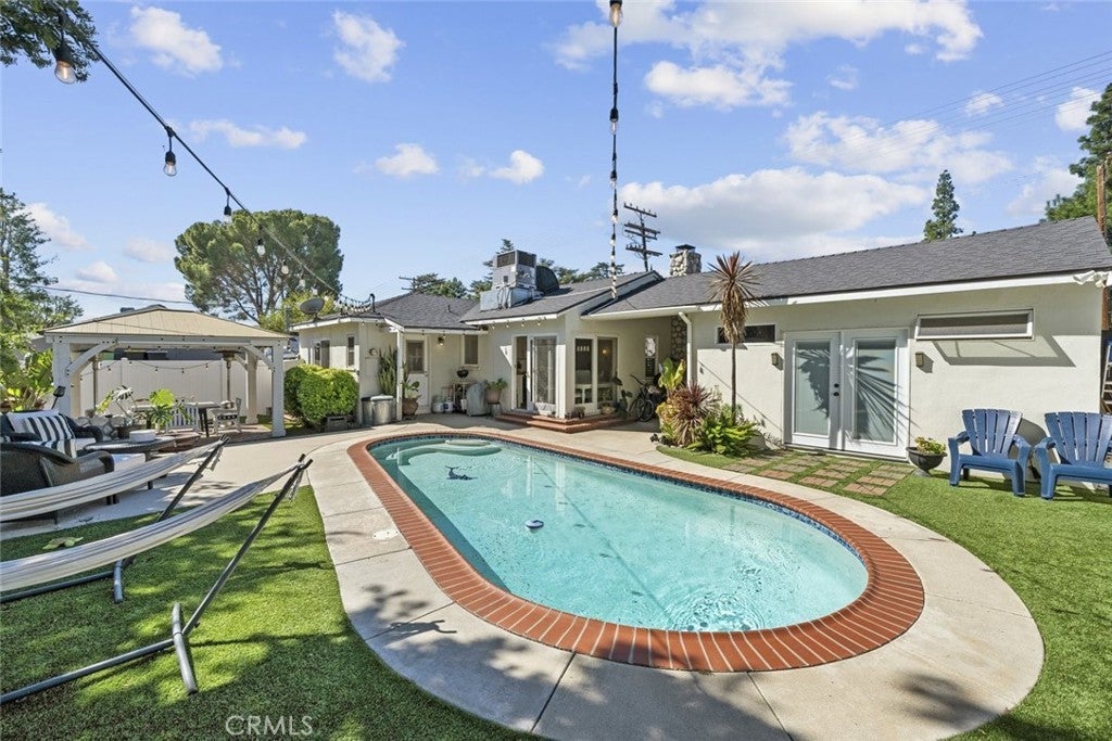 Granada Hills Pool Home! Welcome to this beautifully maintained 2-bedroom, 1.5-bath home offering 1,038 sq. ft. of living space on a generous 5,870 sq. ft. lot. From the moment you arrive, the inviting curb appeal, white picket fence, paved driveway, and manicured front yard set the tone for what awaits inside. Inside, you'll find an open floor plan filled with natural light, highlighted by recessed lighting, ceiling fans, and rich wood flooring throughout. The cozy living room features a stunning rock-accented fireplace, creating a warm and welcoming atmosphere. The kitchen boasts stainless steel appliances, a designated dining area, and double sliding doors that open to the backyard — perfect for seamless indoor-outdoor living. The primary bedroom includes mirrored closet doors and a stylish en-suite bathroom with dual sinks and a shower/tub combo. A convenient laundry room with stackable washer and dryer adds everyday practicality. Outside, enjoy your own private retreat. Take a dip in the sparkling pool, relax under the gazebo, or entertain friends and family in the spacious backyard. The 2-car garage has been thoughtfully converted into a man cave, offering a great bonus space for lounging, hobbies, or entertainment. With tasteful white interior paint throughout, this home perfectly blends comfort, style, and functionality. Must see to appreciate. Located within close distance to Granada Hills Charter High School, a large and highly regarded public charter school in the Granada Hills neighborhood.