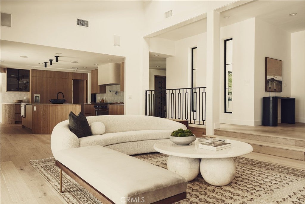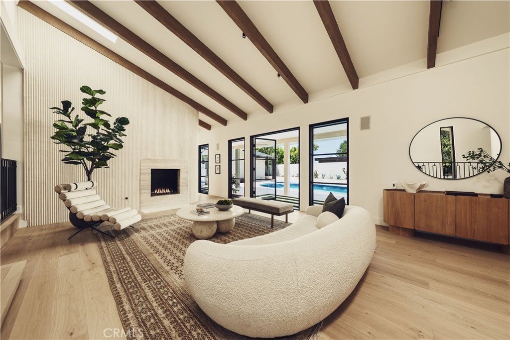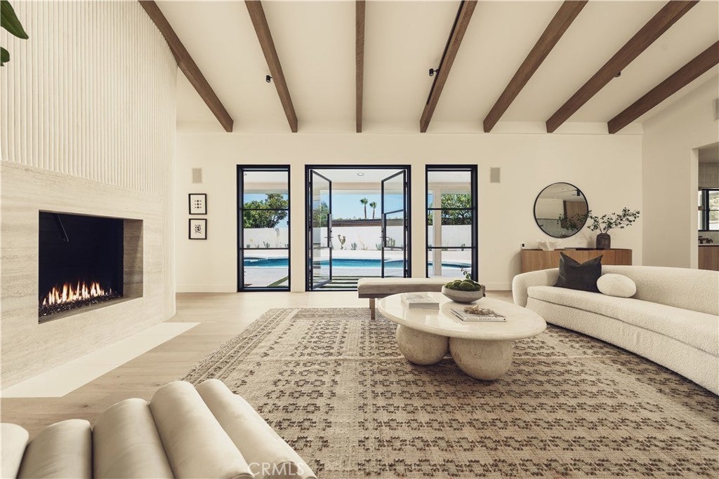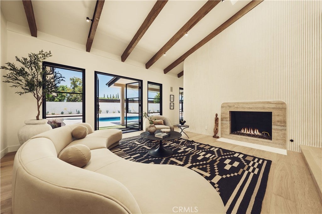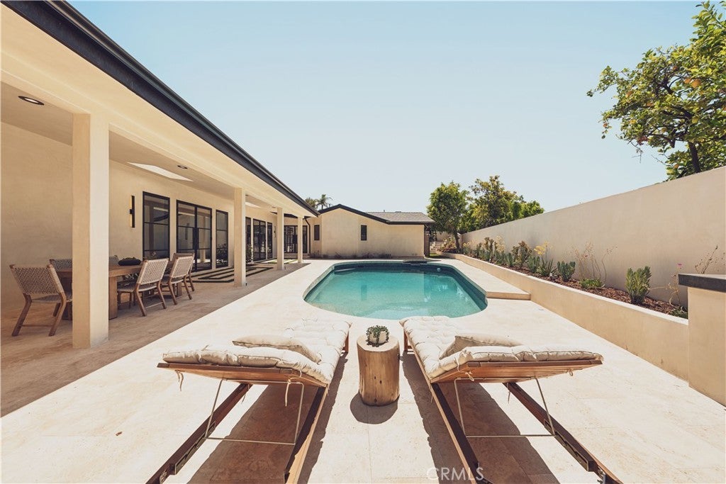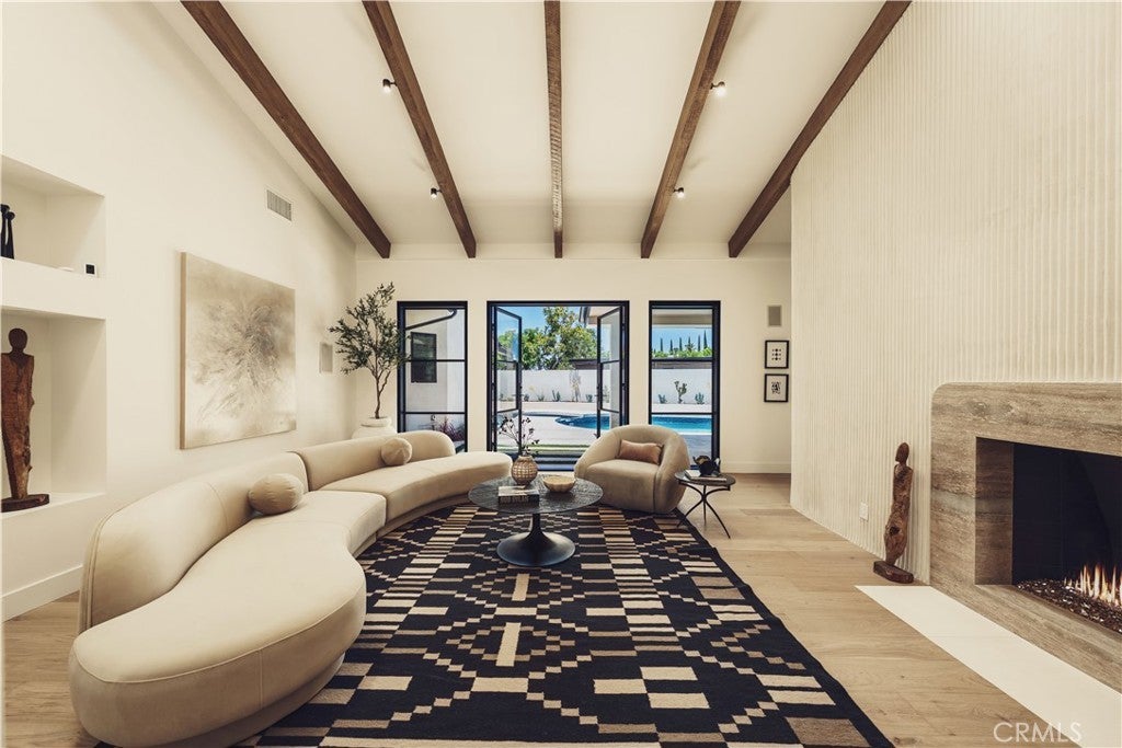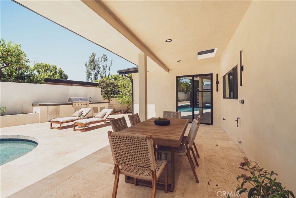 Welcome to this stunning, sprawling residence in the Hills of Encino, offering timeless, luxurious design and exceptional craftsmanship. From the moment you arrive, the smooth stucco façade with limestone accents delivers striking curb appeal. Travertine steps lead you to an impressive ten-foot glass entry door, setting the tone for what awaits inside. The foyer is bathed in natural light, thanks to multiple iron French doors and strategically placed skylights. The great room is anchored by an expansive fluted architectural fireplace, creating a sophisticated, inviting ambiance. Throughout the home, premium finishes, including French oak engineered hardwood flooring. A massive living room faces the backyard seamlessly flows into the chef’s kitchen, highlighted by a large island with fluted wood paneling, abundant white oak cabinetry, top-of-the-line Thermador appliances, and a walk-in pantry for added convenience. Adjacent to the kitchen, a private family room offers a cozy retreat separate from the main entertaining areas. A central hallway leads to two bedrooms, a formal dining room featuring a built-in wine rack, a stylish bathroom, and a utility room with laundry facilities. In the southern wing, you’ll find two en-suite bedrooms and the expansive primary suite overlooking the backyard. The primary bathroom is a showstopper, with dual showers featuring travertine checkered floors, limestone flooring, and a custom dual vanity topped with Arabescato Corchia marble. The custom walk-in closet provides generous storage and organization. The low-maintenance backyard is perfect for entertaining, with travertine flooring throughout, a large pool and spa, built-in barbecue, and integrated speakers. An additional spacious side yard features a pergola-covered patio with peek-a-boo views. For added convenience, there is an additional bathroom with access from the side yard for those using the pool. This home offers a luxurious, timeless aesthetic sure to impress, all within close proximity to the best shopping and dining the Valley has to offer.
