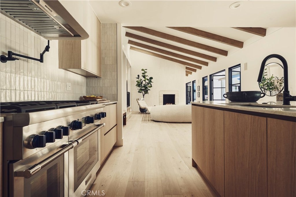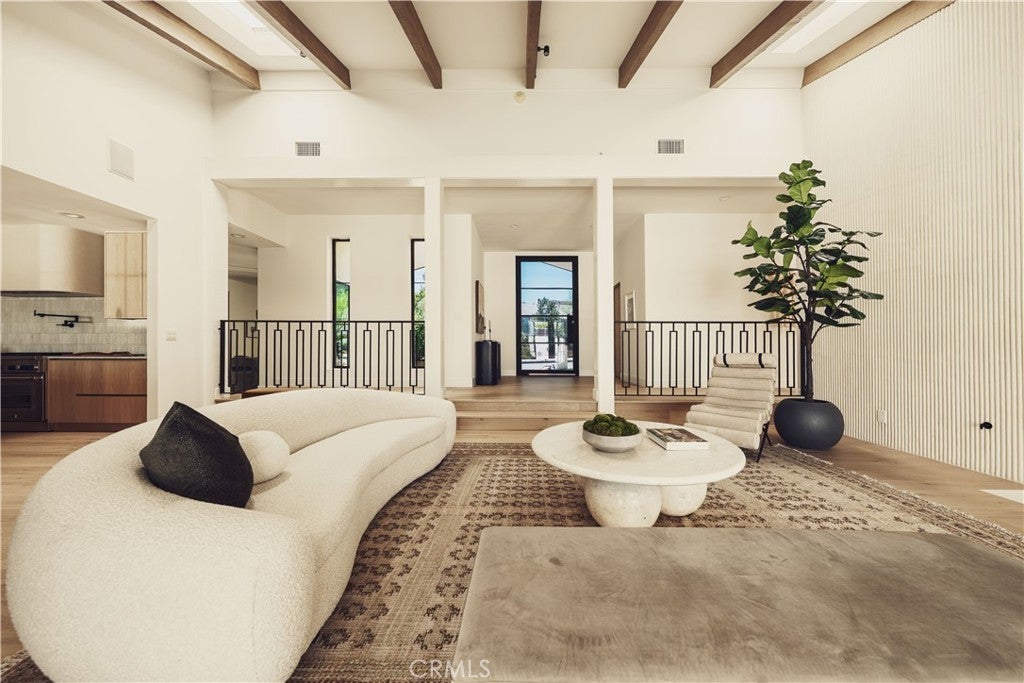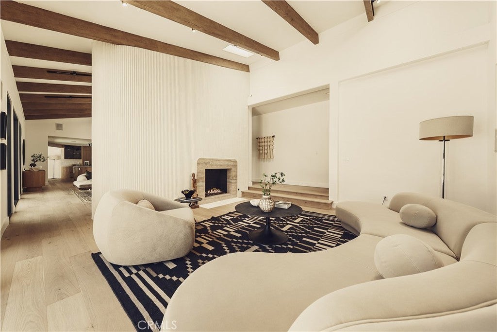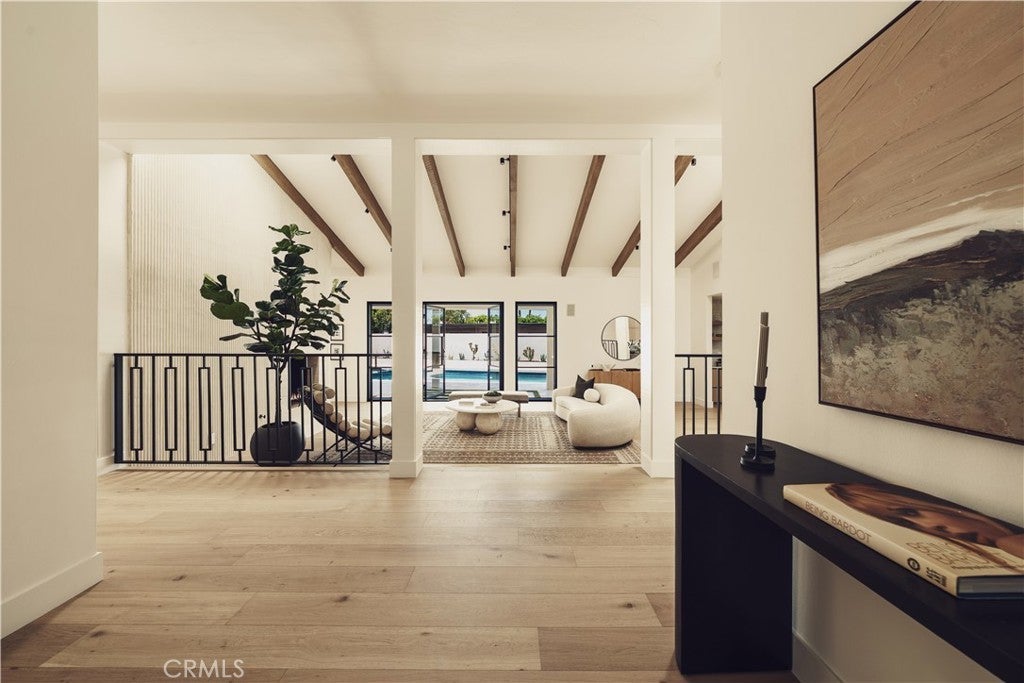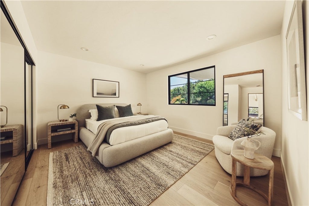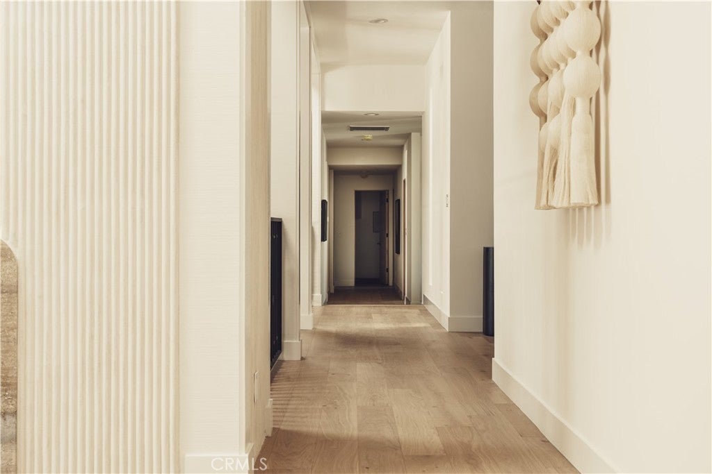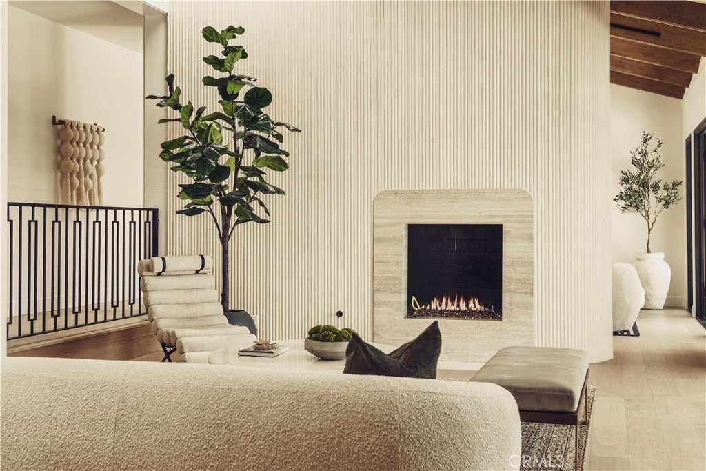 Welcome to this stunning, sprawling residence in the Hills of Encino, offering timeless, luxurious design and exceptional craftsmanship. From the moment you arrive, the smooth stucco façade with limestone accents delivers striking curb appeal. Travertine steps lead you to an impressive ten-foot glass entry door, setting the tone for what awaits inside. The foyer is bathed in natural light, thanks to multiple iron French doors and strategically placed skylights. The great room is anchored by an expansive fluted architectural fireplace, creating a sophisticated, inviting ambiance. Throughout the home, premium finishes, including French oak engineered hardwood flooring. A massive living room faces the backyard seamlessly flows into the chef’s kitchen, highlighted by a large island with fluted wood paneling, abundant white oak cabinetry, top-of-the-line Thermador appliances, and a walk-in pantry for added convenience. Adjacent to the kitchen, a private family room offers a cozy retreat separate from the main entertaining areas. A central hallway leads to two bedrooms, a formal dining room featuring a built-in wine rack, a stylish bathroom, and a utility room with laundry facilities. In the southern wing, you’ll find two en-suite bedrooms and the expansive primary suite overlooking the backyard. The primary bathroom is a showstopper, with dual showers featuring travertine checkered floors, limestone flooring, and a custom dual vanity topped with Arabescato Corchia marble. The custom walk-in closet provides generous storage and organization. The low-maintenance backyard is perfect for entertaining, with travertine flooring throughout, a large pool and spa, built-in barbecue, and integrated speakers. An additional spacious side yard features a pergola-covered patio with peek-a-boo views. For added convenience, there is an additional bathroom with access from the side yard for those using the pool. This home offers a luxurious, timeless aesthetic sure to impress, all within close proximity to the best shopping and dining the Valley has to offer.