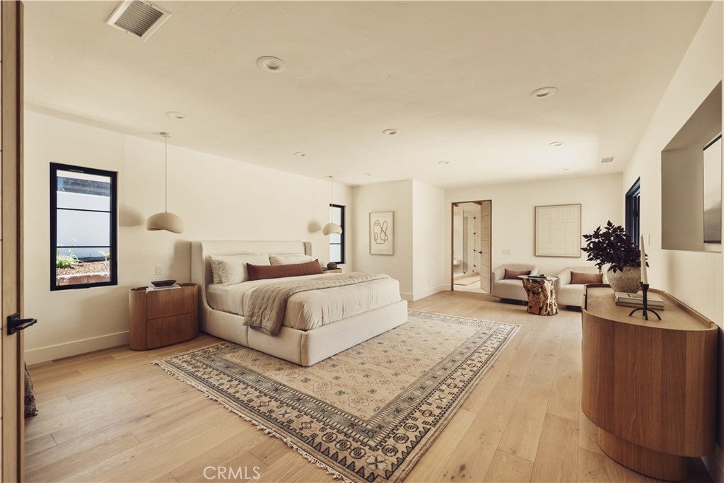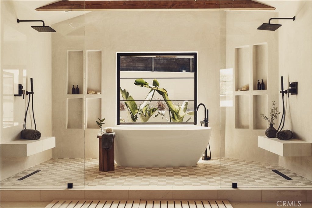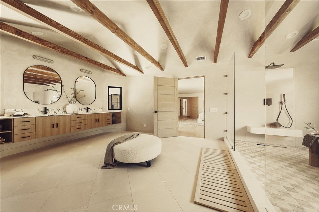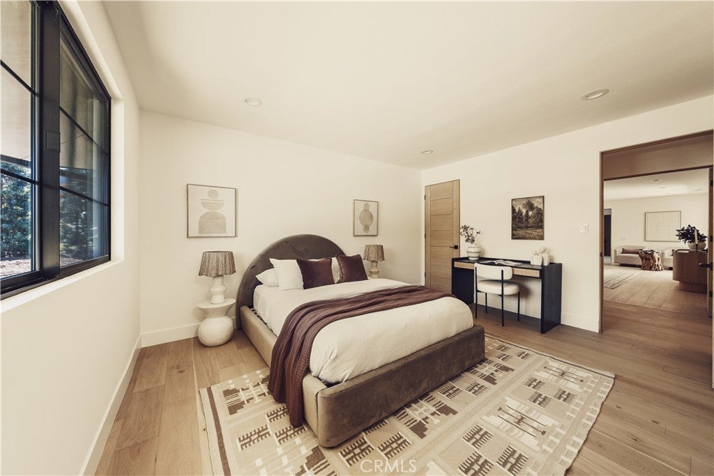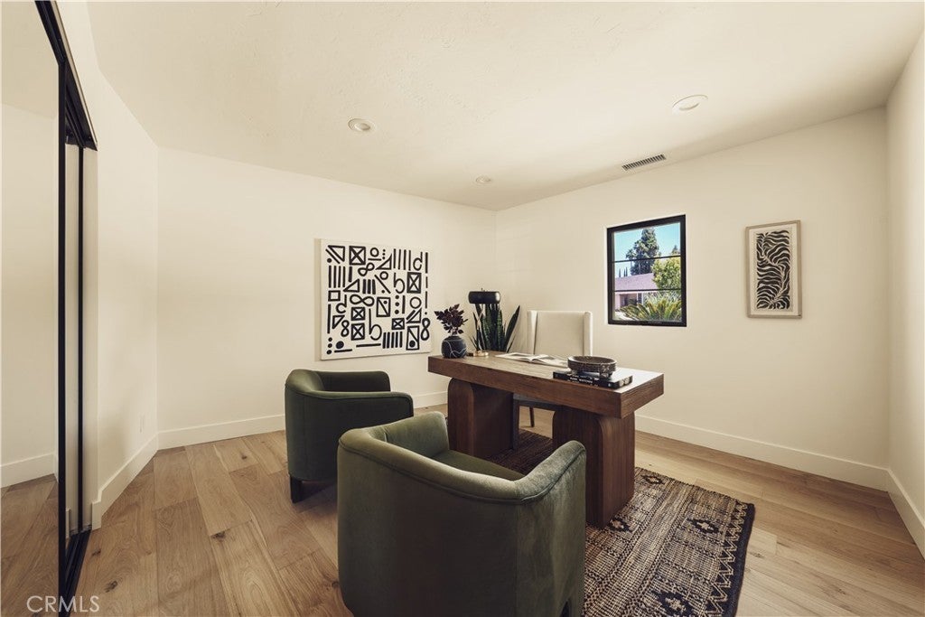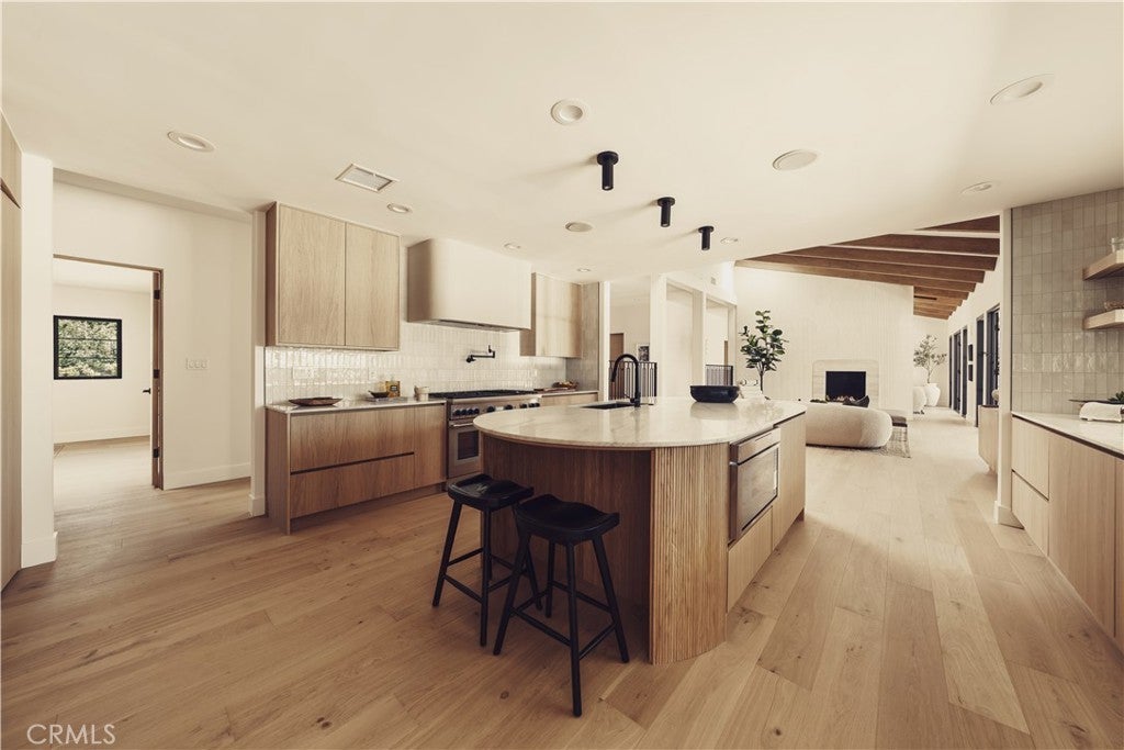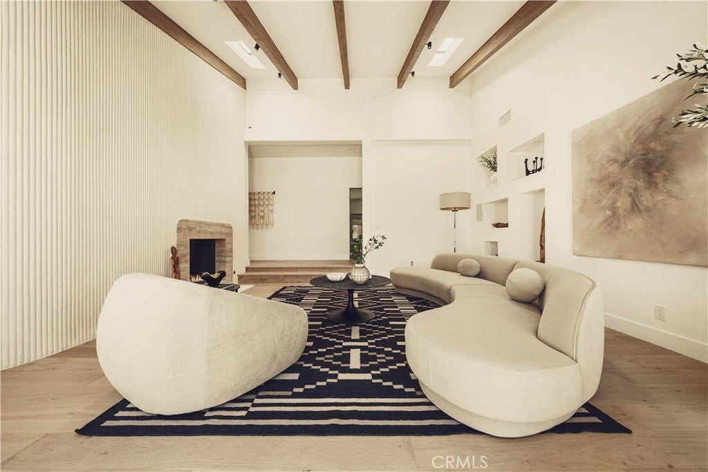 Welcome to this stunning, sprawling residence in the Hills of Encino, offering timeless, luxurious design and exceptional craftsmanship. From the moment you arrive, the smooth stucco façade with limestone accents delivers striking curb appeal. Travertine steps lead you to an impressive ten-foot glass entry door, setting the tone for what awaits inside. The foyer is bathed in natural light, thanks to multiple iron French doors and strategically placed skylights. The great room is anchored by an expansive fluted architectural fireplace, creating a sophisticated, inviting ambiance. Throughout the home, premium finishes, including French oak engineered hardwood flooring. A massive living room faces the backyard seamlessly flows into the chef’s kitchen, highlighted by a large island with fluted wood paneling, abundant white oak cabinetry, top-of-the-line Thermador appliances, and a walk-in pantry for added convenience. Adjacent to the kitchen, a private family room offers a cozy retreat separate from the main entertaining areas. A central hallway leads to two bedrooms, a formal dining room featuring a built-in wine rack, a stylish bathroom, and a utility room with laundry facilities. In the southern wing, you’ll find two en-suite bedrooms and the expansive primary suite overlooking the backyard. The primary bathroom is a showstopper, with dual showers featuring travertine checkered floors, limestone flooring, and a custom dual vanity topped with Arabescato Corchia marble. The custom walk-in closet provides generous storage and organization. The low-maintenance backyard is perfect for entertaining, with travertine flooring throughout, a large pool and spa, built-in barbecue, and integrated speakers. An additional spacious side yard features a pergola-covered patio with peek-a-boo views. For added convenience, there is an additional bathroom with access from the side yard for those using the pool. This home offers a luxurious, timeless aesthetic sure to impress, all within close proximity to the best shopping and dining the Valley has to offer.