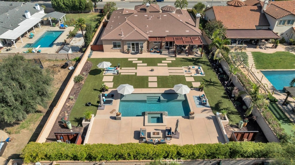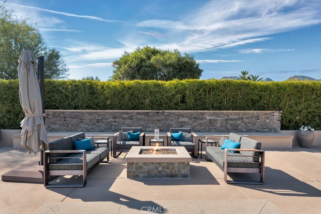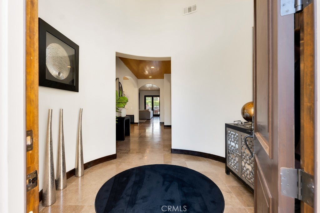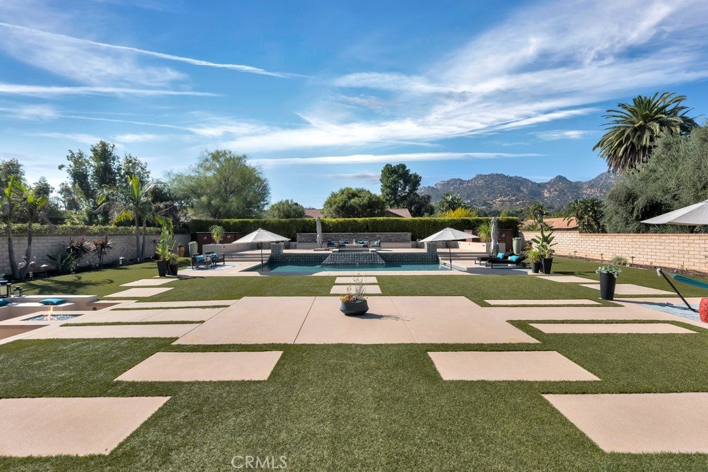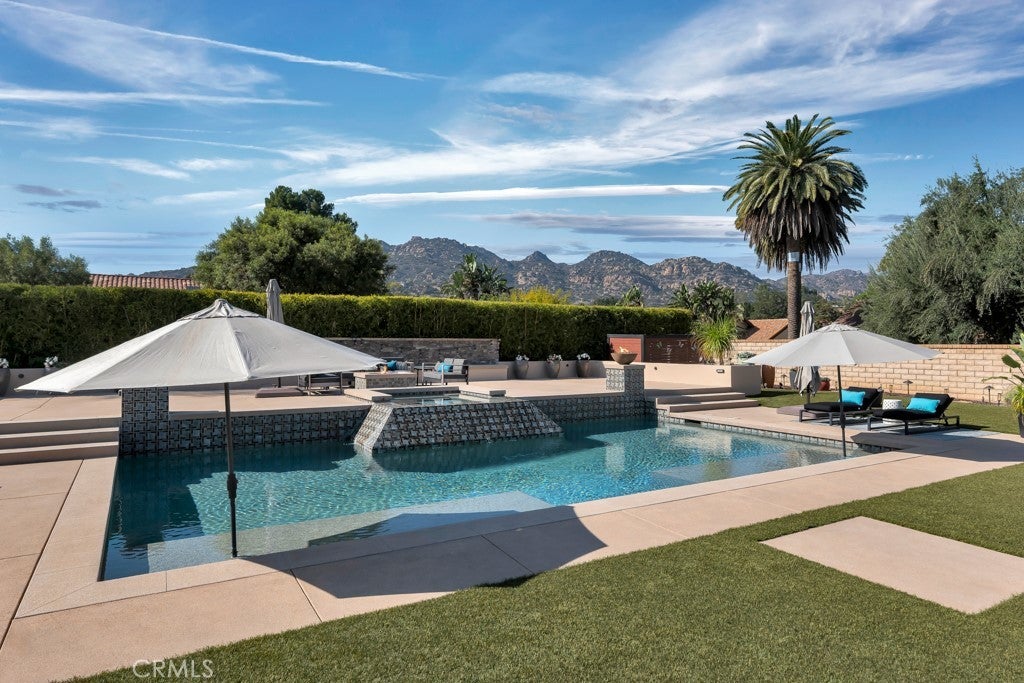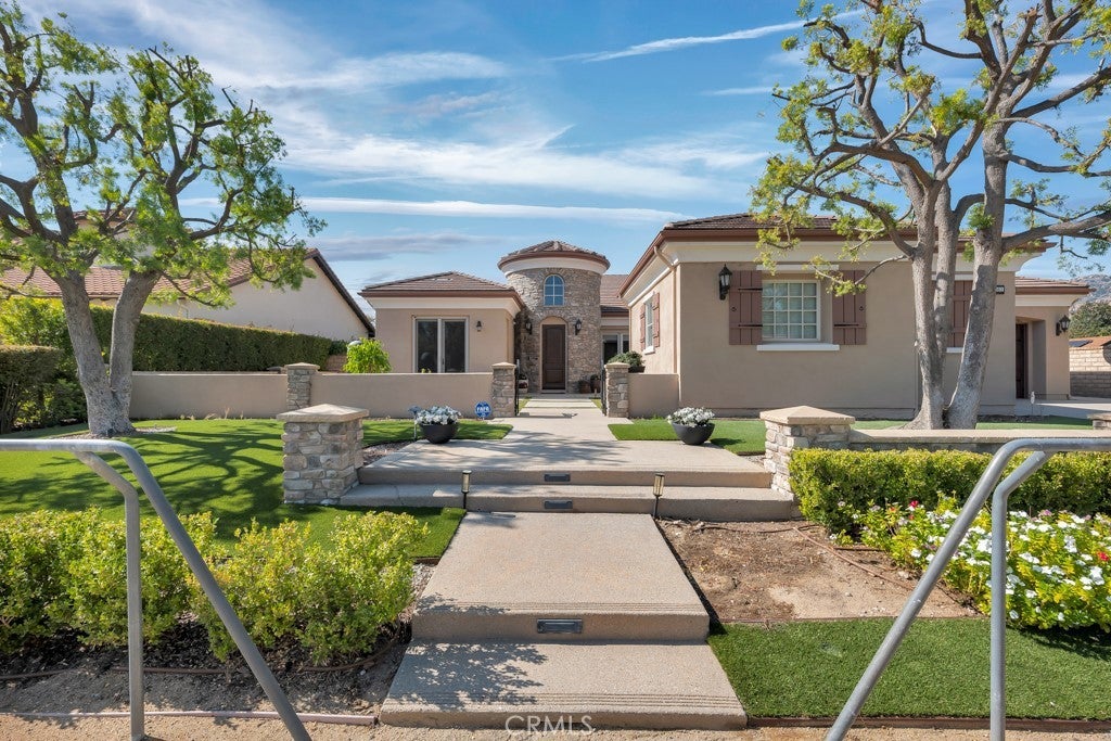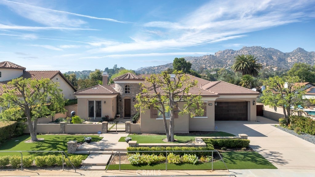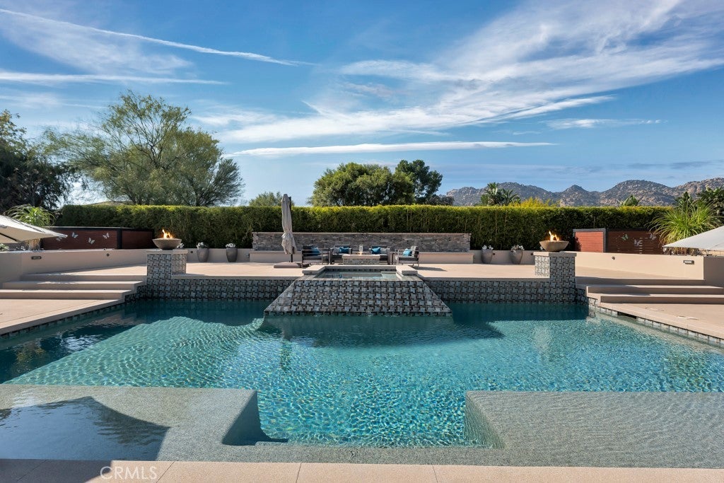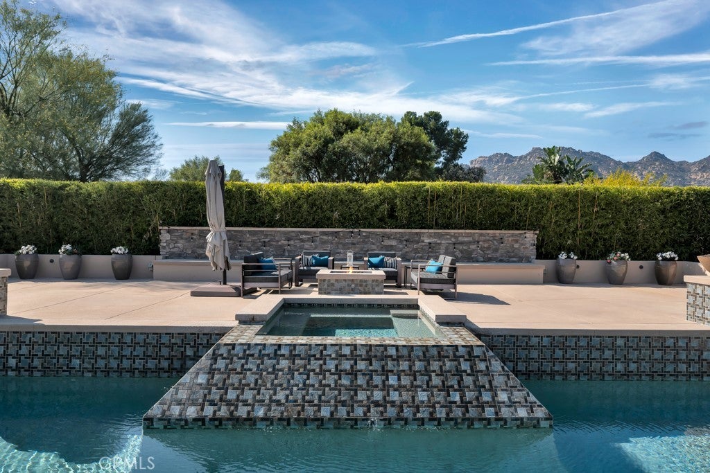Welcome to this stunning Modern Tuscan single-story estate in the highly sought-after Rancho Paso Fino community of Chatsworth. Built in 2006 and once serving as one of the original model homes, this 5-bedroom, 3.5-bath residence offers 3,737 sq ft of designer living space on a nearly 20,000 sq ft lot. Every detail has been thoughtfully curated, blending timeless architecture with luxurious modern upgrades throughout. A private front courtyard with a cozy outdoor fireplace and lush landscaping creates a grand first impression, with potential for a beautiful water feature. Inside, a breathtaking grand foyer with soaring ceilings opens to the elegant family room with French doors to the courtyard and a formal dining room opposite the central hallway. The expansive living room features a gas fireplace and custom entertainment center, seamlessly connecting to the chef’s kitchen complete with top-of-the-line Monogram appliances, granite countertops, a large center island with sink, and stunning backyard views from every window. Additional highlights include a generous walk-in pantry and a butler’s pantry with a wine refrigerator and space for casual dining. The residential wing features three spacious guest bedrooms—one with direct courtyard access, ideal for a home office—two full bathrooms, and ample linen storage. The luxurious primary suite offers an electric fireplace, French doors to the backyard, a large walk-in closet, and a spa-inspired ensuite with dual vanities, a soaking tub, and a walk-in shower. A fifth bedroom near the entry provides flexibility as a guest suite, home office, or maid’s quarters, complete with an adjacent half bath. Outdoor living is truly resort-style, featuring a PebbleTec pool, sunken fire pit lounge, additional fire features, built-in BBQ pavilion, and exquisite landscaping with lighting throughout. The property also includes a two-car attached garage, a detached one-car garage currently used as a gym, and a side driveway with RV potential. Additional upgrades include bamboo plank ceilings, travertine flooring, a hard-wired camera system, and a whole-home audio system. Don’t miss this rare opportunity to own a fully upgraded Modern Tuscan estate in Rancho Paso Fino—just minutes from scenic horse trails, hiking paths, parks, and sweeping mountain views.