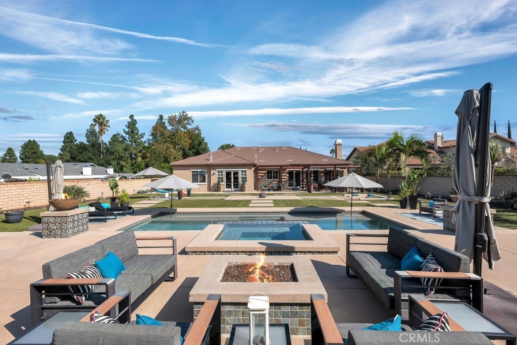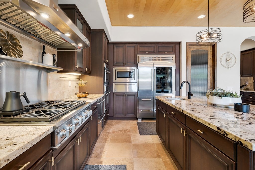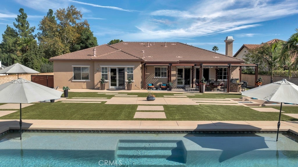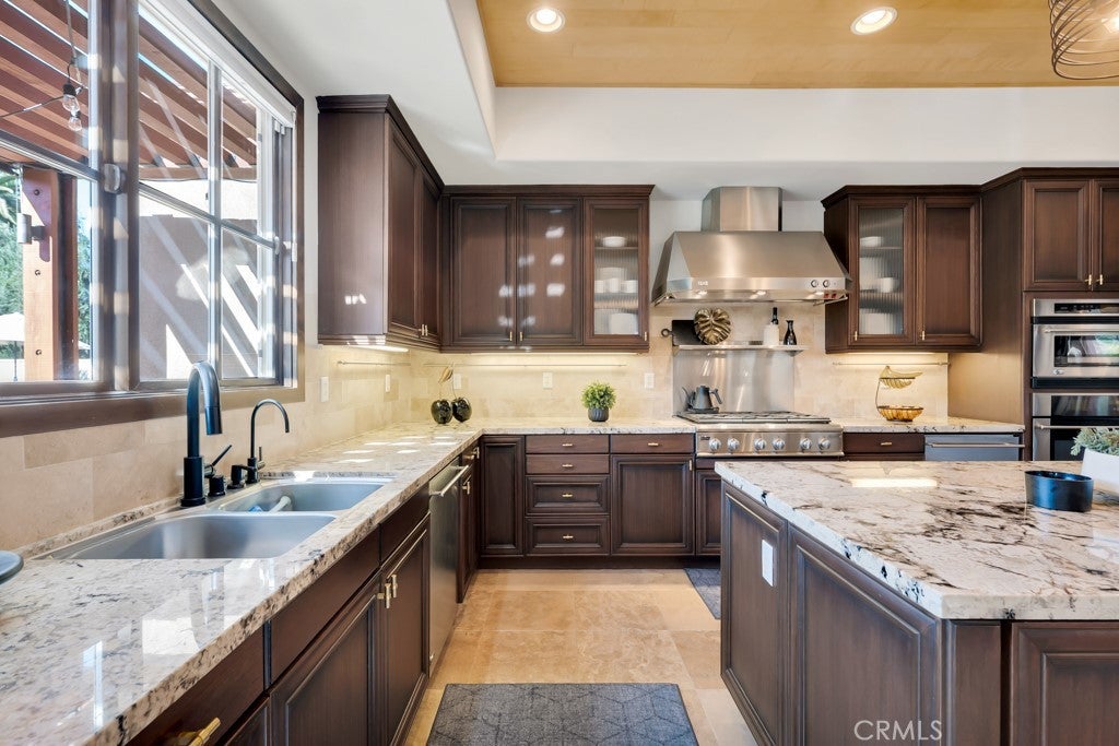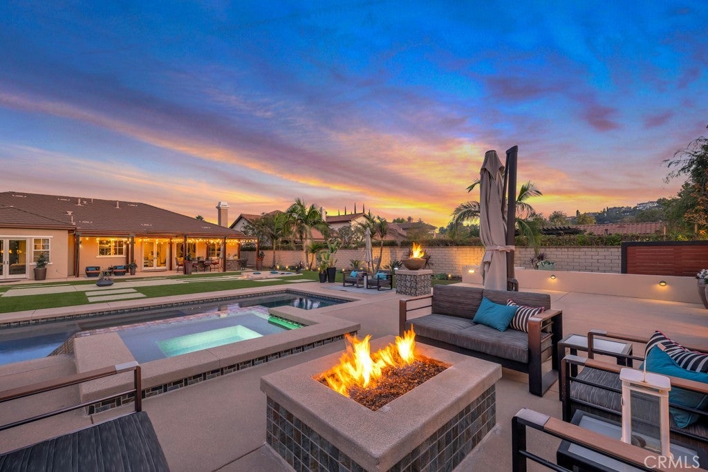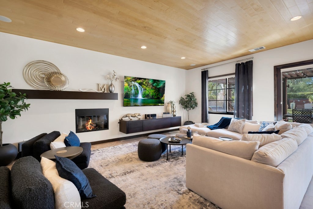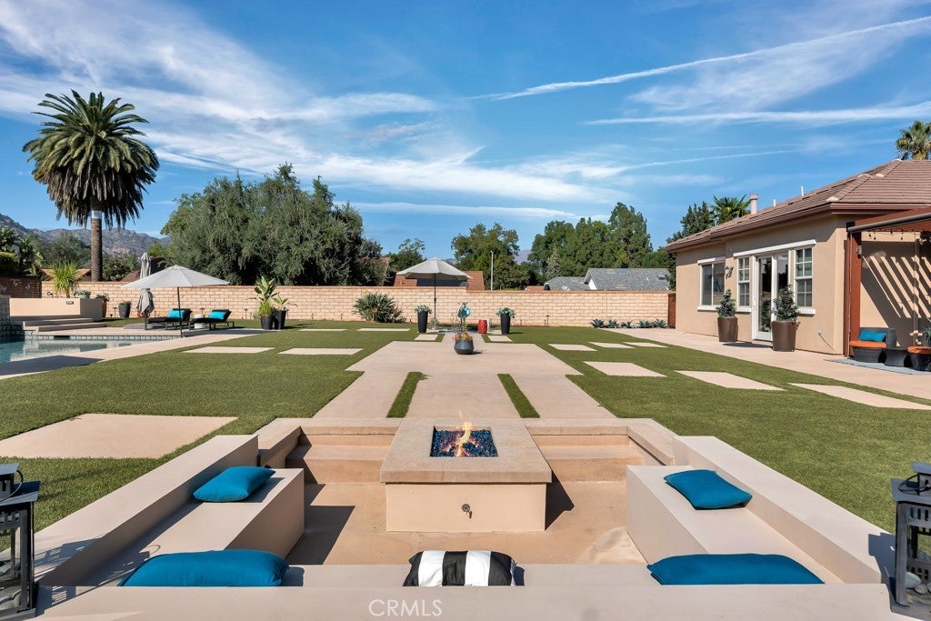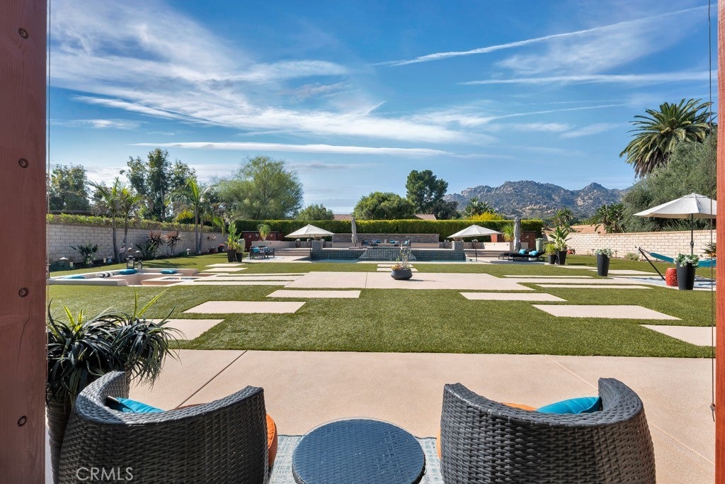 Welcome to this stunning Modern Tuscan single-story estate in the highly sought-after Rancho Paso Fino community of Chatsworth. Built in 2006 and once serving as one of the original model homes, this 5-bedroom, 3.5-bath residence offers 3,737 sq ft of designer living space on a nearly 20,000 sq ft lot. Every detail has been thoughtfully curated, blending timeless architecture with luxurious modern upgrades throughout. A private front courtyard with a cozy outdoor fireplace and lush landscaping creates a grand first impression, with potential for a beautiful water feature. Inside, a breathtaking grand foyer with soaring ceilings opens to the elegant family room with French doors to the courtyard and a formal dining room opposite the central hallway. The expansive living room features a gas fireplace and custom entertainment center, seamlessly connecting to the chef’s kitchen complete with top-of-the-line Monogram appliances, granite countertops, a large center island with sink, and stunning backyard views from every window. Additional highlights include a generous walk-in pantry and a butler’s pantry with a wine refrigerator and space for casual dining. The residential wing features three spacious guest bedrooms—one with direct courtyard access, ideal for a home office—two full bathrooms, and ample linen storage. The luxurious primary suite offers an electric fireplace, French doors to the backyard, a large walk-in closet, and a spa-inspired ensuite with dual vanities, a soaking tub, and a walk-in shower. A fifth bedroom near the entry provides flexibility as a guest suite, home office, or maid’s quarters, complete with an adjacent half bath. Outdoor living is truly resort-style, featuring a PebbleTec pool, sunken fire pit lounge, additional fire features, built-in BBQ pavilion, and exquisite landscaping with lighting throughout. The property also includes a two-car attached garage, a detached one-car garage currently used as a gym, and a side driveway with RV potential. Additional upgrades include bamboo plank ceilings, travertine flooring, a hard-wired camera system, and a whole-home audio system. Don’t miss this rare opportunity to own a fully upgraded Modern Tuscan estate in Rancho Paso Fino—just minutes from scenic horse trails, hiking paths, parks, and sweeping mountain views.