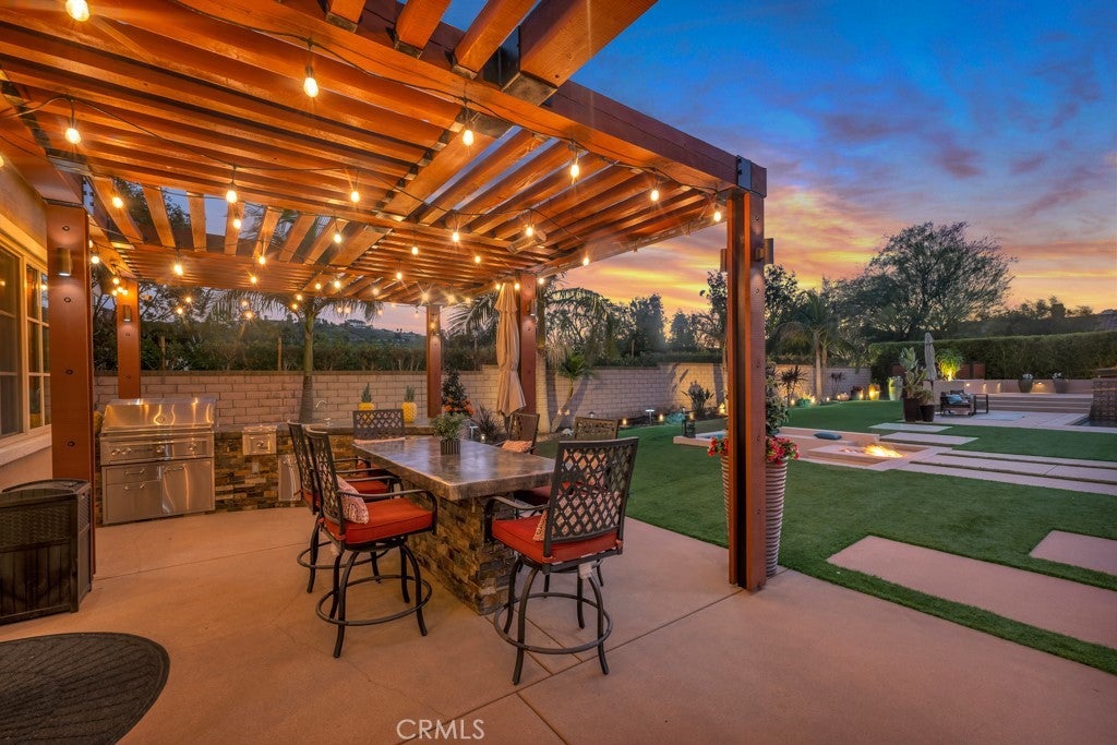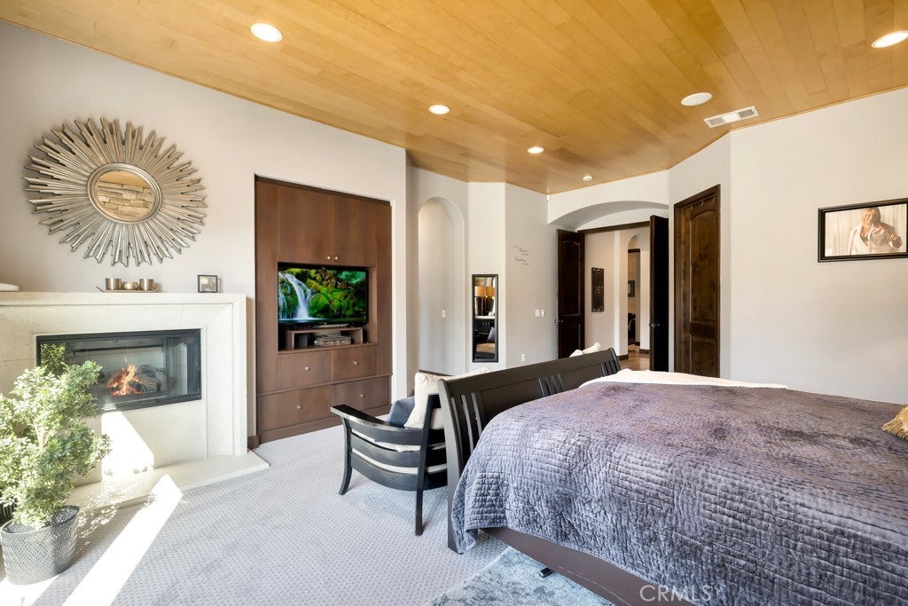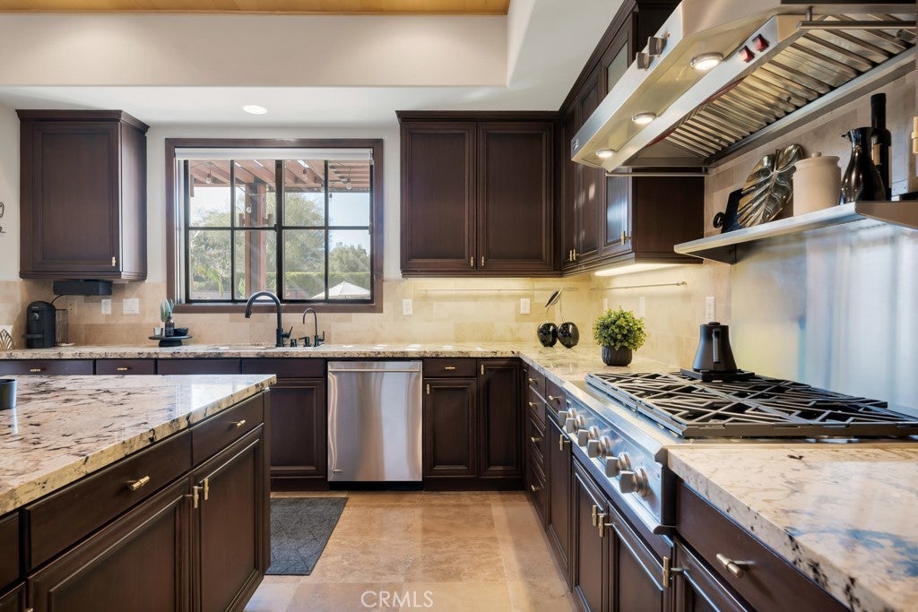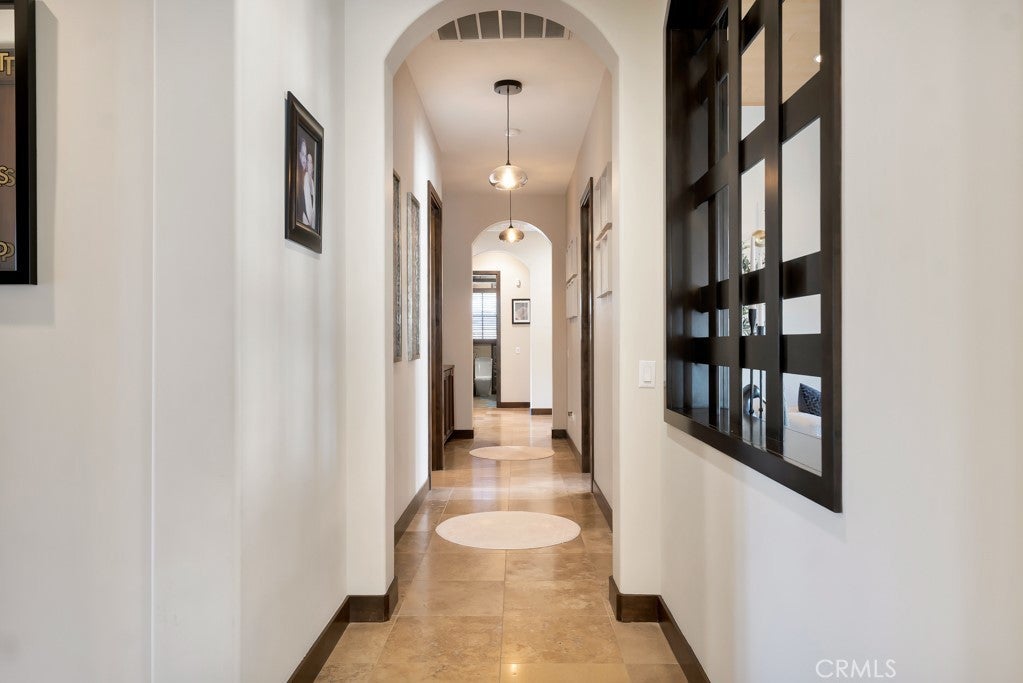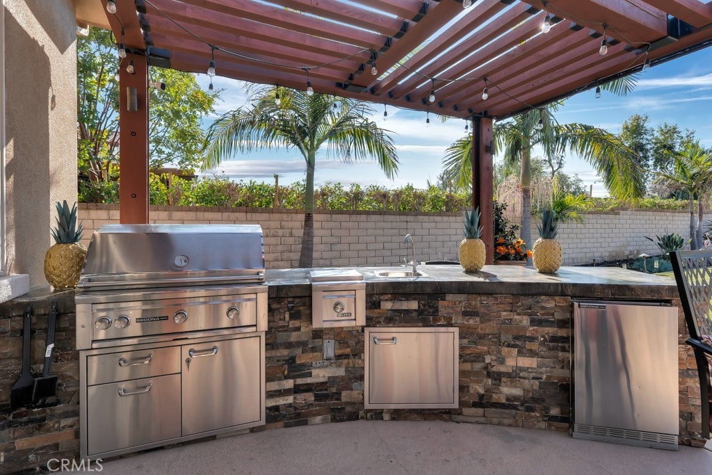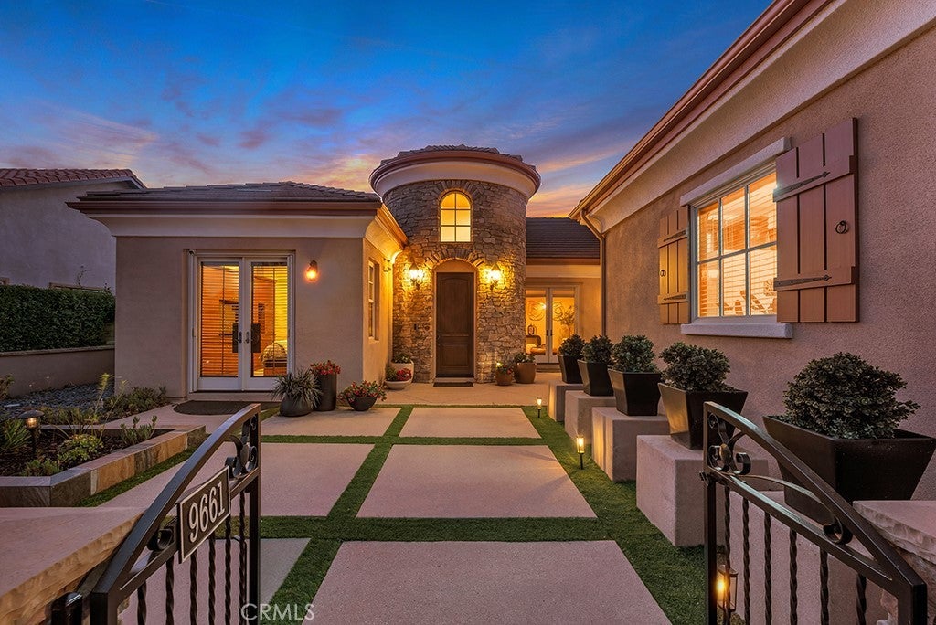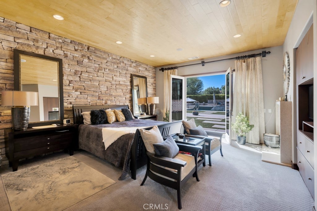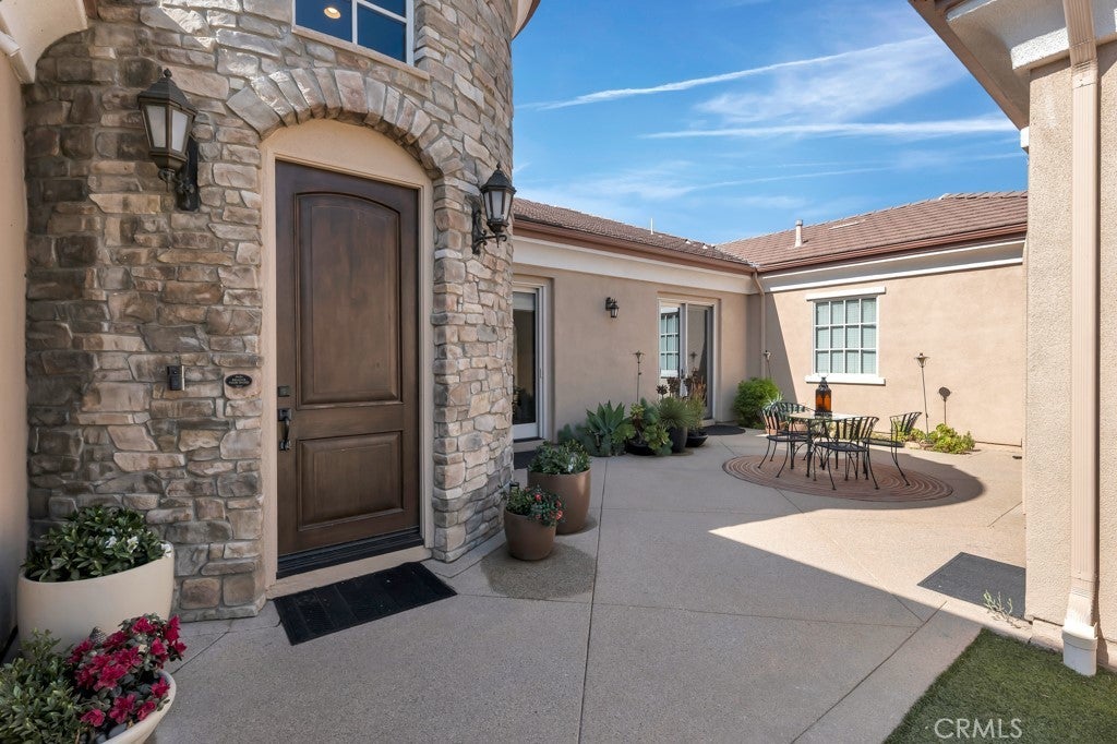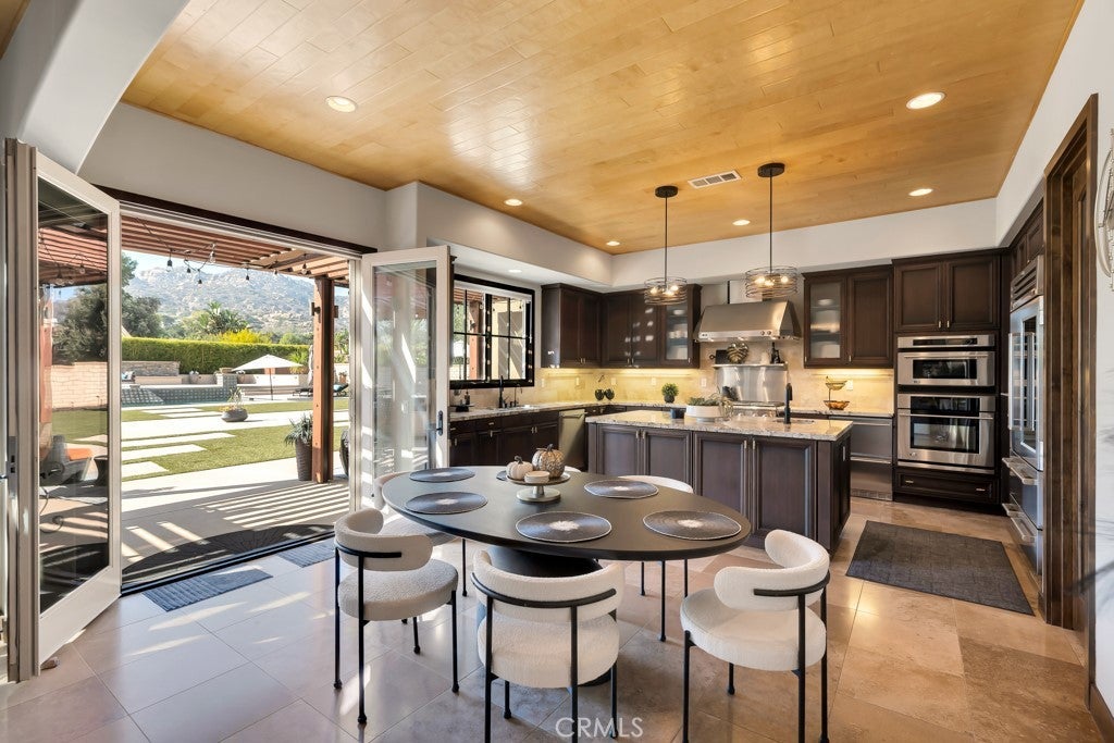 Welcome to this stunning Modern Tuscan single-story estate in the highly sought-after Rancho Paso Fino community of Chatsworth. Built in 2006 and once serving as one of the original model homes, this 5-bedroom, 3.5-bath residence offers 3,737 sq ft of designer living space on a nearly 20,000 sq ft lot. Every detail has been thoughtfully curated, blending timeless architecture with luxurious modern upgrades throughout. A private front courtyard with a cozy outdoor fireplace and lush landscaping creates a grand first impression, with potential for a beautiful water feature. Inside, a breathtaking grand foyer with soaring ceilings opens to the elegant family room with French doors to the courtyard and a formal dining room opposite the central hallway. The expansive living room features a gas fireplace and custom entertainment center, seamlessly connecting to the chef’s kitchen complete with top-of-the-line Monogram appliances, granite countertops, a large center island with sink, and stunning backyard views from every window. Additional highlights include a generous walk-in pantry and a butler’s pantry with a wine refrigerator and space for casual dining. The residential wing features three spacious guest bedrooms—one with direct courtyard access, ideal for a home office—two full bathrooms, and ample linen storage. The luxurious primary suite offers an electric fireplace, French doors to the backyard, a large walk-in closet, and a spa-inspired ensuite with dual vanities, a soaking tub, and a walk-in shower. A fifth bedroom near the entry provides flexibility as a guest suite, home office, or maid’s quarters, complete with an adjacent half bath. Outdoor living is truly resort-style, featuring a PebbleTec pool, sunken fire pit lounge, additional fire features, built-in BBQ pavilion, and exquisite landscaping with lighting throughout. The property also includes a two-car attached garage, a detached one-car garage currently used as a gym, and a side driveway with RV potential. Additional upgrades include bamboo plank ceilings, travertine flooring, a hard-wired camera system, and a whole-home audio system. Don’t miss this rare opportunity to own a fully upgraded Modern Tuscan estate in Rancho Paso Fino—just minutes from scenic horse trails, hiking paths, parks, and sweeping mountain views.