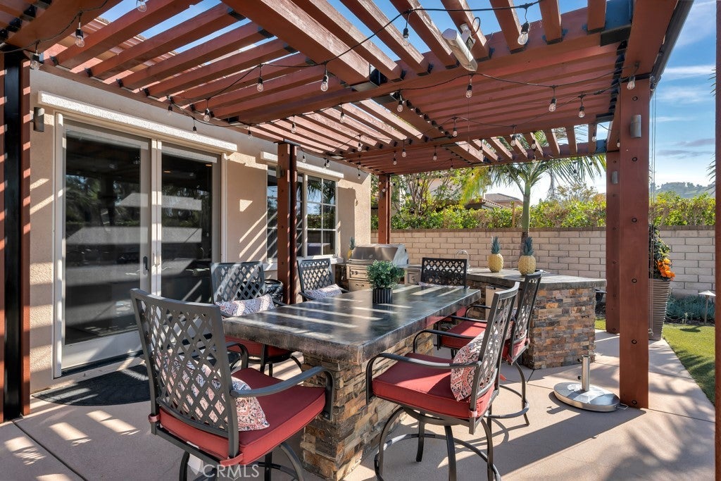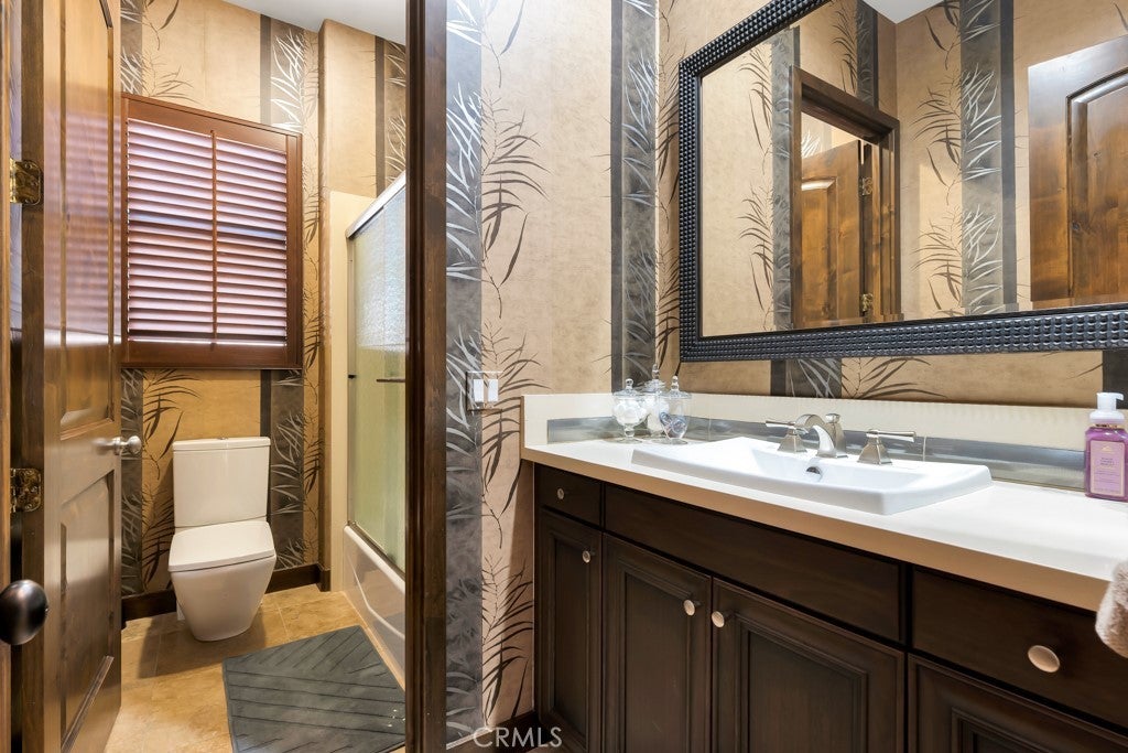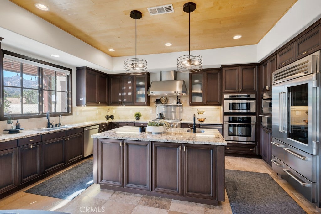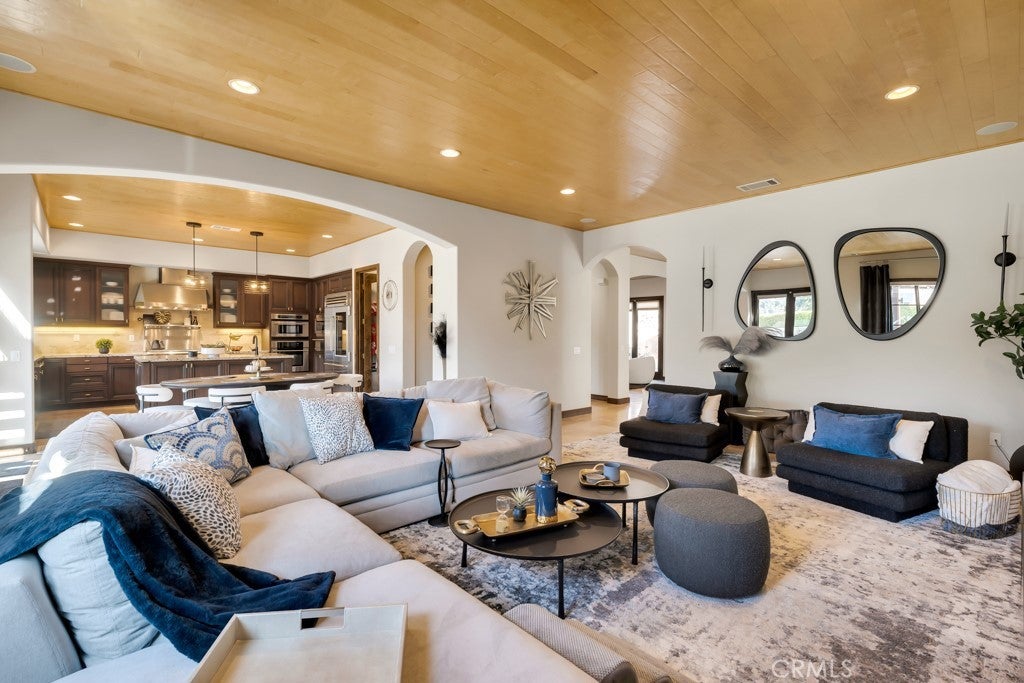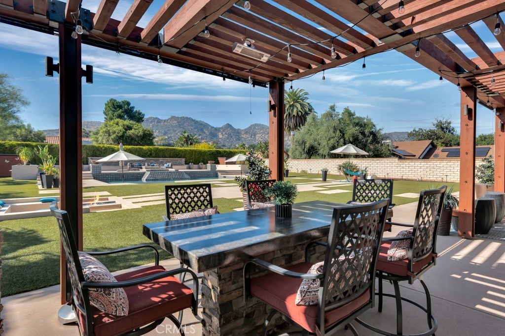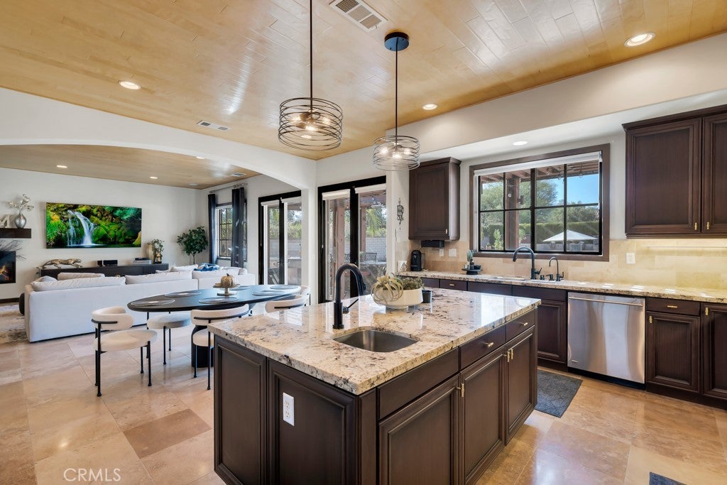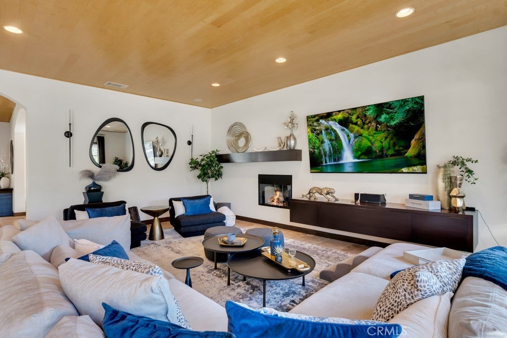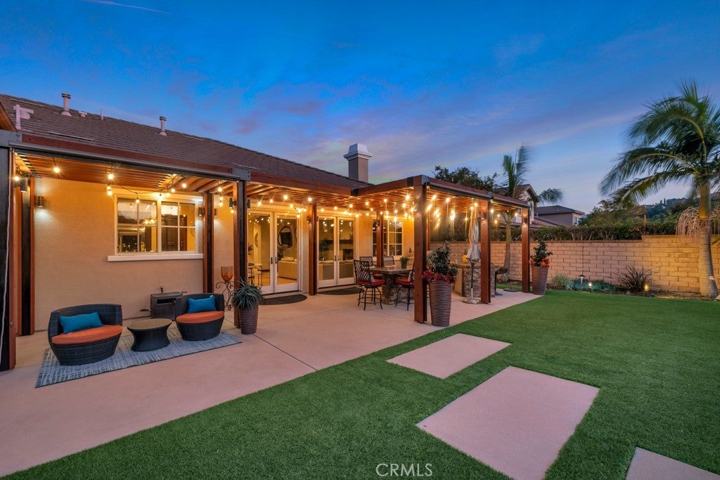 Welcome to this stunning Modern Tuscan single-story estate in the highly sought-after Rancho Paso Fino community of Chatsworth. Built in 2006 and once serving as one of the original model homes, this 5-bedroom, 3.5-bath residence offers 3,737 sq ft of designer living space on a nearly 20,000 sq ft lot. Every detail has been thoughtfully curated, blending timeless architecture with luxurious modern upgrades throughout. A private front courtyard with a cozy outdoor fireplace and lush landscaping creates a grand first impression, with potential for a beautiful water feature. Inside, a breathtaking grand foyer with soaring ceilings opens to the elegant family room with French doors to the courtyard and a formal dining room opposite the central hallway. The expansive living room features a gas fireplace and custom entertainment center, seamlessly connecting to the chef’s kitchen complete with top-of-the-line Monogram appliances, granite countertops, a large center island with sink, and stunning backyard views from every window. Additional highlights include a generous walk-in pantry and a butler’s pantry with a wine refrigerator and space for casual dining. The residential wing features three spacious guest bedrooms—one with direct courtyard access, ideal for a home office—two full bathrooms, and ample linen storage. The luxurious primary suite offers an electric fireplace, French doors to the backyard, a large walk-in closet, and a spa-inspired ensuite with dual vanities, a soaking tub, and a walk-in shower. A fifth bedroom near the entry provides flexibility as a guest suite, home office, or maid’s quarters, complete with an adjacent half bath. Outdoor living is truly resort-style, featuring a PebbleTec pool, sunken fire pit lounge, additional fire features, built-in BBQ pavilion, and exquisite landscaping with lighting throughout. The property also includes a two-car attached garage, a detached one-car garage currently used as a gym, and a side driveway with RV potential. Additional upgrades include bamboo plank ceilings, travertine flooring, a hard-wired camera system, and a whole-home audio system. Don’t miss this rare opportunity to own a fully upgraded Modern Tuscan estate in Rancho Paso Fino—just minutes from scenic horse trails, hiking paths, parks, and sweeping mountain views.