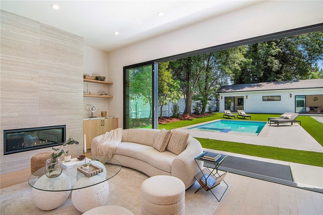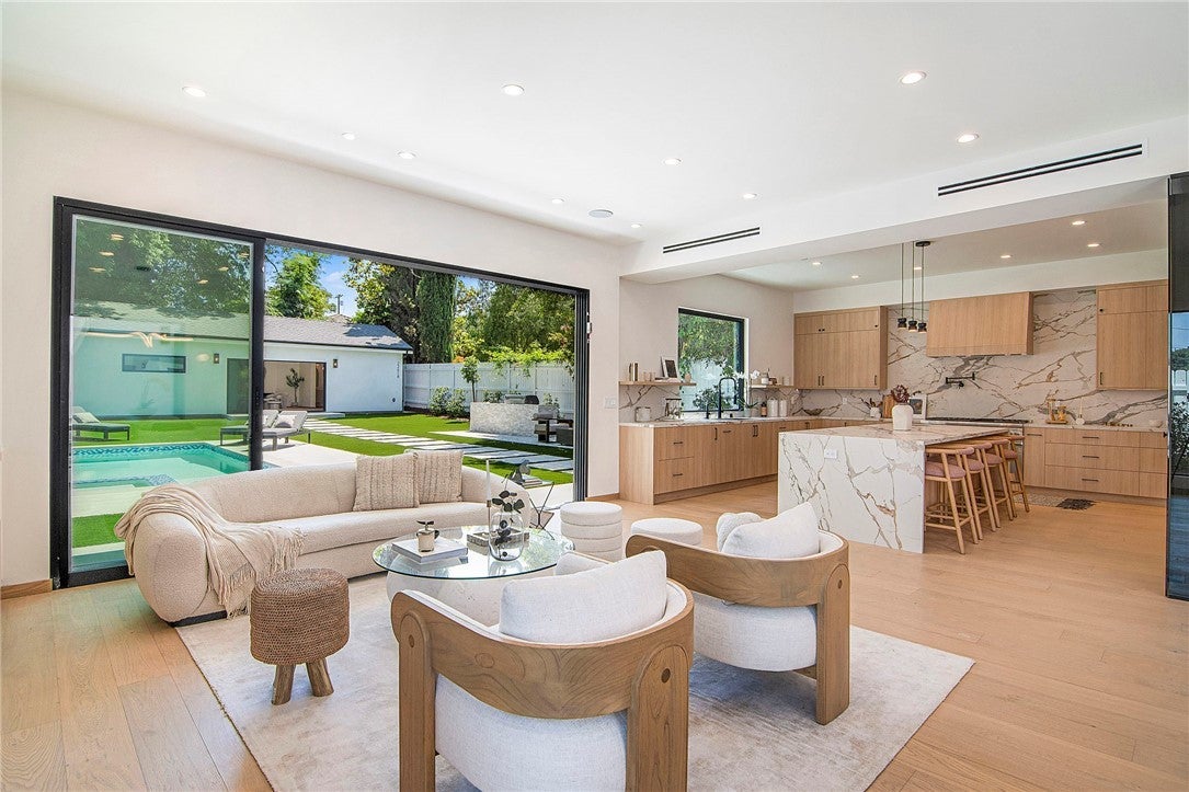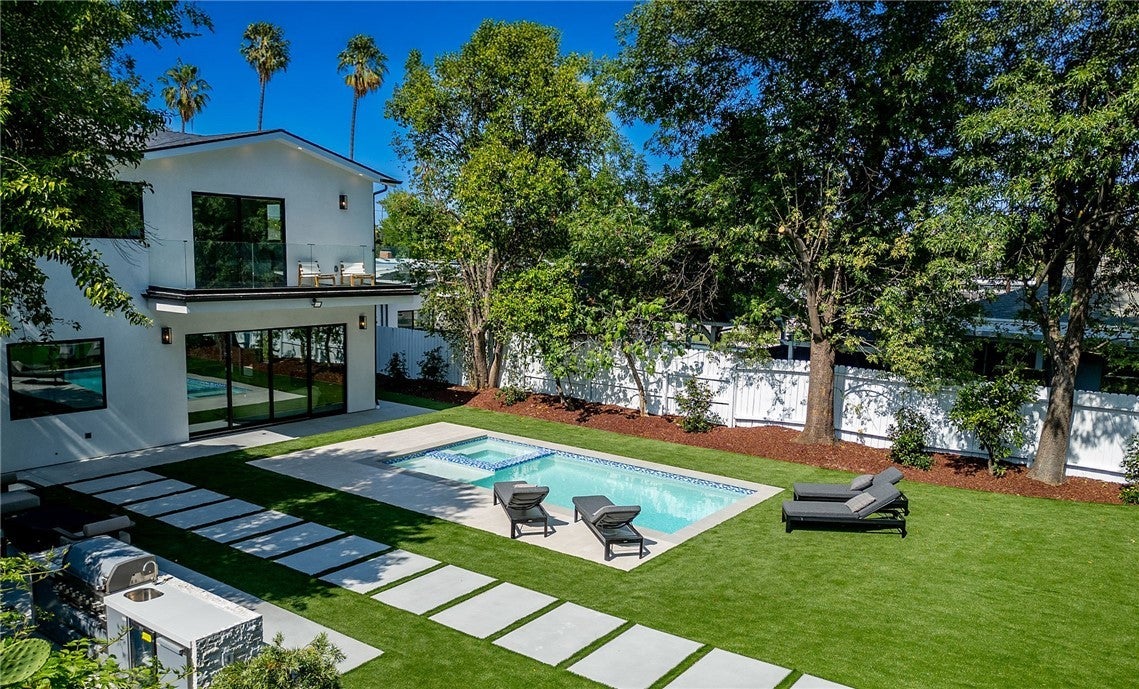 Don't wait for Open Houses to see....call any time for appointment! Newly completed, this property is a rare blend of luxury, privacy---crafted with designer finishes, and sleek, modern materials throughout both the main residence and the legally permitted ADU (with its own address). Step inside the stunning main house to discover 9’10” high ceilings, surround-sound speakers, designer lighting, solid oak doors, Roman stone accents and wooden flooring. The chef’s kitchen features top-of-the-line Thermador appliances, porcelain countertops, immense pantry and other thoughtful storage solutions. With an open floor plan, the kitchen flows seamlessly into the living room (with a gas fireplace), and the dining that opens to the interior patio. Every modern upgrade has been considered: dual hv/ac systems with separate thermostats, solar panels, tankless water heater, EV wiring, new electrical & plumbing throughout. The primary suite is a retreat, featuring a private balcony overlooking the backyard, a cozy gas fireplace, a huge walk-in closet, and a spa-inspired bathroom complete with soaking tub and a luxurious dual-entry shower. All four bedrooms are ensuite; and the ADU offers an additional 2 bedrooms, 2 bathrooms, living room with electric fireplace, full kitchen and in-unit laundry. Step outside to enjoy the landscaped backyard--featuring a sprawling lawn, brand-new pool and spa, a fire pit, and a built-in outdoor kitchen. Nestled in a family-friendly neighborhood just moments from premier shopping and dining at The Village, Westfield Topanga, and Calabasas Commons; and zoned for top-rated El Camino Real and Hale Charter Schools.