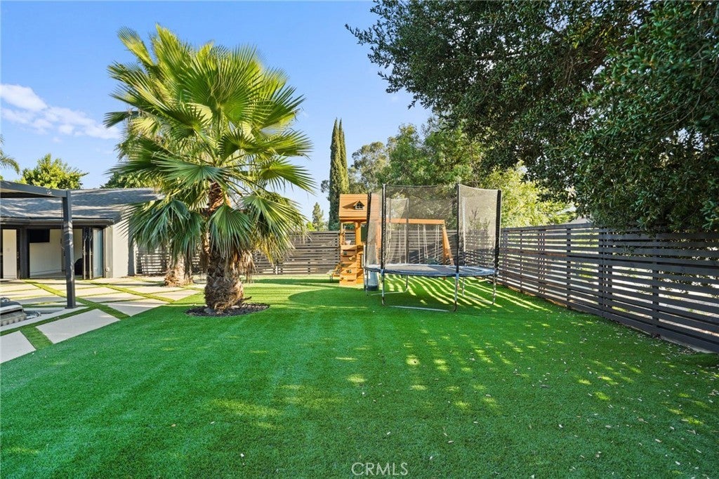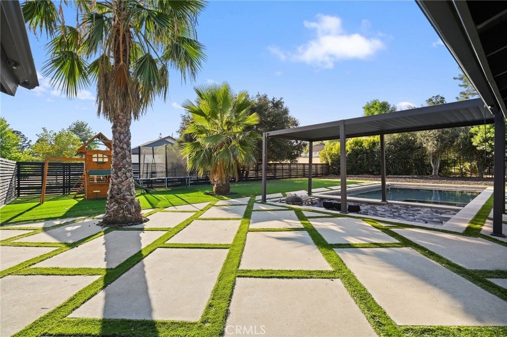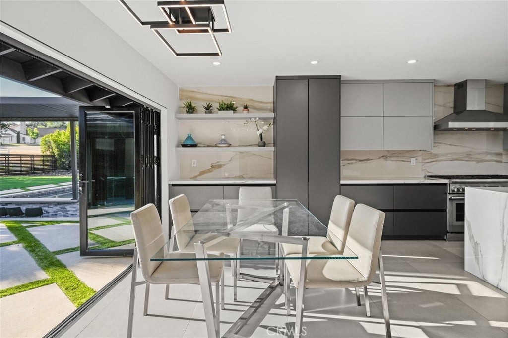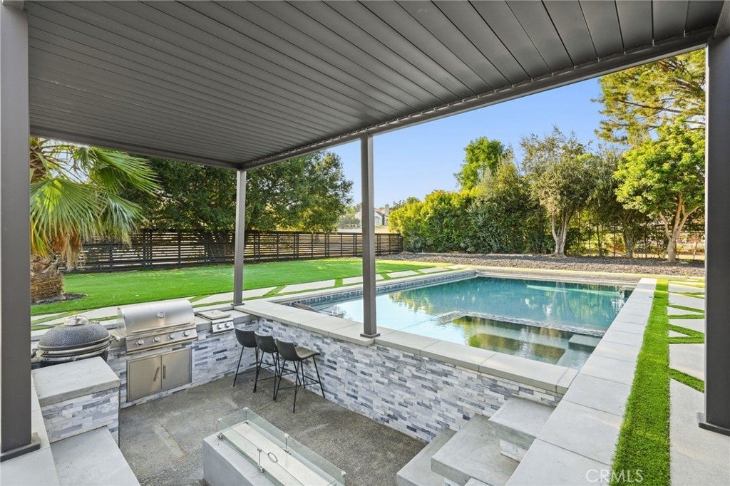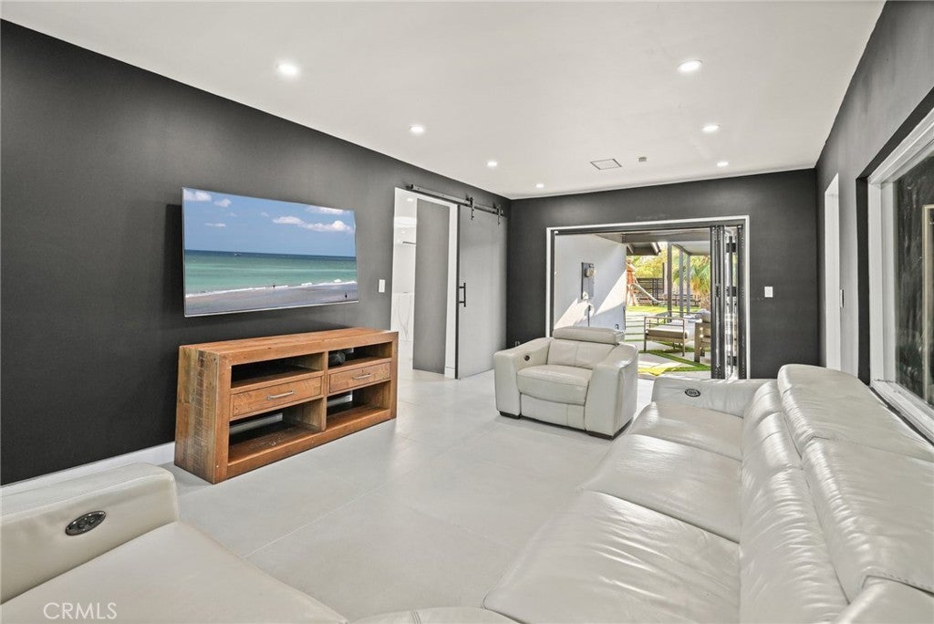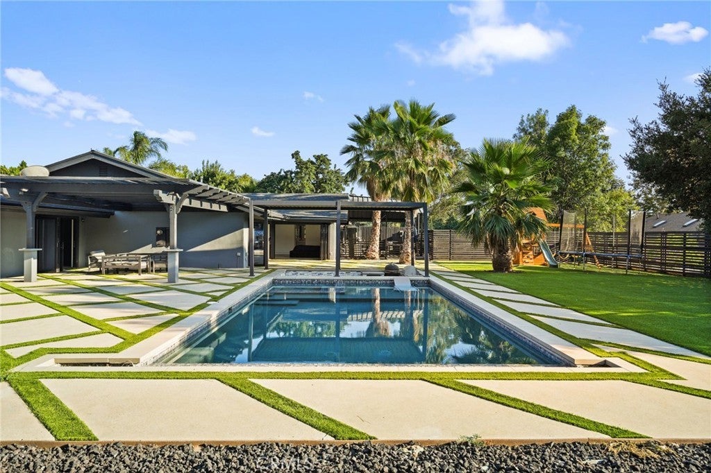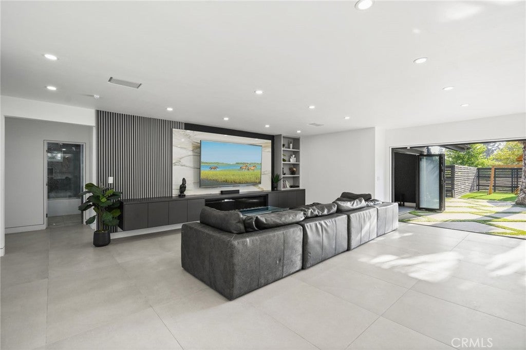 Picture-Perfect Modern Estate in Prime Chatsworth Neighborhood with ADU Potential! Welcome to this sprawling, single-story showpiece located in one of Chatsworth's most sought-after neighborhoods. Designed with a sleek, modern aesthetic, this minimalistic contemporary residence showcases minimalist interior finishes and exceptional craftsmanship throughout. Step into a seamless open floor plan where the living room impresses with a custom TV wall featuring built-in cabinetry, a dramatic slab backdrop, and a sleek electric fireplace. A full wall of windows floods the space with natural light, beautifully complementing the European grey tile floors, and modern finish throughout. The space flows effortlessly into a chef’s dream kitchen outfitted with a massive waterfall island, two-tone matte lacquer cabinetry, quartz countertops, and top-of-the-line Thermador appliances, including a built-in fridge and open shelving. Accordion-style glass pivot doors blur the lines between indoor and outdoor living, opening wide to reveal a resort-style backyard. Set on a massive, usable lot, the outdoor space is your private oasis, complete with modern landscaping, a sparkling pool and spa, sunken fire pit, built-in barbecue center with a Big Green Egg, and HUGE turf and concrete areas. The lot also includes RV access and ample space for an ADU. A dedicated pet-friendly area with privacy fencing ensures your furry friends have their own secure sanctuary. This 4-bedroom, 2.5-bathroom home features a luxurious primary suite reminiscent of a five-star resort. Enjoy serene backyard views through retractable accordion doors, and unwind in the spa-inspired en-suite bathroom adorned with 24”x48” porcelain tiles, black-veined accents, a massive walk-in shower with dual rain showers, and his-and-hers vanities. A spacious walk-in closet completes this dream retreat. Additional highlights include: Designer ocean-blue tiled guest bathroom with floating vanity and tub/shower combo. A private half bath in the fourth bedroom, perfect for guests or office use. Bonus family/media room adjacent to the kitchen, ideal for movie nights. 3-car garage with window views into the home and direct access to the living area. Whether you’re entertaining, relaxing, or envisioning future expansion with an ADU, this home delivers on every level. Don’t miss the opportunity to own this exceptional property in one of the Valley’s most desirable communities!