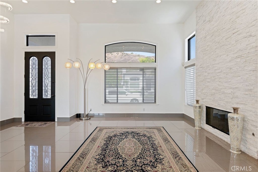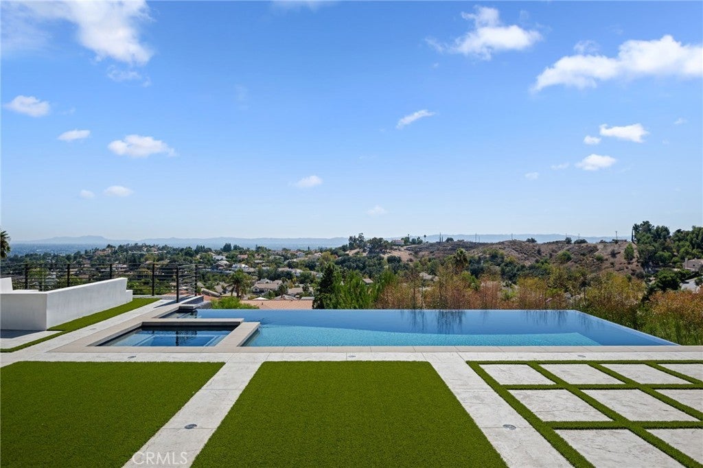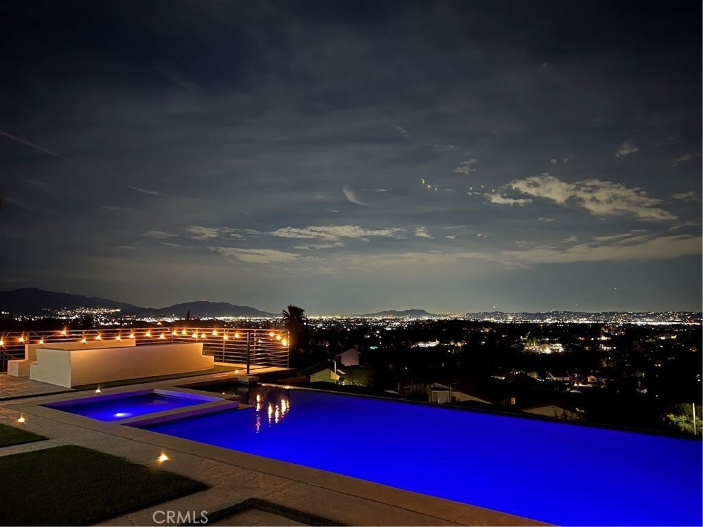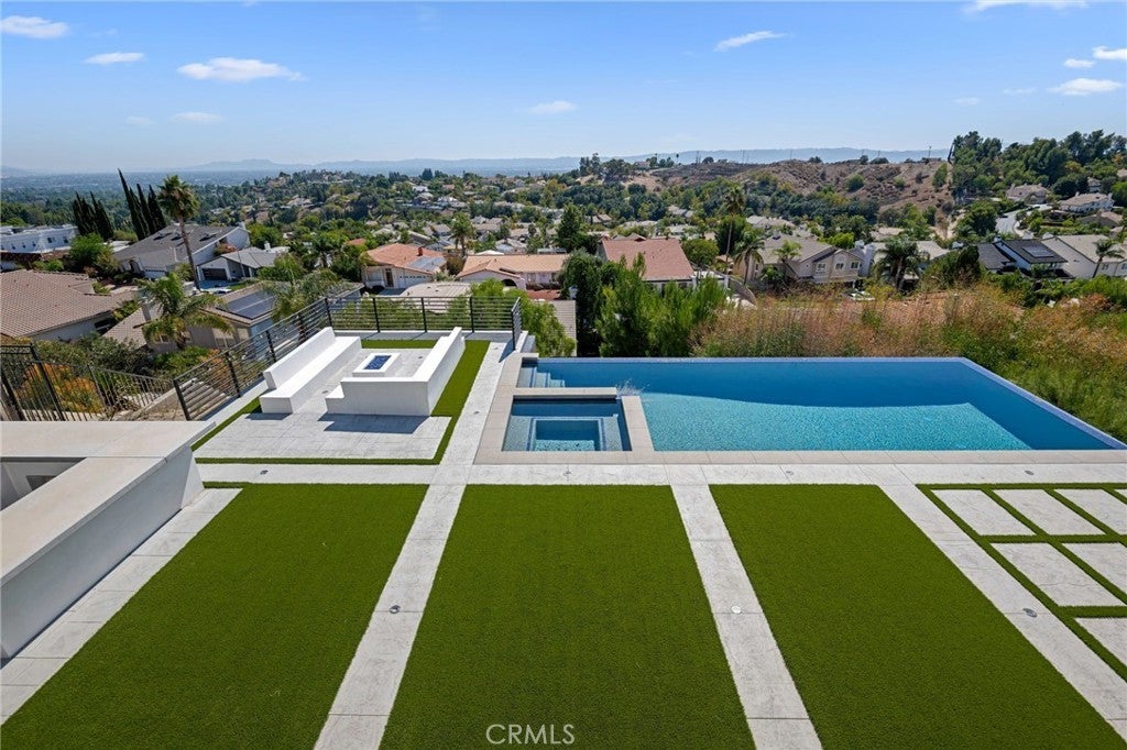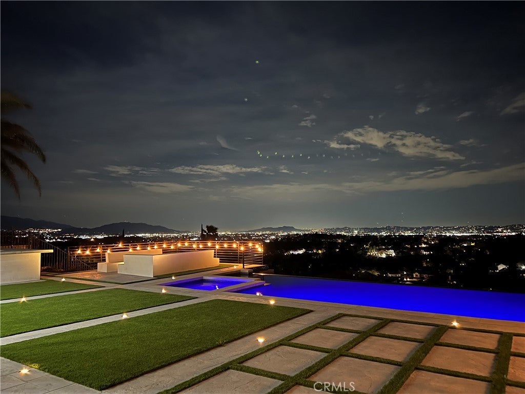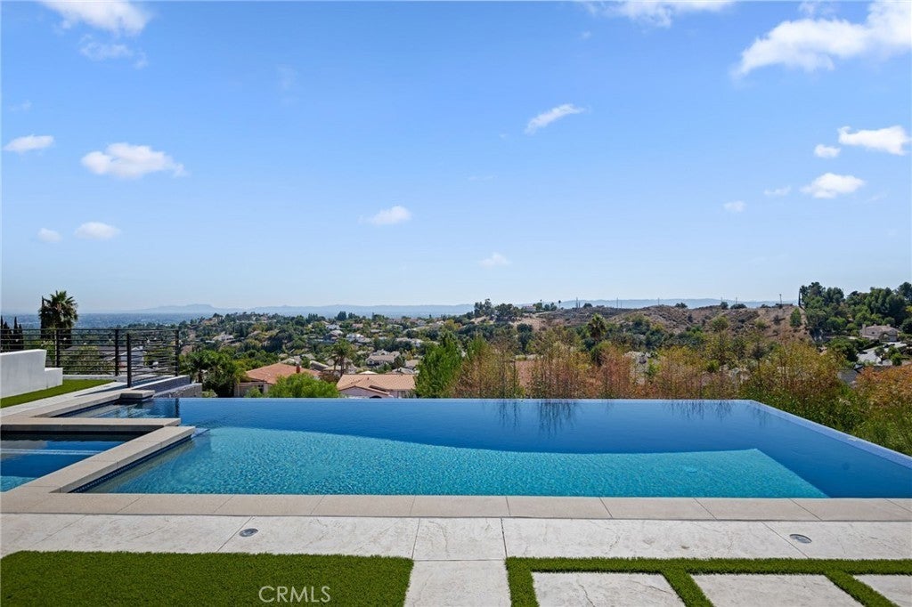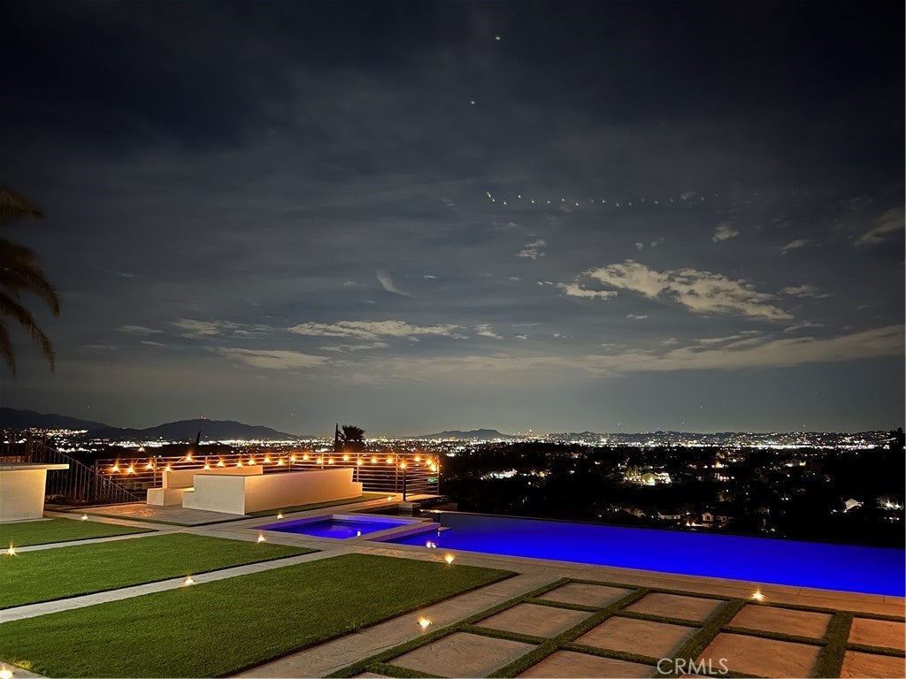 Masterpiece of Modern Luxury and Timeless Elegance! Step into a world of refined sophistication and breathtaking beauty at this exquisitely remodeled estate, perfectly situated to capture panoramic views of the San Fernando Valley and beyond. From the moment you enter through the custom front door, the grand entrance sets the tone for the luxury that awaits. The opulent living room greets you with custom stone flooring and a striking stone fireplace, offering a warm and elegant ambiance. Adjacent, the formal dining room seamlessly connects for effortless entertaining, making every gathering a special occasion. At the heart of the home lies a true chef’s kitchen – a culinary dream outfitted with top-of-the-line stainless steel appliances, double ovens, a built-in microwave, and quartz countertops with a waterfall edge. The oversized island is ideal for casual dining or hosting, while a walk-in pantry and window showcasing mountain and city light views complete the space. The spacious family room features soaring ceilings, recessed lighting, and a custom stone accent wall with a built-in fireplace. A sleek custom slider opens to your private backyard oasis, blurring the line between indoor and outdoor living. On the main level, a full bathroom with a custom shower adds both convenience and luxury. Ascend the custom wood staircase, accented by a stunning marble wall, to discover the primary suite – a true sanctuary. Enjoy your own private balcony with sweeping, floor-to-ceiling views of the valley and city below. The spa-inspired en-suite bathroom has been fully reimagined with a soaking tub, luxurious stone finishes, and a serene atmosphere perfect for unwinding. The upper level also offers an expansive loft with uninterrupted panoramic views, ideal for a media space, home office, or additional lounge. A downstairs indoor laundry room and energy-efficient solar panels add practical comfort to the home’s abundant style. Show-stopping backyard is an entertainer’s dream. Dive into the custom infinity pool and spa, gather around the fire pit, or prepare a meal in the custom outdoor kitchen. Multiple sitting areas, additional fire features, and lush landscaping complete this ultimate resort-style retreat. This home is a private escape where luxury, design, and natural beauty converge. Experience the pinnacle of Southern California living in this one-of-a-kind estate that delivers elegance, comfort, and unmatched views in every direction.