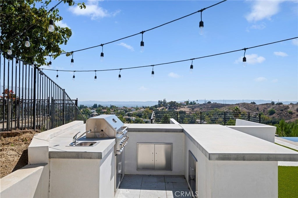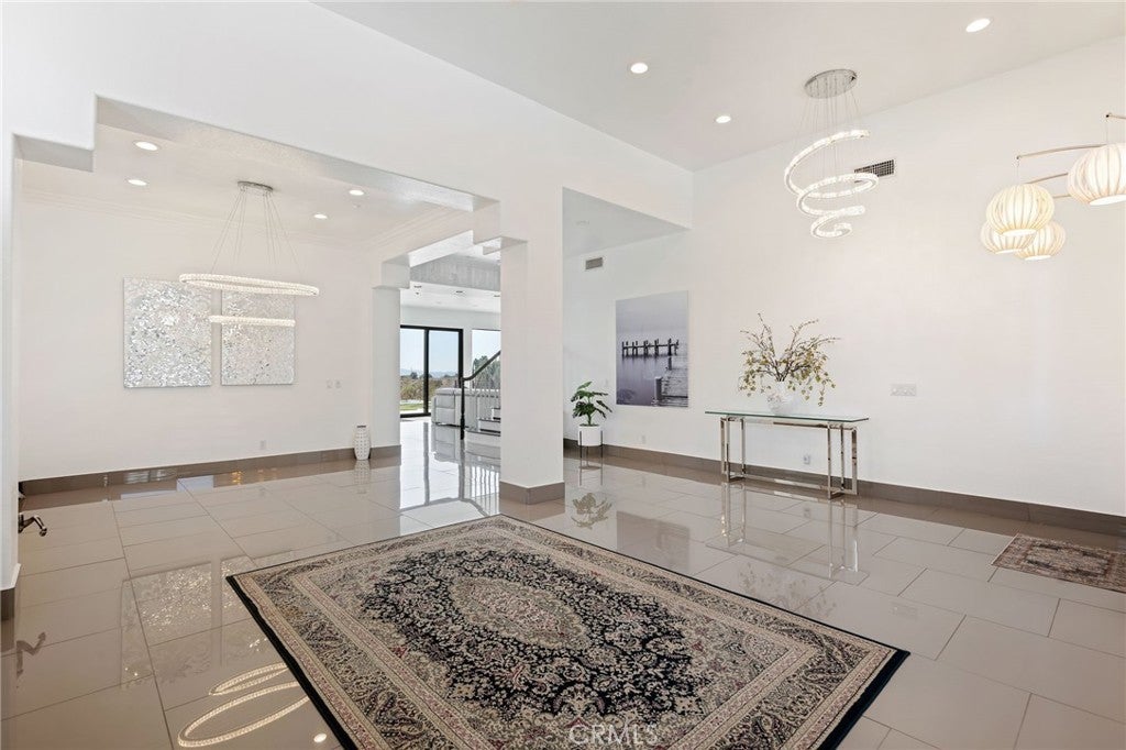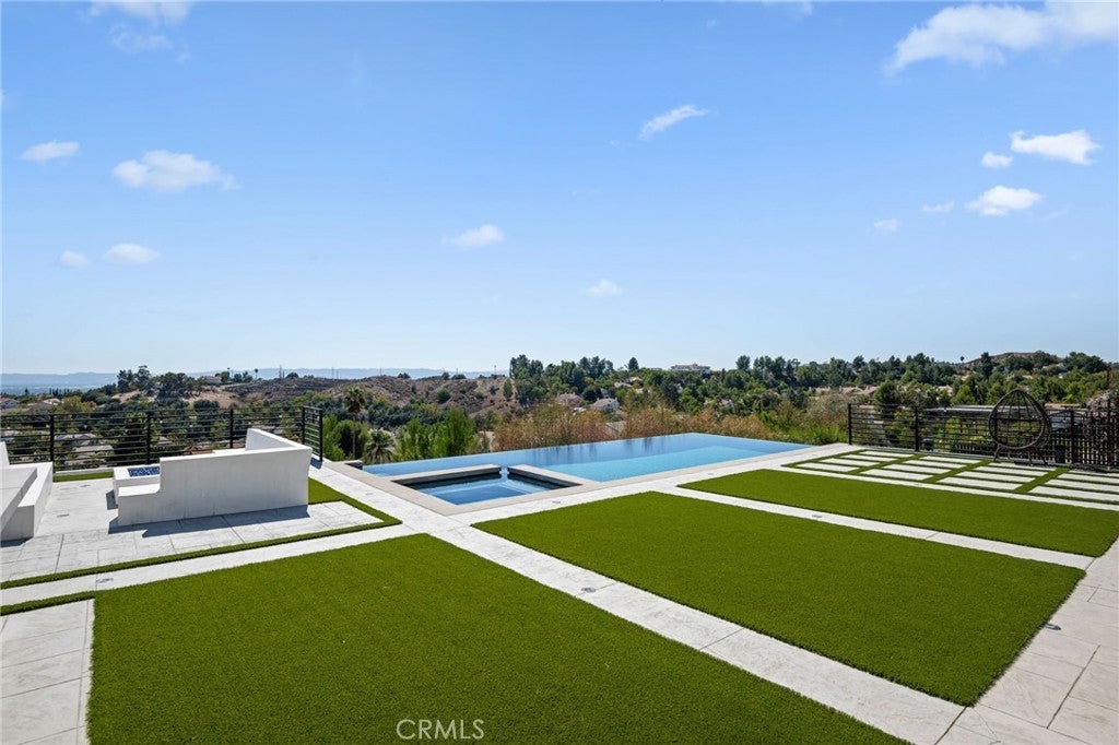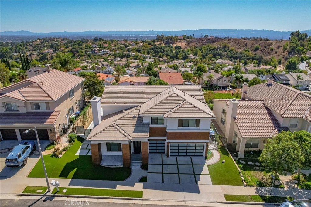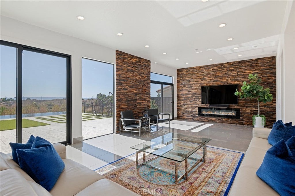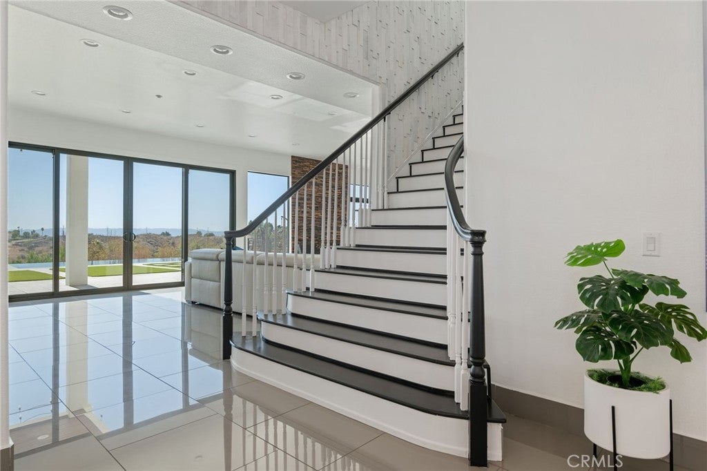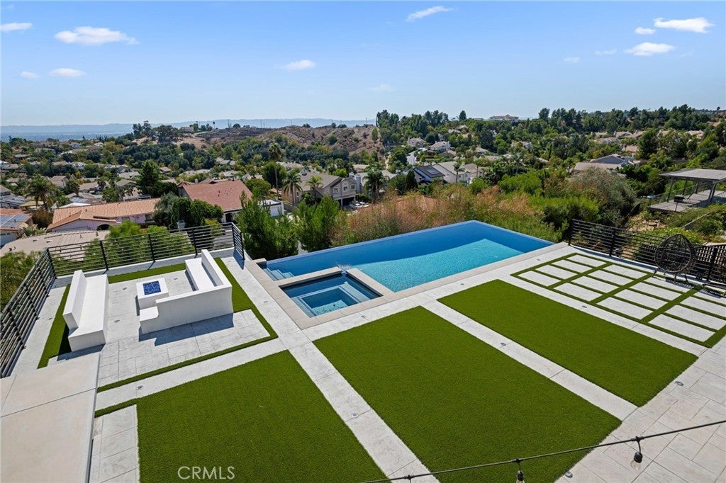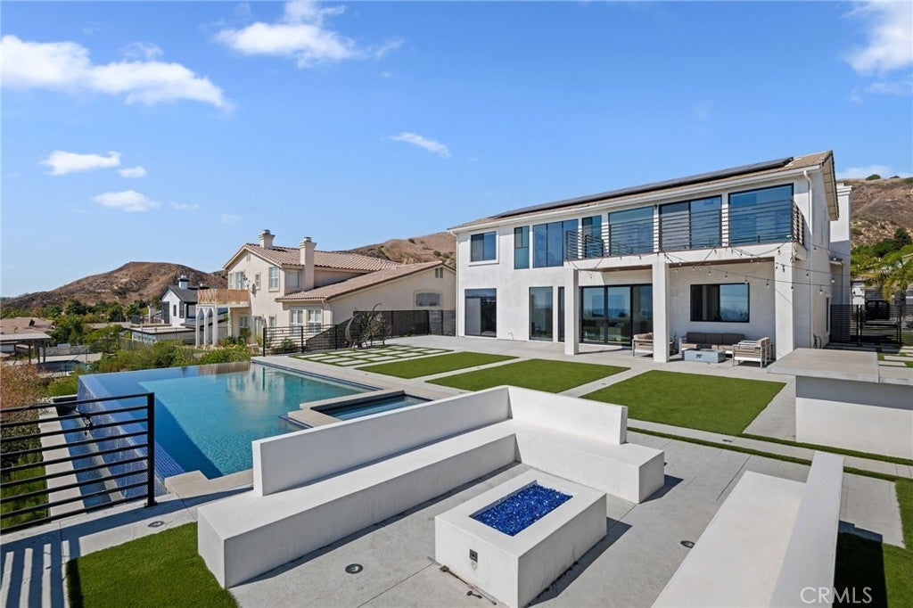 Masterpiece of Modern Luxury and Timeless Elegance! Step into a world of refined sophistication and breathtaking beauty at this exquisitely remodeled estate, perfectly situated to capture panoramic views of the San Fernando Valley and beyond. From the moment you enter through the custom front door, the grand entrance sets the tone for the luxury that awaits. The opulent living room greets you with custom stone flooring and a striking stone fireplace, offering a warm and elegant ambiance. Adjacent, the formal dining room seamlessly connects for effortless entertaining, making every gathering a special occasion. At the heart of the home lies a true chef’s kitchen – a culinary dream outfitted with top-of-the-line stainless steel appliances, double ovens, a built-in microwave, and quartz countertops with a waterfall edge. The oversized island is ideal for casual dining or hosting, while a walk-in pantry and window showcasing mountain and city light views complete the space. The spacious family room features soaring ceilings, recessed lighting, and a custom stone accent wall with a built-in fireplace. A sleek custom slider opens to your private backyard oasis, blurring the line between indoor and outdoor living. On the main level, a full bathroom with a custom shower adds both convenience and luxury. Ascend the custom wood staircase, accented by a stunning marble wall, to discover the primary suite – a true sanctuary. Enjoy your own private balcony with sweeping, floor-to-ceiling views of the valley and city below. The spa-inspired en-suite bathroom has been fully reimagined with a soaking tub, luxurious stone finishes, and a serene atmosphere perfect for unwinding. The upper level also offers an expansive loft with uninterrupted panoramic views, ideal for a media space, home office, or additional lounge. A downstairs indoor laundry room and energy-efficient solar panels add practical comfort to the home’s abundant style. Show-stopping backyard is an entertainer’s dream. Dive into the custom infinity pool and spa, gather around the fire pit, or prepare a meal in the custom outdoor kitchen. Multiple sitting areas, additional fire features, and lush landscaping complete this ultimate resort-style retreat. This home is a private escape where luxury, design, and natural beauty converge. Experience the pinnacle of Southern California living in this one-of-a-kind estate that delivers elegance, comfort, and unmatched views in every direction.