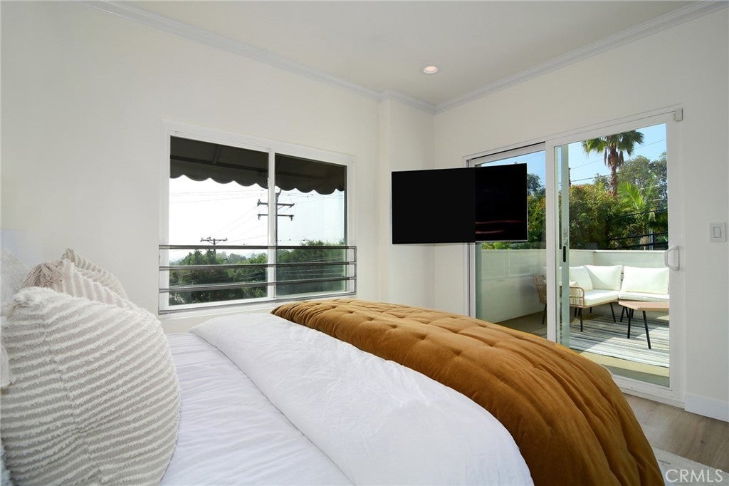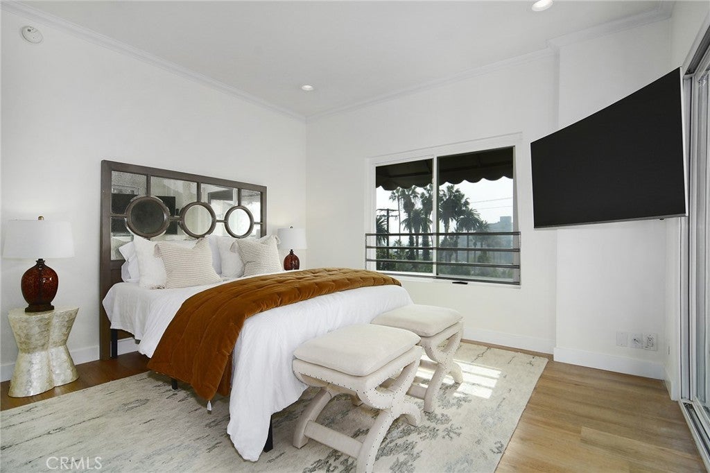VIEWS VIEWS VIEWS! Prime Location in a SECURE GATED BUILDING W/UNDERGROUND PARKING & IN UNIT LAUNDRY. Perfectly positioned between Sunset Boulevard and Santa Monica Boulevard, this exceptional townhome-style residence sits right in the heart of everything West Hollywood has to offer—yet feels worlds away from it all. You’ll enjoy the convenience of being just moments from world-class dining, nightlife, shopping, and entertainment, all while tucked into a quiet, ultra-private complex with no street noise. This intimate community features very little turnover, making this a rare opportunity to own in one of West Hollywood’s most sought-after low-density buildings. Unit 205 is ideally located at the rear of the complex, ensuring peace and privacy. Unlike typical condos, this two-story townhome layout offers the feeling and flow of a single-family home. The open, light-filled floor plan feels spacious and voluminous, with large windows, PRIVATE BALCONY FROM THE LIVING AREA, and bright exposures throughout. Featuring Stylish Interiors & Thoughtful Design this home features two ensuite bedrooms, each with generous closet space, access to a PRIVATE BALCONY & JAW DROPPING CITY VIEWS.The primary suite enjoys excellent natural light, while both bedrooms provide privacy and comfort. The interior is fresh, move-in ready, and filled with storage, ideal for effortless living.