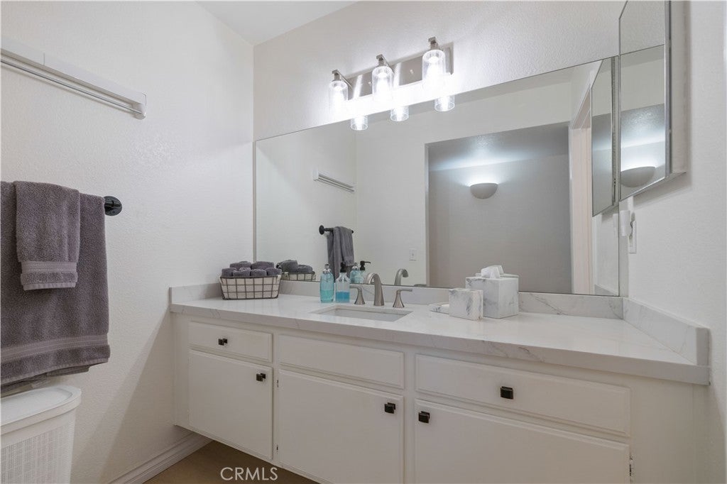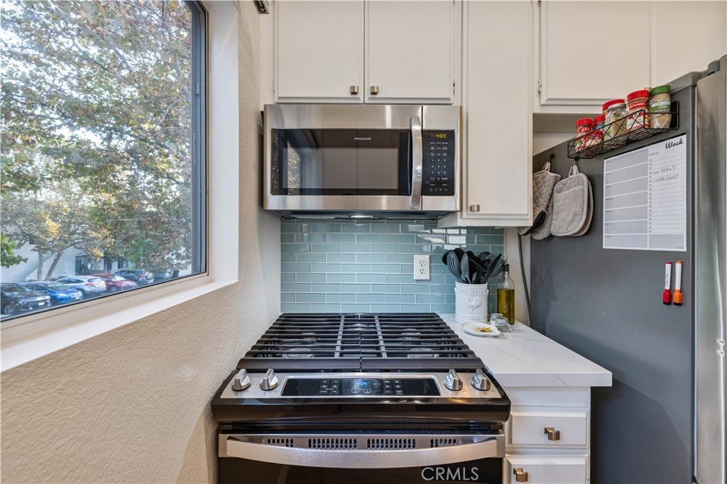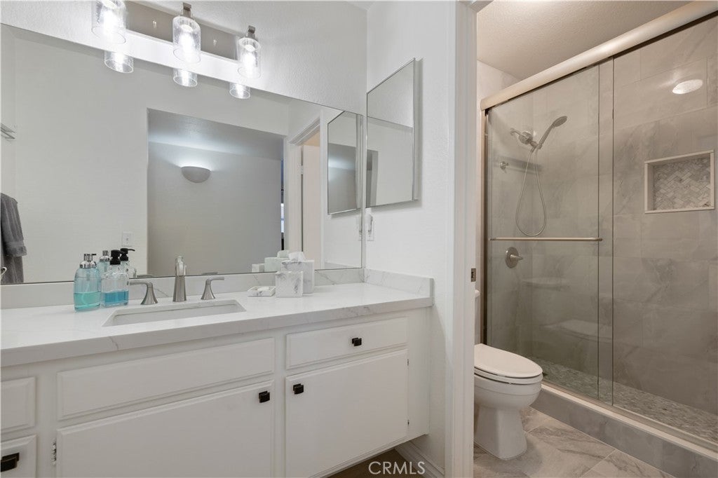 Top of the Mountain Enclave in SCV. Upper 3-bedroom/2 bath - Upgraded and Remodeled Private Corner unit. No one below so upgraded commercial grade woodgrain Vinyl and tile flooring throughout! Walk into This light and bright unit with Vaulted ceilings. The kitchen has been updated with Stainless steel appliances and Quartz counters and sink. The kitchen has a great window overlooking the entry stairs and opens into the living area with entertainer’s patio right though the sliding glass doors. Off the dining area and across from the pantry is the laundry room with storage cabinets and folding area. The home features a premium suite with its own private patio and Full bath all remodeled with contemporary stone and tile finishes. 2 more generously sized bedrooms and a full mid-bath complete the interior. The 2-car garage is right below the unit and there is even an additional storage area off the garage. AS an added bonus the Heating /AC system and Water Heater were both recently replaced!! The Vista’s community has a ton of amenities with pools/spas, tennis and sports courts, parks, playground and BBQ facilities – room to play, relax or take a view inspired walk. Even Earthquake insurance is included with the dues. This top of the hill community is walking distance to the highly ranked (8/10 on Great Schools) Dr. J. Michael McGrath Elementary School – and has the easiest commuting access into the Greater LA area in all of Santa Clarita Valley! The best news. Seller is offering to help the buyer buy their rate down with a $5000 credit. See this one soon!