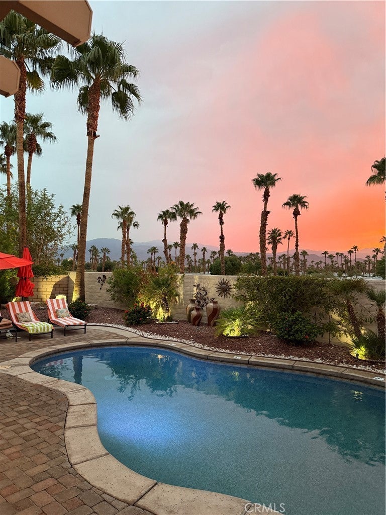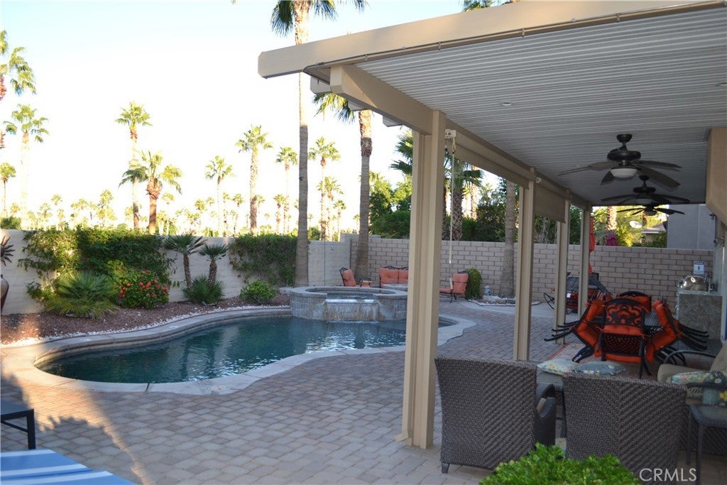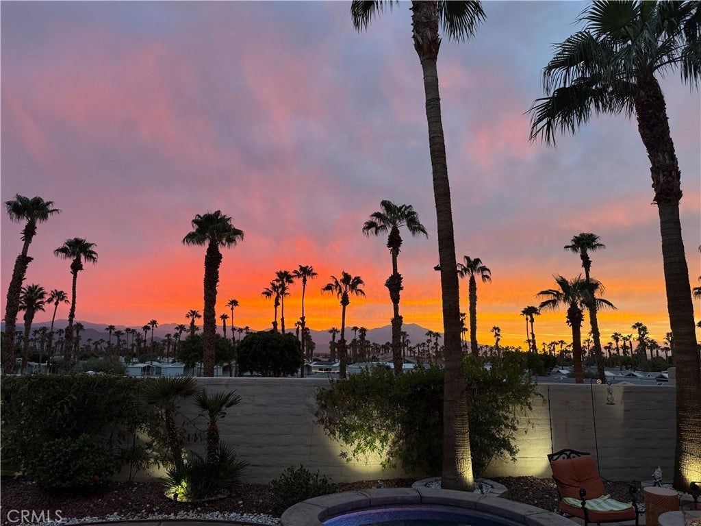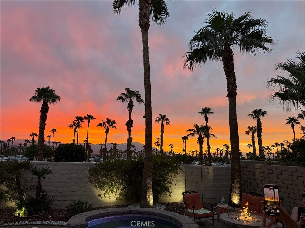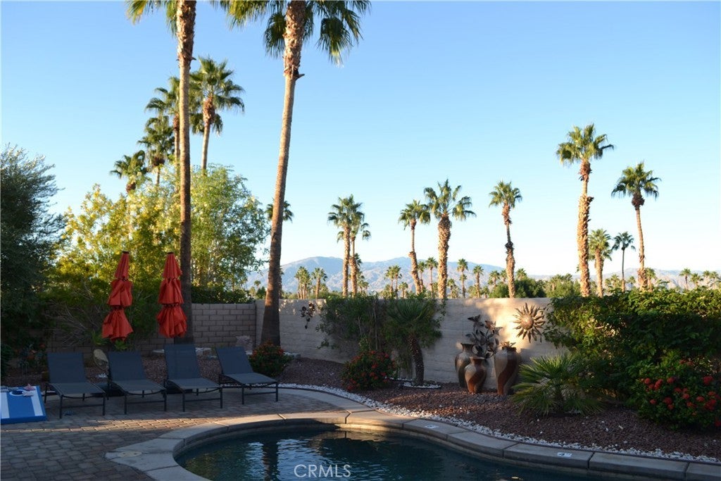 Welcome to Terra Lago! Luxurious 2-story home with 5 bedrooms, 2.5 baths, and a full-size saltwater pool & spa. Fully licensed STR with stunning mountain, sunset & city-light views. Bright open floor plan features great room with fireplace and upgraded entertainer’s kitchen with quartz counters, gold-trim cabinetry, custom backsplash, farmhouse sink, stainless appliances, new fridge, built-in cooktop & breakfast island. Large dining area with built-in credenza, wine & beverage fridges. Ceramic tile & luxury laminate flooring—no carpet! Motion lighting, surround sound & custom fixtures throughout. Private yard with pavers, covered patio w/misters & fans, outdoor shower, BBQ island, fire pit, and new pool heater. Beautifully landscaped front & back. Leased solar (removable) plus 2-car garage & golf-cart space. Your desert oasis awaits!