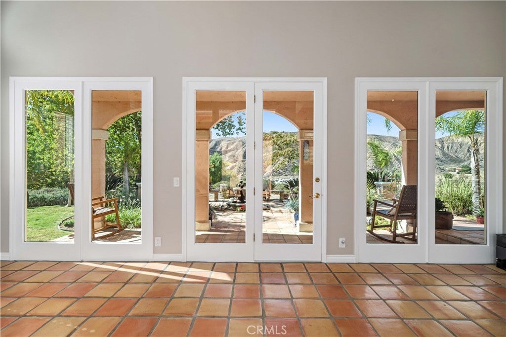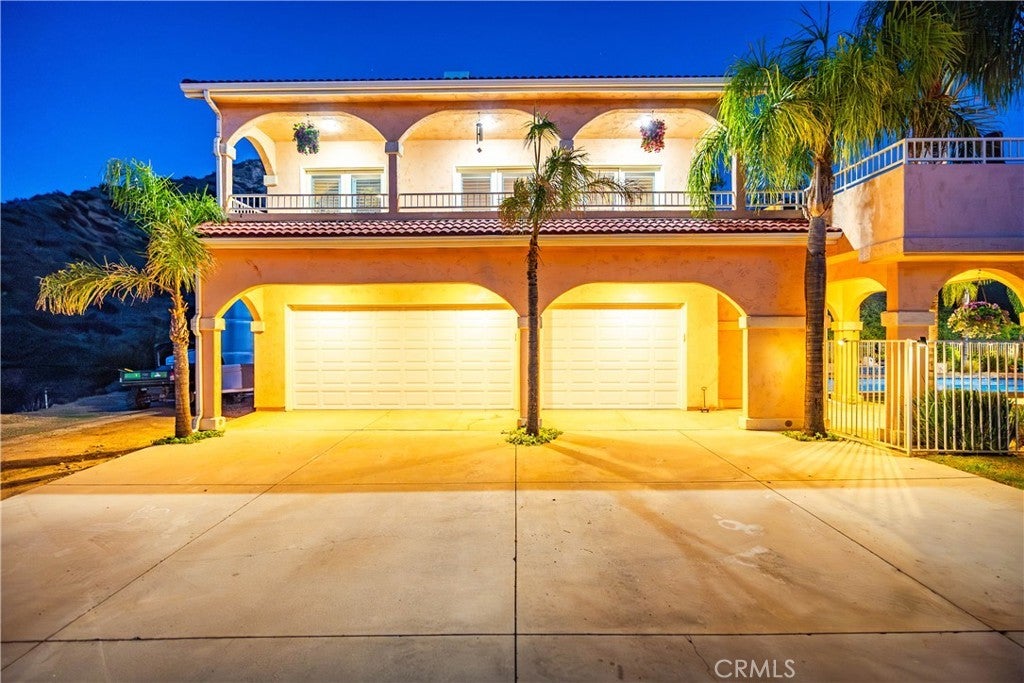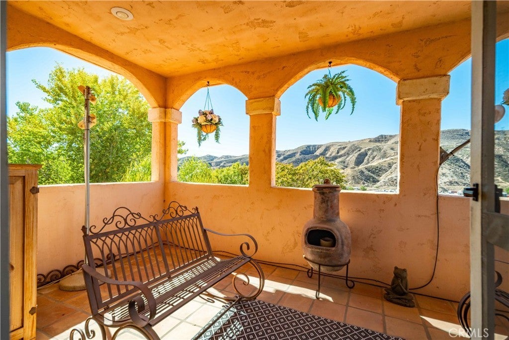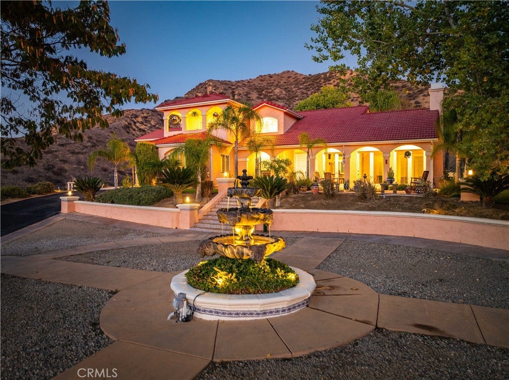 Discover unmatched tranquility and sweeping mountain vistas from this custom Mediterranean estate, perfectly set on six plush acres in historic San Francisquito Canyon. Built in 1994, this 3,151 sq. ft. villa offers 3 bedrooms, 2.5 baths, and a versatile bonus room. A grand double-door entry welcomes you past lighted fountains into a foyer with vaulted ceilings and authentic Saltillo tile floors throughout the main level. The living and dining rooms center around a Spanish-tiled wood burning fireplace, framed by windows and French doors that open to the front patio and breathtaking views. The chef's kitchen features cobalt blue Italian tile, a butcher block island, and a walk-in pantry, while the adjoining family room offers a wood stove and views of the pool. The main level also includes two bedrooms, 1.5 baths, a bonus room, and a laundry area. Upstairs, the primary suite is a private retreat with vaulted ceilings, panoramic views, a private deck, and a spa-inspired bath with Jacuzzi tub, large shower, and dual vanities. Step outside to an entertainer's paradise featuring a 20' x 40' heated pool and spa, built-in BBQ, and expansive patios perfect for relaxing or entertaining. The lower acreage offers open meadows ideal for horses, barns, storage, or stables. Above the oversized 3-car garage -with 9'+ ceilings, 220V power, sink, and automatic openers - is a fully permitted 650+ sq. ft. guest house featuring vaulted ceilings, a kitchen, wood stove, large bedroom, 3/4 bath, and private deck with panoramic views. An elevator provides wheelchair access, perfect for guests or extended family. Enjoy ultimate privacy where deer graze at dusk and peace surrounds you. A true blend of Mediterranean charm and Santa Clarita serenity - this one-of-a-kind estate must be seen to be believed.