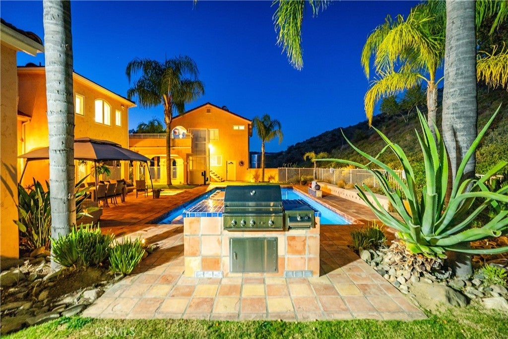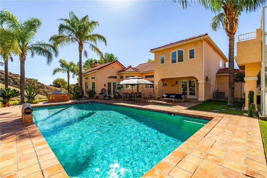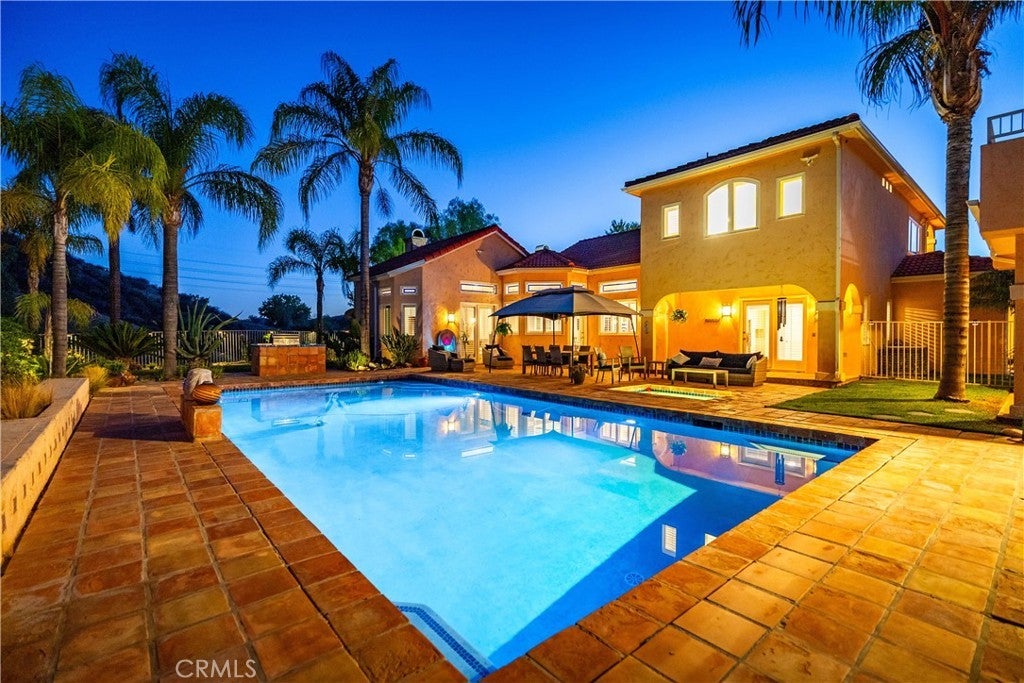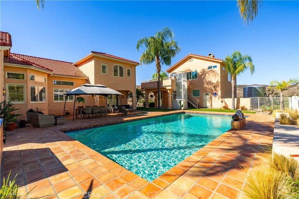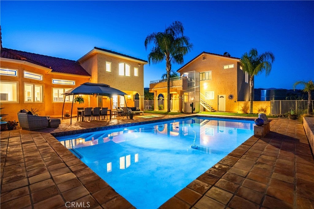 Discover unmatched tranquility and sweeping mountain vistas from this custom Mediterranean estate, perfectly set on six plush acres in historic San Francisquito Canyon. Built in 1994, this 3,151 sq. ft. villa offers 3 bedrooms, 2.5 baths, and a versatile bonus room. A grand double-door entry welcomes you past lighted fountains into a foyer with vaulted ceilings and authentic Saltillo tile floors throughout the main level. The living and dining rooms center around a Spanish-tiled wood burning fireplace, framed by windows and French doors that open to the front patio and breathtaking views. The chef's kitchen features cobalt blue Italian tile, a butcher block island, and a walk-in pantry, while the adjoining family room offers a wood stove and views of the pool. The main level also includes two bedrooms, 1.5 baths, a bonus room, and a laundry area. Upstairs, the primary suite is a private retreat with vaulted ceilings, panoramic views, a private deck, and a spa-inspired bath with Jacuzzi tub, large shower, and dual vanities. Step outside to an entertainer's paradise featuring a 20' x 40' heated pool and spa, built-in BBQ, and expansive patios perfect for relaxing or entertaining. The lower acreage offers open meadows ideal for horses, barns, storage, or stables. Above the oversized 3-car garage -with 9'+ ceilings, 220V power, sink, and automatic openers - is a fully permitted 650+ sq. ft. guest house featuring vaulted ceilings, a kitchen, wood stove, large bedroom, 3/4 bath, and private deck with panoramic views. An elevator provides wheelchair access, perfect for guests or extended family. Enjoy ultimate privacy where deer graze at dusk and peace surrounds you. A true blend of Mediterranean charm and Santa Clarita serenity - this one-of-a-kind estate must be seen to be believed.