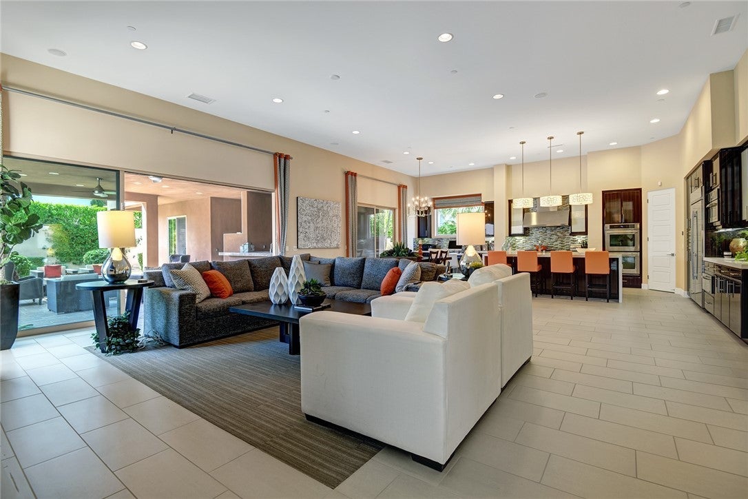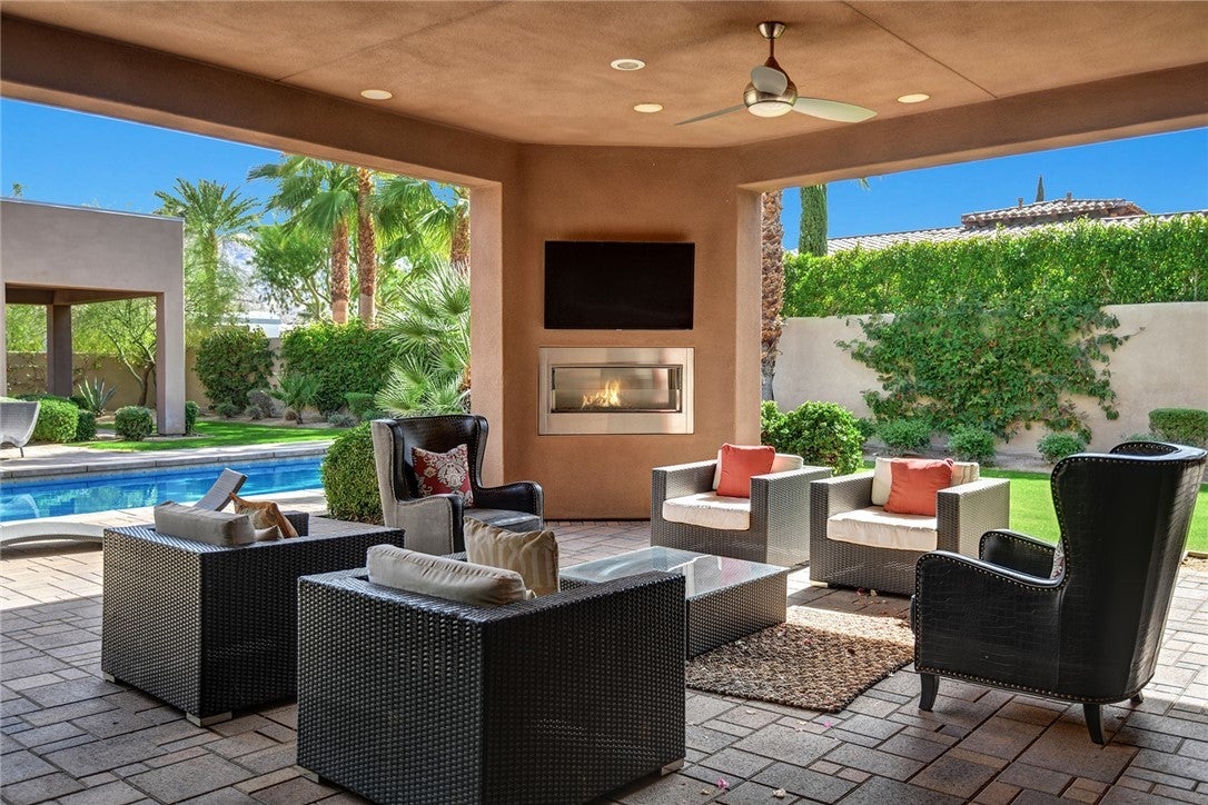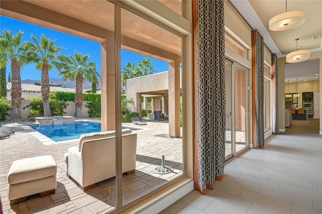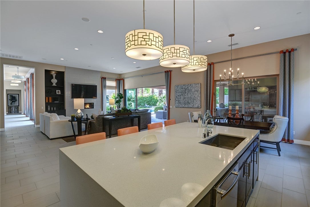 Discover unparalleled luxury in this stunning modern home, located within the exclusive Estancias at South Palm Canyon private community. Designed for both comfort and sophistication, this residence showcases three expansive ensuite bedrooms, a stylish powder room, and a separate casita, ideal for guests or extended stays. Step inside the open-concept great room, where sleek European style cabinetry elevates the space. A versatile floor plan allows for a formal dining area, or a welcoming conversation den, an elegant wine room and a dry bar, perfect for entertaining. The casita features a spacious bedroom, a sleek bathroom with a walk-in shower, and a kitchenette complete with a microwave and beverage chiller. For ultimate convenience, an outdoor tiled shower offers seamless access from the sparkling saltwater pebble pool and spa, perfect for refreshing dips under the sun. Designed with sustainability and efficiency in mind, this home is solar-powered and features dual tankless water heaters. A three-car garage provides ample storage and convenience. Outside, a seating area with a fireplace and TV creates an inviting ambiance for al fresco gatherings. Whether enjoying a quiet evening under the stars or hosting guests, this home is the ultimate blend of modern luxury and relaxed elegance. Don’t miss this exceptional opportunity to own a piece of paradise in one of the area’s most sought-after communities! FEE Land.
