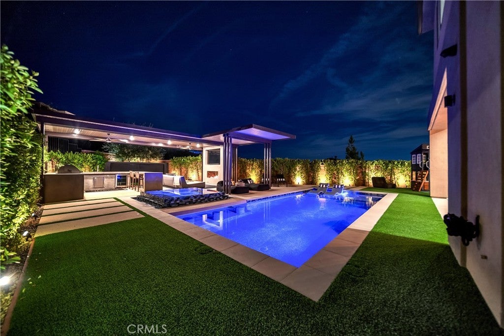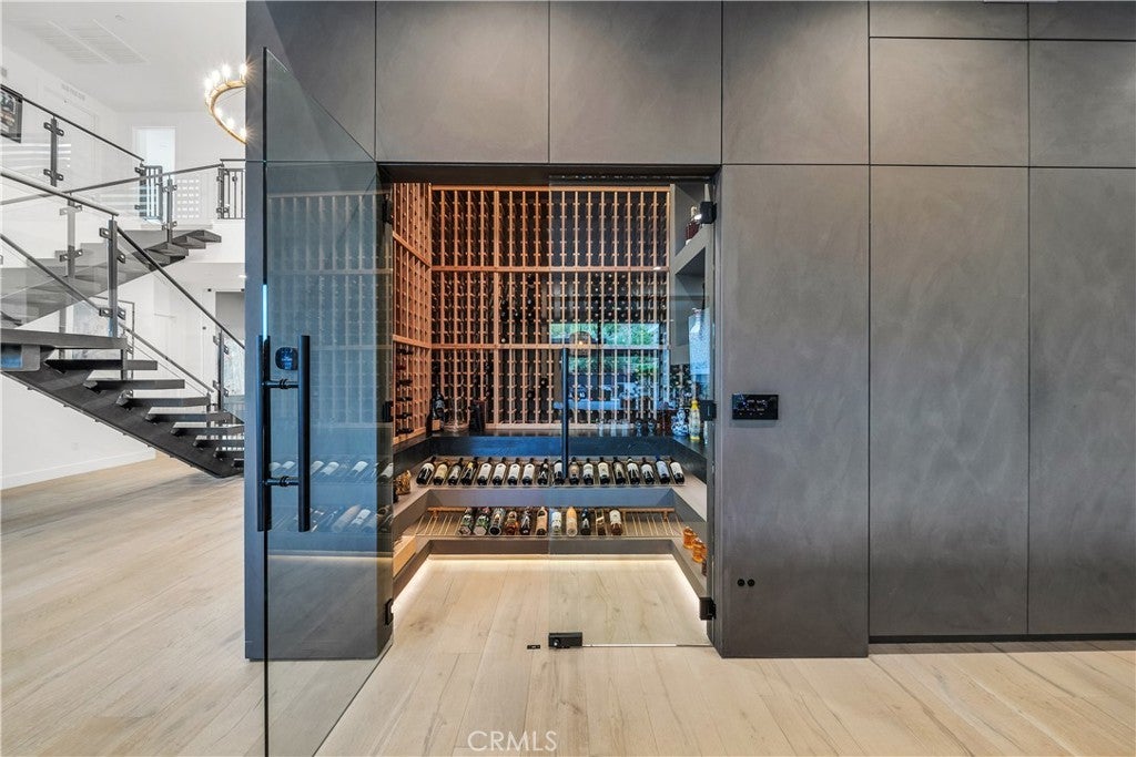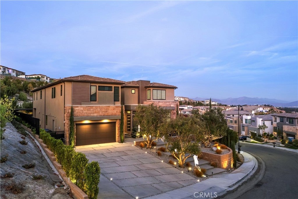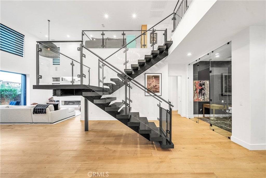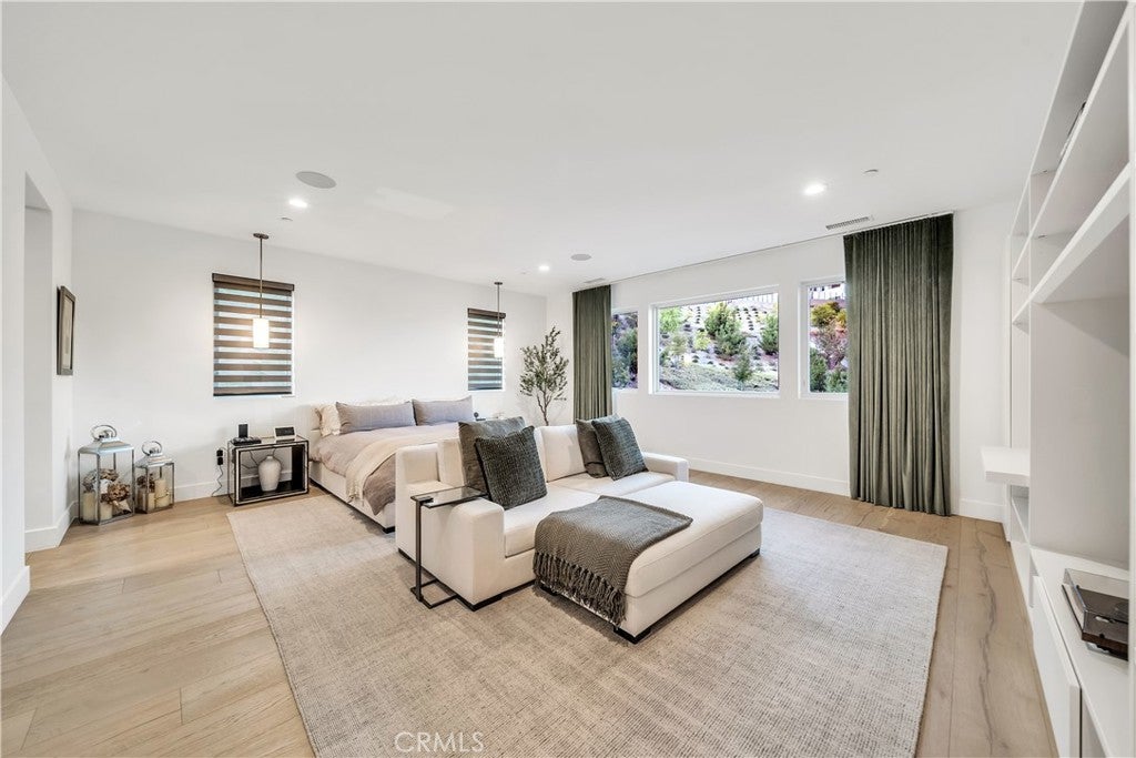 This luxurious residence sits on nearly 19,000 square feet, one of the largest lots available. Showcasing meticulously landscaped grounds with a grand driveway and a charming walkway lined with expensive age-old olive trees. Located behind the gates in the prestigious Westcliffe community, a guard gated enclave in the upscale Los Angeles suburb of Porter Ranch. This Vega floor plan- Cascades Collection is 4,932 square feet of living space, and it's no surprise that this layout is a favorite among many. As you enter, you’ll be captivated by the dramatic floating piano-black staircase, expansive 11-inch white oak flooring, and soaring ceilings that create an inviting atmosphere. This home offers five spacious bedrooms and five bathrooms, including a generous en-suite bedroom on the first floor with a retreat area. An elegant executive-style office, complete with double glass doors, provides an ideal executive workspace. The heart of the home is the state-of-the-art Elmar Cucine kitchen, known for its exquisite Italian craftsmanship. Featuring clay-finished and matte lacquer cabinets, a striking 20-foot custom porcelain island, and high-end Thermador appliances. Flush sliding pocket doors and floor-to-ceiling windows enhance the open-concept layout, allowing natural light to flood the space. Enter the living area to find breathtaking 72 inch open shelving fireplace with custom floor-to-ceiling wall treatment. Ascend to the second floor to discover the expansive master suite, complete with dual vanities, a walk-in shower, and a luxurious freestanding soaking tub set against Italian oak finished vanity with white quartz countertops. Four additional bedrooms and three bathrooms with a loft area featuring custom built-ins serving as movie room. Step outside to your private backyard oasis, featuring a pebble Fina pool and spa, two fire pits, an oversized recessed patio lounge, a BBQ center, tranquil waterfall feature and outdoor pool shower. Smart home with an integrated sound system, sonos speakers for seamless backyard entertaining, and OWNED SOLAR PANELS. This incredible home offers the ultimate blend of luxury and comfort in a sought-after community.