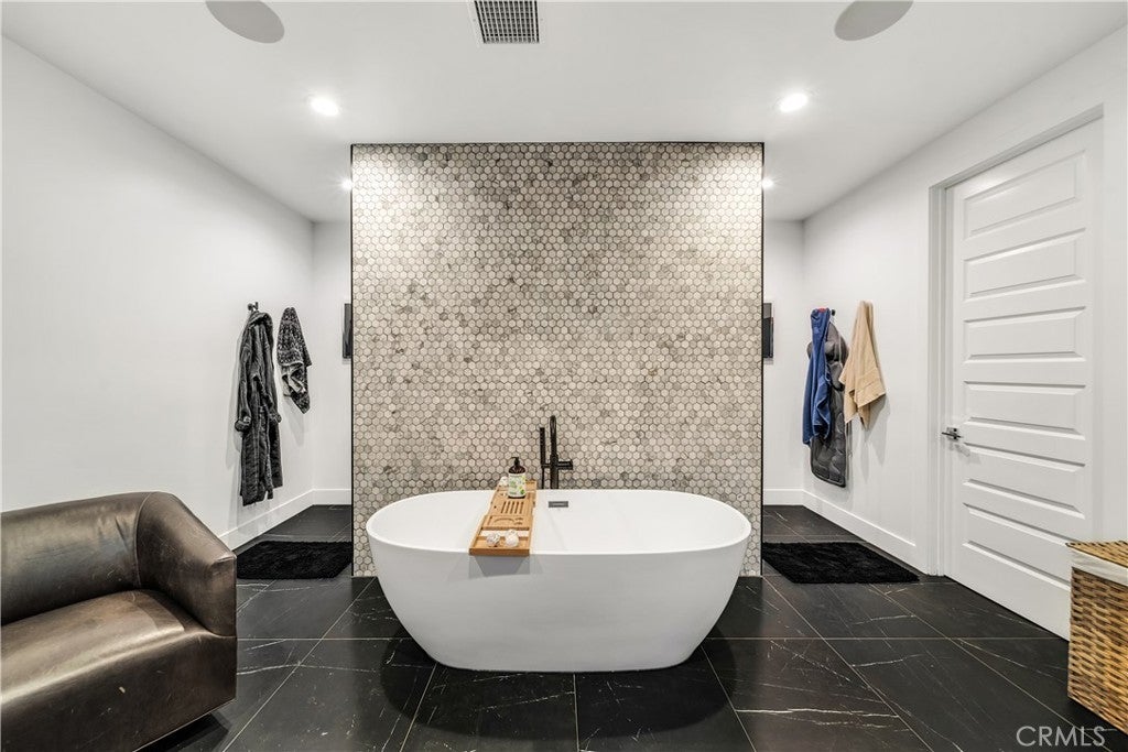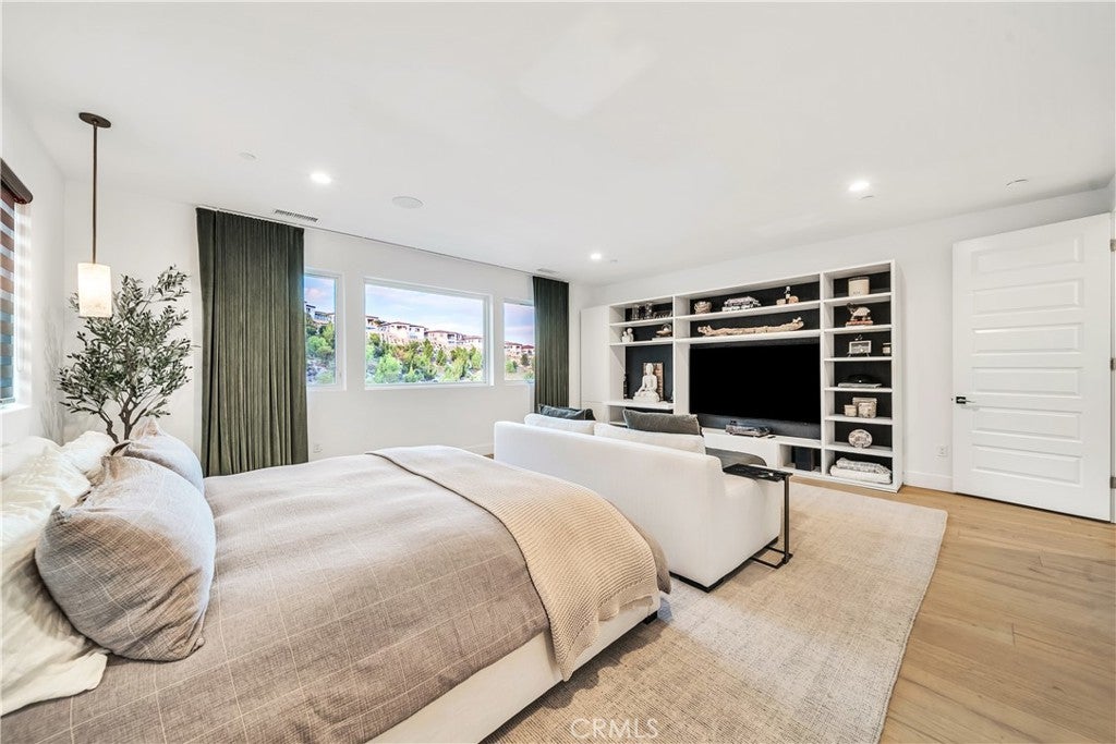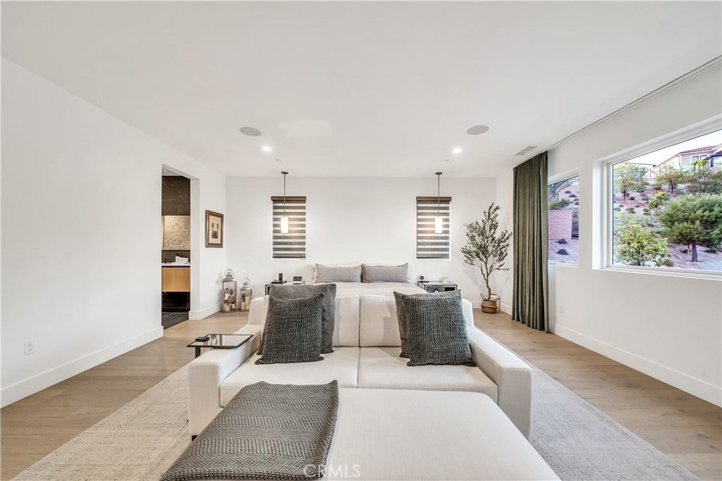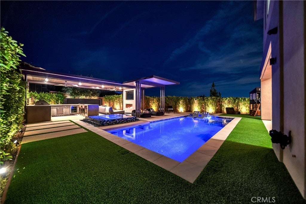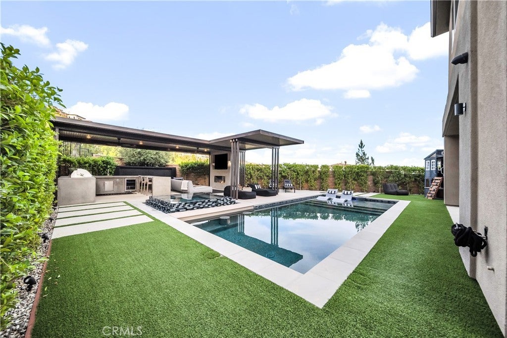 This luxurious residence sits on nearly 19,000 square feet—one of the largest lots available. Showcasing meticulously landscaped grounds with a grand driveway and a charming walkway lined with expensive age-old olive trees. Located behind the gates in the prestigious Westcliffe community, a guard gated enclave in the upscale Los Angeles suburb of Porter Ranch. This Vega floor plan- Cascades Collection is 4,932 square feet of living space, and it's no surprise that this layout is a favorite among many. As you enter, you’ll be captivated by the dramatic floating piano-black staircase, expansive 11-inch white oak flooring, and soaring ceilings that create an inviting atmosphere. This home offers five spacious bedrooms and five bathrooms, including a generous en-suite bedroom on the first floor with a retreat area. An elegant executive-style office, complete with double glass doors, provides an ideal executive workspace. The heart of the home is the state-of-the-art Elmar Cucine kitchen, known for its exquisite Italian craftsmanship. Featuring clay-finished and matte lacquer cabinets, a striking 20-foot custom porcelain island, and high-end Thermador appliances. Flush sliding pocket doors and floor-to-ceiling windows enhance the open-concept layout, allowing natural light to flood the space. Enter the living area to find breathtaking 72 inch open shelving fireplace with custom floor-to-ceiling wall treatment. Ascend to the second floor to discover the expansive master suite, complete with dual vanities, a walk-in shower, and a luxurious freestanding soaking tub set against Italian oak finished vanity with white quartz countertops. Four additional bedrooms and three bathrooms with a loft area featuring custom built-ins serving as movie room. Step outside to your private backyard oasis, featuring a pebble Fina pool and spa, two fire pits, an oversized recessed patio lounge, a BBQ center, tranquil waterfall feature and outdoor pool shower. Smart home with an integrated sound system, sonos speakers for seamless backyard entertaining, and OWNED SOLAR PANELS. This incredible home offers the ultimate blend of luxury and comfort in a sought-after community.