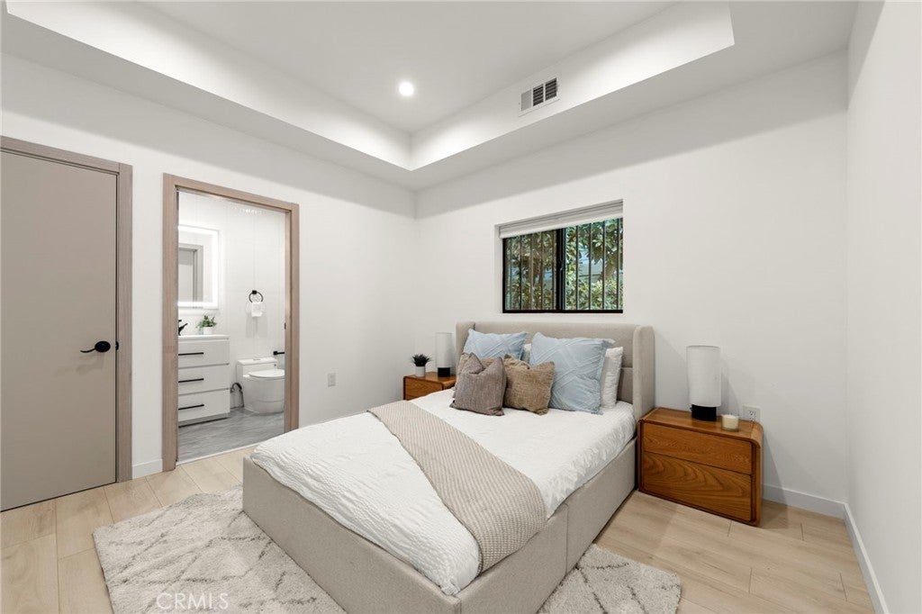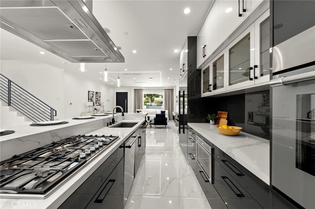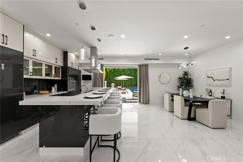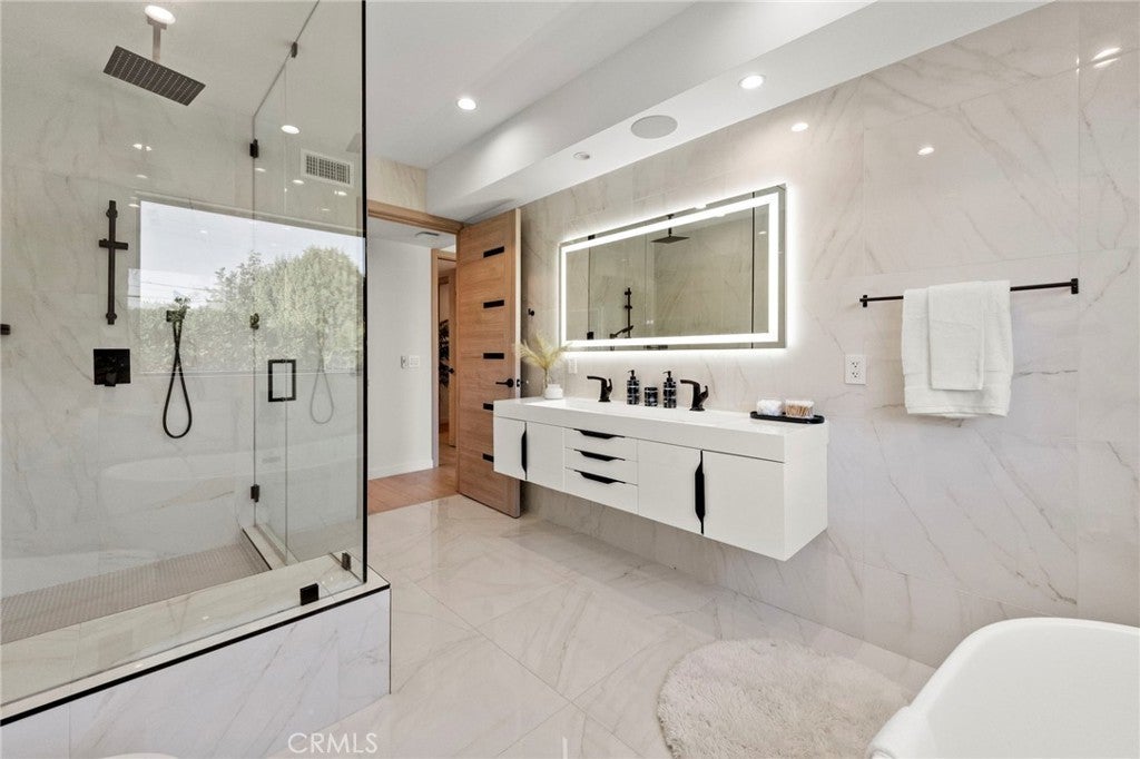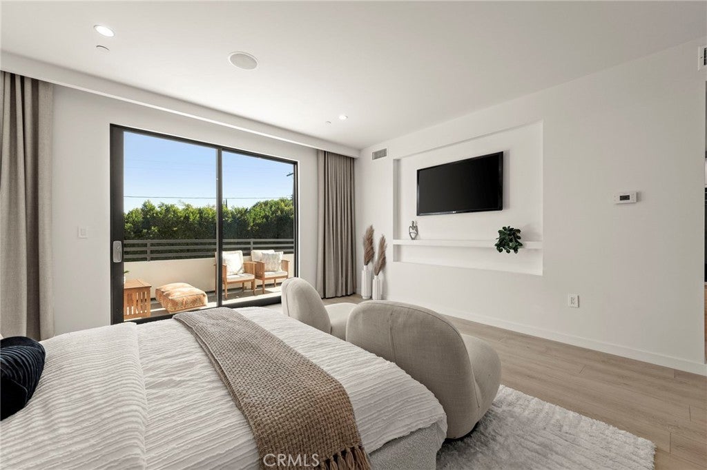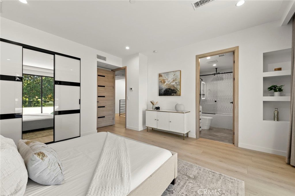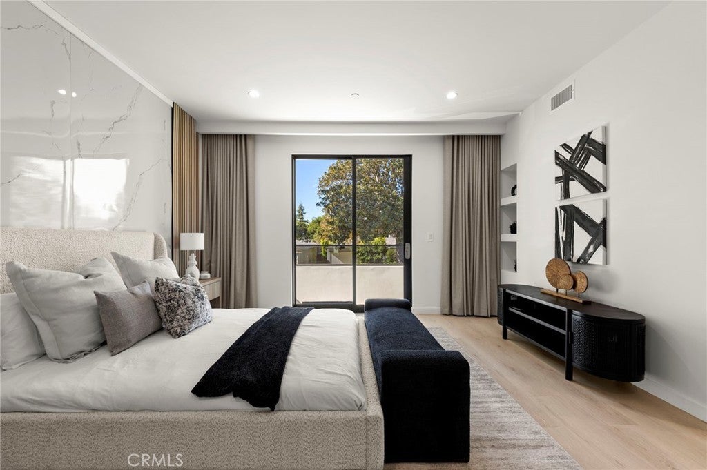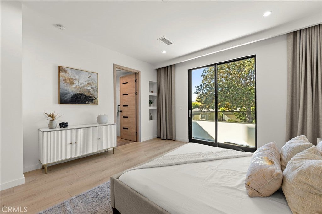 2024 Modern Architectural with Pool, Spa, Designer Closet, Paid Solar & Smart-Home Luxury in Carpenter School District. This 2024 modern architectural residence defines sophistication, innovation, and comfort in one of Studio City’s most desirable neighborhoods. Located within the highly rated Carpenter Community Charter School District, the home offers nearly 2,900 square feet of contemporary living space behind sleek automated gates, combining privacy, sustainability, and elegance with seamless indoor-outdoor flow. The open-concept main level is anchored by a dramatic living area featuring a linear fireplace and floating ceiling that enhance both scale and comfort. The dining area transitions effortlessly into the chef’s kitchen, showcasing a waterfall-edge quartz island, high-gloss European cabinetry, and premium built-in appliances. Every room is designed with modern precision, abundant natural light, and a harmonious sense of balance. Upstairs, the primary suite serves as a private sanctuary with a large terrace and a spa-inspired bathroom featuring a freestanding soaking tub, frameless glass shower, floating double vanity, and LED-lit mirrors. The custom walk-in closet rivals a high-end boutique, with glass-enclosed shelving, a central island, soft-close drawers, and integrated lighting. A secondary suite with its own private balcony and designer finishes completes the upper level. Sliding glass doors open to a tranquil backyard oasis surrounded by tall ficus hedges for complete privacy. The outdoor space features a fully automated pool and spa, multiple lounge areas, and a covered dining patio designed for effortless entertaining and relaxation. This home is powered by paid-off solar panels, offering energy efficiency and long-term savings. A fully integrated smart-home system allows control of lighting, climate, security, and pool settings from your phone. Additional features include wide-plank engineered flooring, skylights, designer bathrooms with matte black fixtures, a two-car garage with frosted glass door, gated driveway, and lush privacy landscaping. Just moments from Ventura Boulevard’s dining, boutiques, and entertainment, this residence embodies the pinnacle of modern California living—where architecture, technology, and sustainability meet in perfect harmony.