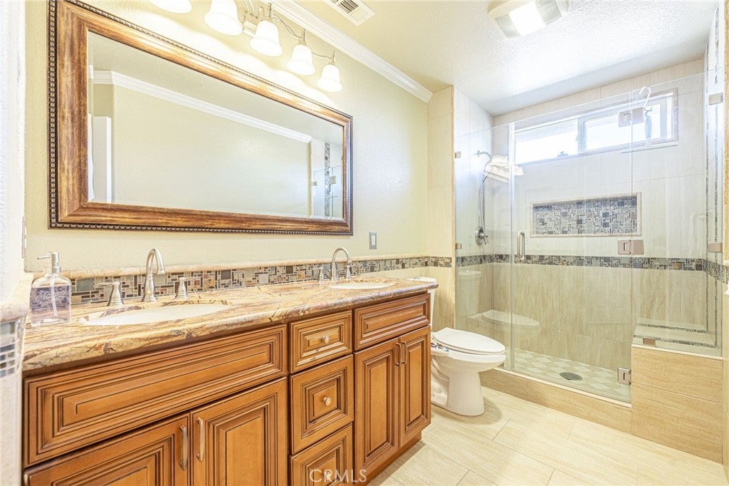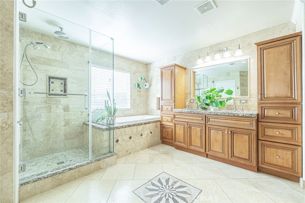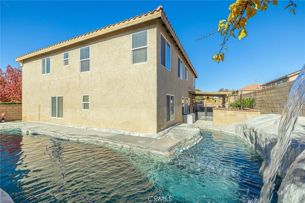 A stunning Quartz Hill pool home offering nearly 3,600 sq ft of upgraded living space and a fully owned 25-panel solar system. Situated in one of the most desirable west-side neighborhoods with no Mello-Roos, this home offers impressive curb appeal with a wide driveway, room for additional vehicles, and a block wall paired with decorative iron accents leading to the front entry. Inside, enjoy a bright open layout with a large living room, spacious family room, elegant trim details, crown molding, and abundant natural light. The kitchen provides generous cabinet storage, a center island, walk-in pantry, and an extended breakfast bar perfect for entertaining. A downstairs office/flex room adds versatility and can function as a potential fifth bedroom. Upstairs, the expansive primary suite features dual walk-in closets and a beautifully remodeled spa-style bathroom with custom cabinetry, dual sinks, a soaking tub, and a stone-tiled shower. The additional bedrooms include ceiling fans, and both the upstairs secondary bath and the downstairs bath have been tastefully remodeled. The backyard is a true private retreat showcasing a covered patio with lighting and ceiling fan, a designated outdoor dining space, and a gated rock-style pool with a shallow lounging ledge, natural stone coping, waterfall feature, and updated equipment. The home also includes a whole-house fan for added comfort and energy efficiency. A rare Quartz Hill opportunity offering space, style, and exceptional outdoor living.