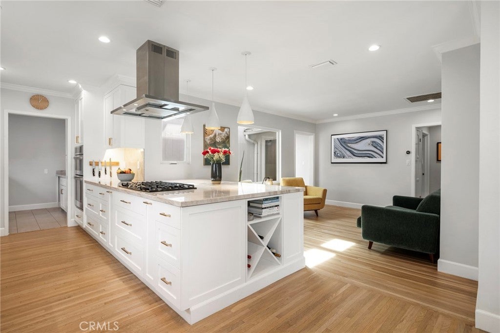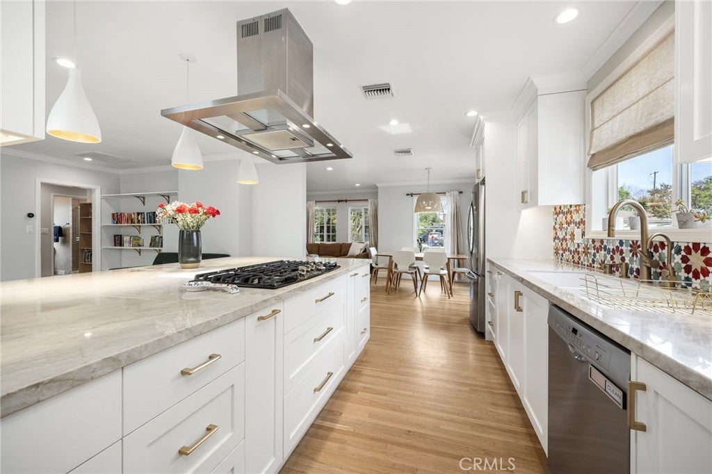 This picture-perfect home sits in one of Lake Balboa’s most sought-after pockets, offering warmth, charm, and beautifully curated updates throughout. The inviting curb appeal sets the tone, leading into a light-filled, partially open-concept living area with refinished original hardwood floors, a cozy fireplace, and an adjacent dining room. The showstopping kitchen—remodeled in 2020—is truly exceptional for this price point, featuring high-end custom cabinetry, stainless steel appliances, and an oversized quartzite-topped peninsula ideal for cooking, gathering, or entertaining. Just off the kitchen is a spacious family room anchored by a unique atrium that provides the center of the home with natural light. Thoughtful bedroom separation includes generously sized rooms and a large primary suite with its own en-suite bath and sliding doors that open directly to the backyard. Outside, twenty-five-foot Cypress trees create a private, serene backdrop perfect for relaxation or play. Significant upgrades include a newer 40-year roof, tankless water heater, newer 5-ton HVAC, 200-amp electrical panel, and a newly retrofitted foundation—providing peace of mind for years to come. With close proximity to the 101 and 405, Lake Balboa Park, the Encino Farmers Market, a local dog park, multiple golf courses, and Mikas Tennis & Pickleball Academy, this home checks all the boxes.