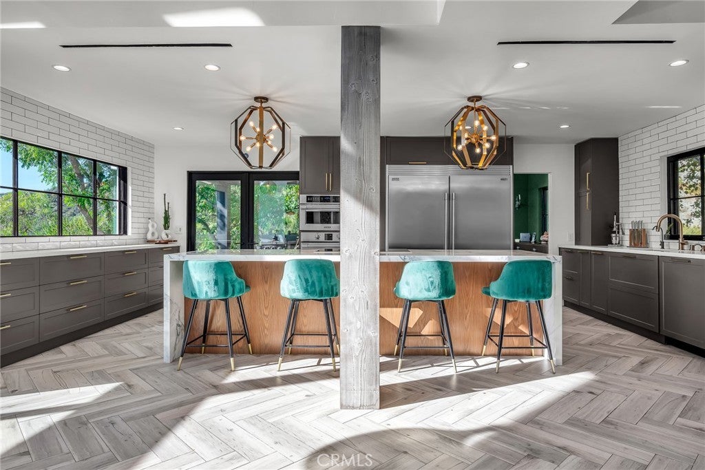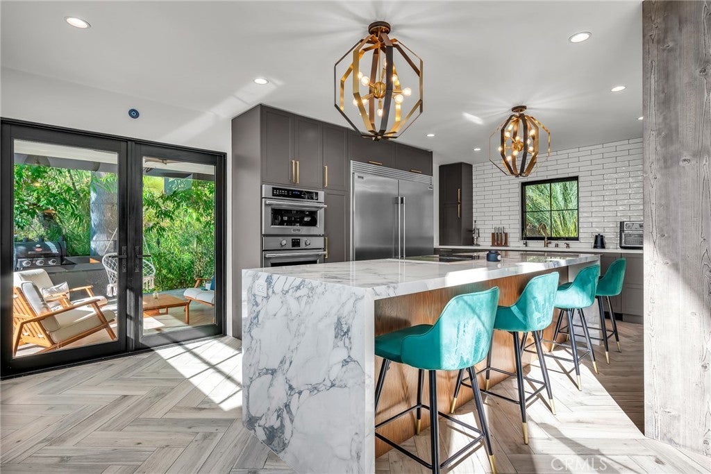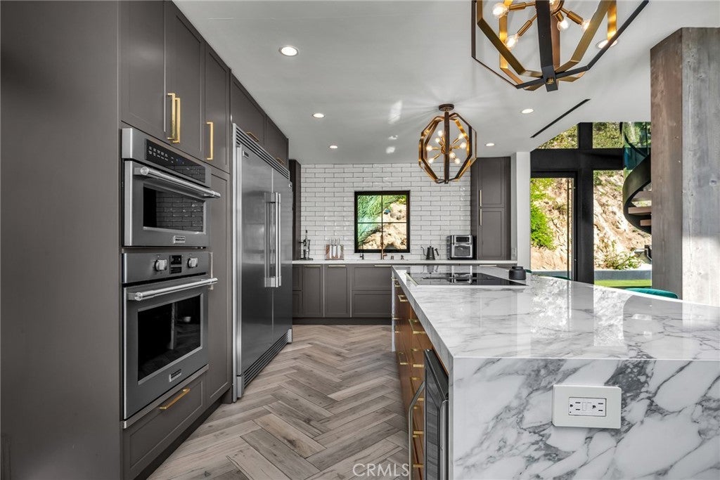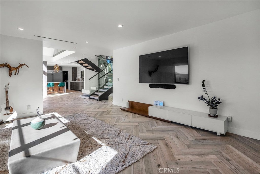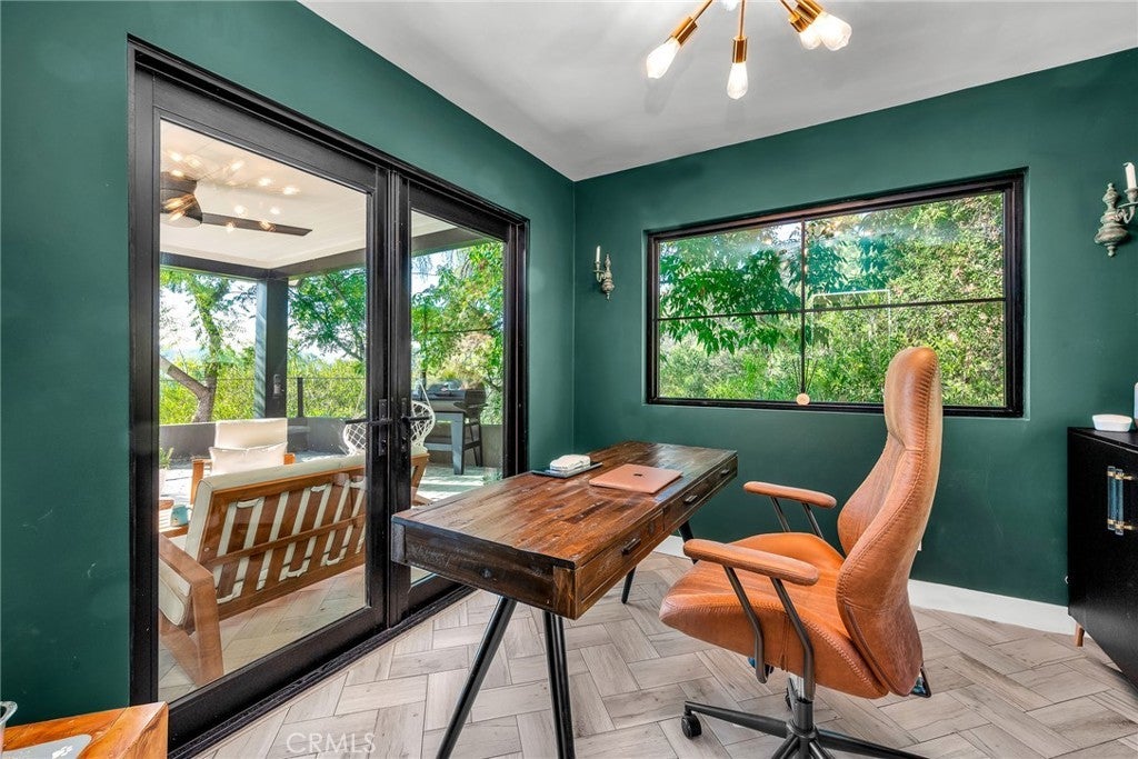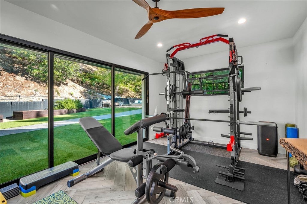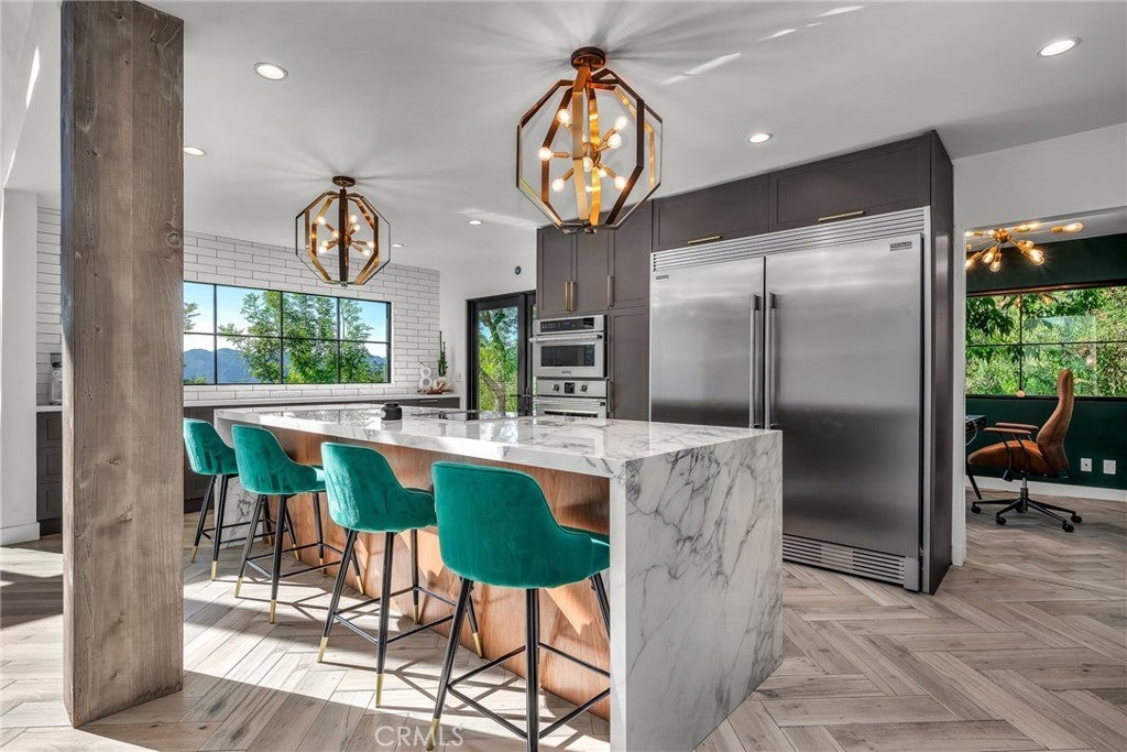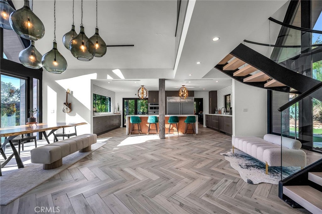 Perfect Home with Spectacular Views. A Truly Must See! Modern living at its finest in this stylish mountaintop estate with Private Gate. Peacefully located on a quiet and secluded 3.7 acres surrounded by nature in the tranquility of the Malibu Hills. This 4 bedroom, 3.5 bath plus office, modern farmhouse received a tasteful and timeless remodel in 2020 by acclaimed designer Jennifer Farrell featuring custom glass walls, a floating glass and steel staircase, herringbone floors, wood burning fireplace and a NanaWall that opens to panoramic views of the Santa Monica Mountains. The luxurious interior includes a gourmet kitchen with stainless steel appliances, Caesarstone and porcelain countertops, a walnut island, and a dedicated office with stunning views opening to a large wrap-around deck. Two elegantly appointed bedrooms, a full bathroom, powder, and a laundry room complete the downstairs. The upstairs includes a beautifully appointed guest suite and the primary wing which boasts custom closets, a coffee and wine bar, and Fleetwood glass doors that open to a private balcony with mesmerizing views. The primary bathroom is outfitted with separate vanities, an ultra-stylish wet room with a luxury 3-way shower, a soaking tub, and a skylight. This mountaintop estate is truly one of a kind. Home Gym included! Negotiable