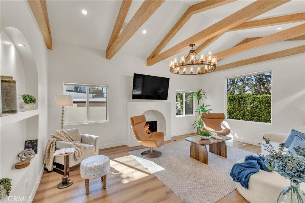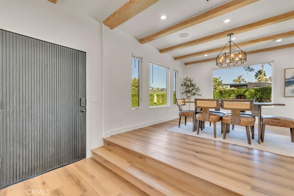 Beamed Ceilings, Ceiling Fan(s), Separate/Formal Dining Room, High Ceilings, Open Floorplan, Recessed Lighting, Entrance Foyer, Primary Suite, Sunken Living Room