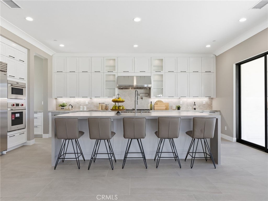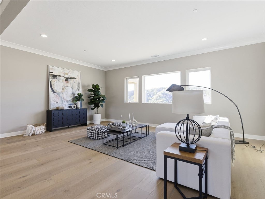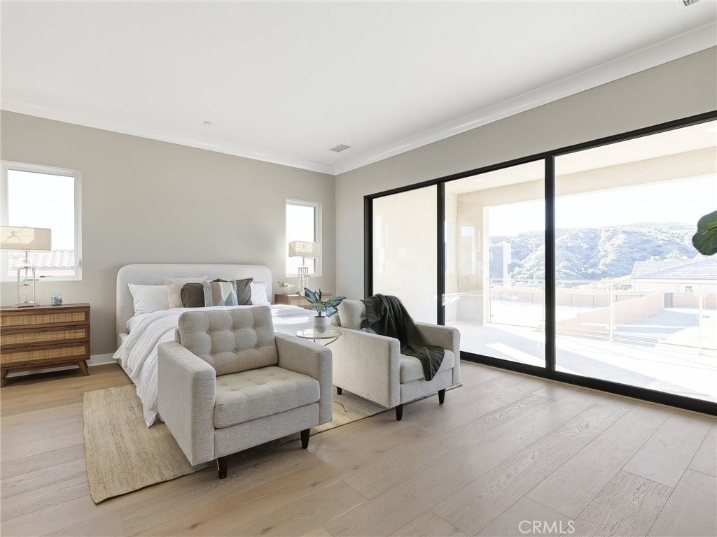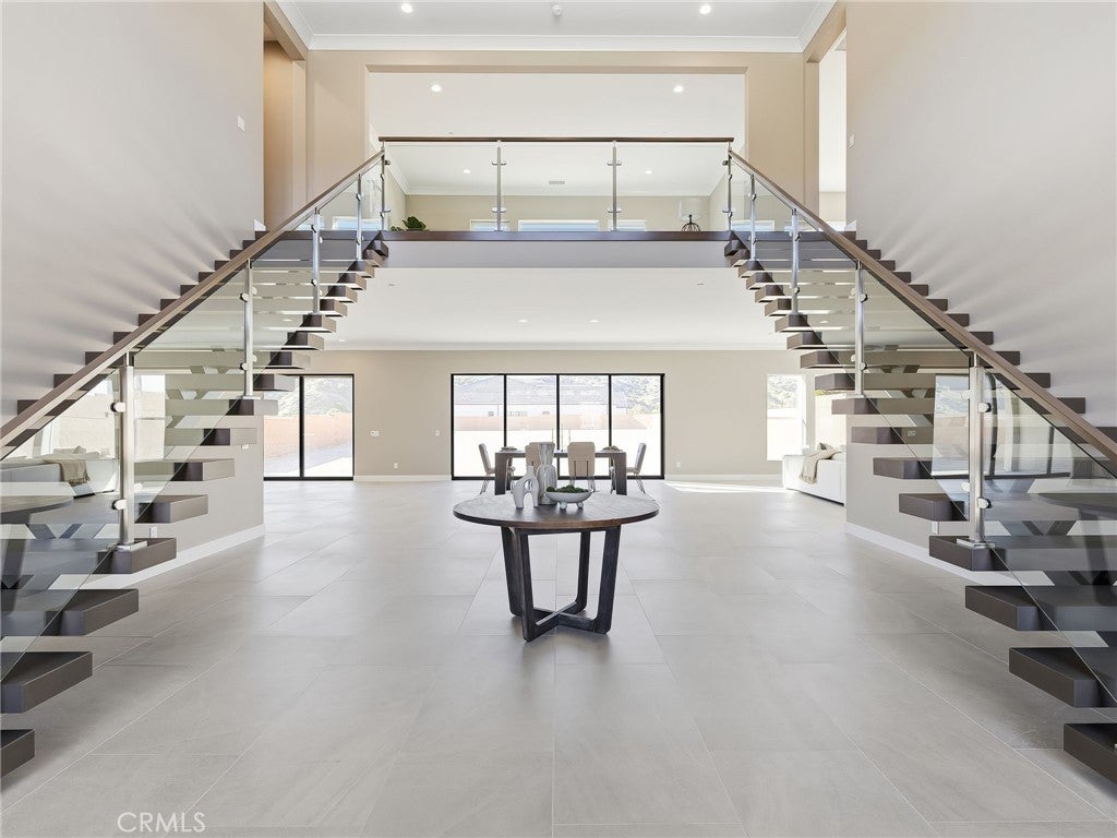 Welcome home to this exceptional model-like home by Toll Brothers in the final community in Porter Ranch! Last chance to own one of two last available Idylwild homesites at the Ridge at Bella Vista. Fully designer appointed features including the Idylwild's impressive, covered entry with double doors that opens to the soaring two-story foyer with dual floating staircase, revealing views to the two-story casual dining area with 16 by 8 multi stacked doors off the casual dining allowing that indoor/outdoor California living. The well-equipped gourmet kitchen is enhanced by a large center island with breakfast bar, including upgraded quartzite in kitchen perimeter, waterfall at kitchen island, Wolf and Sub-Zero Refrigerator and wine chiller, upgraded high reflective white paint craftsman style cabinets including our fresh furniture package option taking the cabinets in the kitchen all the way up to the ceiling, plenty of counter and cabinet space, thoughtful workspace, and sizable walk-in pantry. The marvelous primary bedroom suite is complete with an enormous walk-in closet, Owners Suite Deck and 15 by 8 multi stacked doors, peek-a-boo vistas facing west of peaceful vistas of the canyons and dreamy sunsets, deluxe primary bath with dual-sink vanity, fully upgraded tile floors and bathroom shower tile, large soaking tub, luxe shower, and private water closet. This homesite offers 48’ by 24’ porcelain tile flooring throughout with European oak hardwood floors in bedrooms and loft space. Crown molding throughout the entire home. One of the most unique homesites offering over 19,000 sq. ft of *flat pad, large enough to build your dream backyard. 3rd car garage converted to a flex space perfect for a home gym or game room. Additional highlights include a versatile flex space off the foyer, desirable first floor bedroom suite with walk-in closet and private full bath, convenient powder room and drop zone, centrally located laundry, and additional storage. This home offers 2 flex spaces and additional loft. One of the largest living areas and flat pads at the Ridge community. No designer or structural options have been spared. Model like home. Must come to see for yourself!
