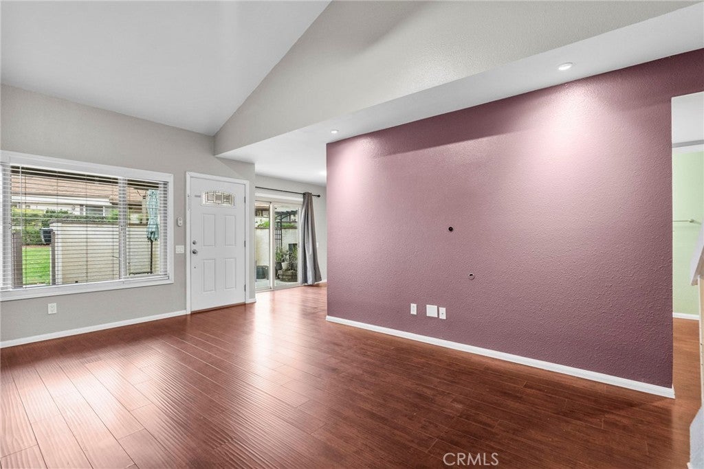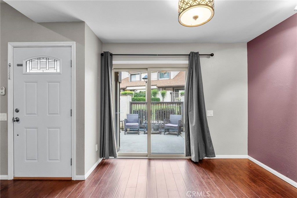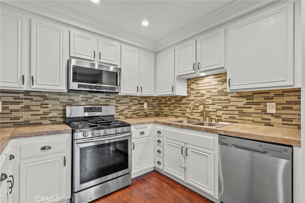 Welcome to this beautifully maintained end-unit 3-bedroom, 1.5-bath townhome in the highly sought-after Vista Fairways community of Valencia! Located just steps from one of the three community pools and backing the scenic Valencia Golf Course, this home offers privacy, convenience, and resort-style living. Step inside to vaulted ceilings, crown molding, and an office nook, with upgraded engineered wood flooring downstairs and plush carpet and tile upstairs. The kitchen features Samsung appliances, painted cabinets, while beautifully updated bathrooms, including a downstairs half bath, add modern comfort. Enjoy natural light from newer dual-pane windows and a sliding glass door leading to a partially covered private patio. The primary bedroom boasts a walk-in closet and included TV with wall mount, and the other 2 bedrooms features a built-in closet with custom paint. Additional upgrades include a finished garage with epoxy flooring, ample storage, attic access, newer vents and door knobs, a 3-year-old water heater, and a yearly-serviced HVAC system. Ring doorbell installed for added security. Perfectly situated near top-rated Meadows Elementry school, shopping, dining, California Institute of the Arts, College of the Canyons, and with easy access to the 5 Freeway, this meticulously cared-for home blends comfort, style, and convenience—move in and enjoy!