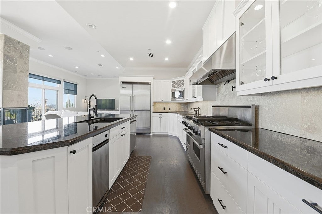 “WOW” will be the reaction from your guests, and your own emotions, when you pull up to this impressive home. You’re greeted by a massive pivot entry door and a striking 16-foot chandelier suspended from a 24-foot ceiling. Perched high in the hills of Sherman Oaks, this contemporary residence, complete with parking for up to 12 cars behind private gates, captures the perfect balance of sophistication and modern elegance, with sweeping city and mountain views filling every room. The pivot-door entry opens to a light-filled floor plan framed by 12 windows, where 24-foot ceilings and beautifully grained, stained hardwood floors create an atmosphere of refined luxury. An elevator provides effortless access to each level. The home offers 4,560 sq ft of living space with 5 bedrooms and 4.5 bathrooms, including an expansive primary suite that serves as a private retreat with a cozy double-sided fireplace, a spa-inspired tub with breathtaking views, and a dual-head steam shower. The chef’s kitchen is the true heart of the home, outfitted with top-of-the-line appliances and sleek finishes, ideal for both entertaining and everyday living. Outside, the property spans over half an acre and showcases manicured vineyard rows, fruit trees, and a French countryside–style terrace with unforgettable views that turn any conversation into a cherished moment. Each balcony offers perfectly positioned spaces to take in the panoramic scenery. Multiple fireplaces throughout add warmth and ambiance, including one that provides a cozy wood-burning experience. Don’t overlook the garage with custom polished epoxy flooring, ideal for a car enthusiast or hobbyist. Every detail of this home is thoughtfully designed for elevated luxury living, all accessible by your private elevator. Just when your guests think the tour is complete, the stunning rooftop and your own “mini Runyon” backyard hike, complete with a vineyard and 14 fruit trees, take the experience to a new level. Once at the top of the property, the full wow factor unfolds. Perfectly located above Ventura Boulevard in the coveted Sherman Oaks Hills, the home offers a sense of seclusion while remaining moments from the best of Sherman Oaks. Enjoy quick access to major freeways, high-end dining, boutique shopping, and excellent schools. Picture quiet evenings on the deck, breathtaking sunsets, and the ease of Los Angeles living paired with the elevated lifestyle of residing in the hills perched above much of the city.