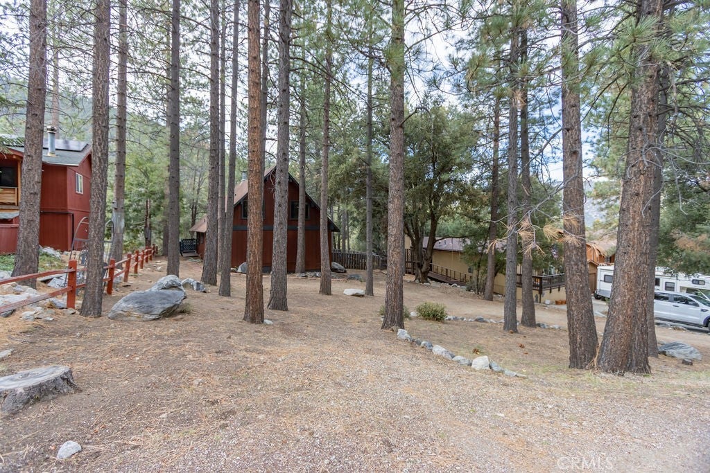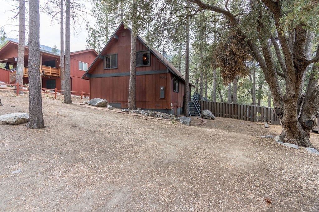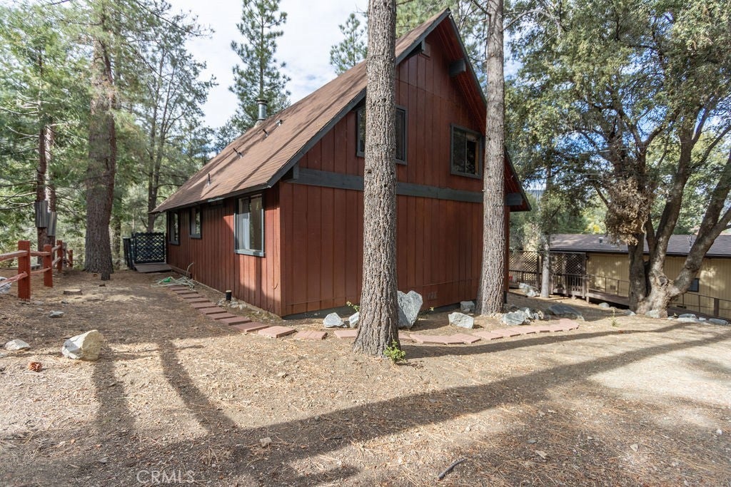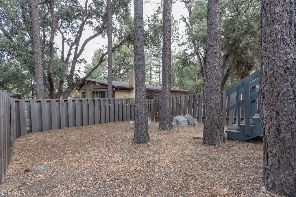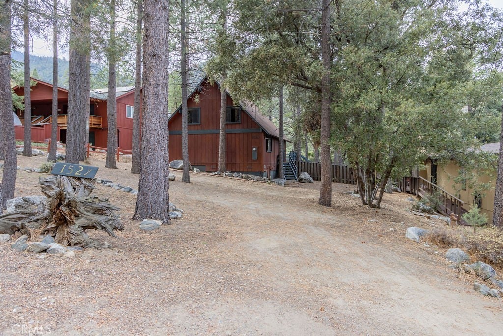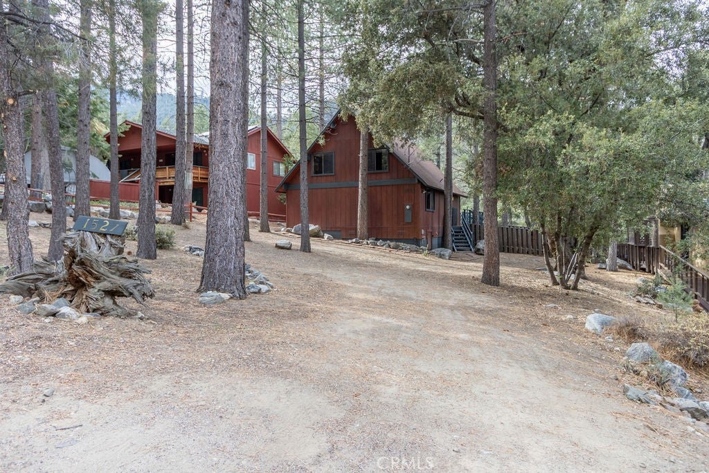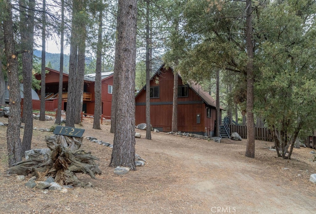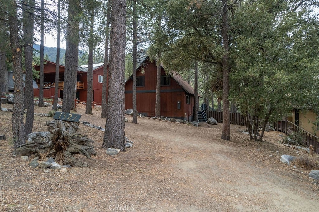 Tucked under towering pines, this 3 bedroom, 1.5 bath cabin has a two-story high great room ceiling with windows looking into the trees and two sets of sliding glass doors opening onto a deck. The kitchen is open to the great room. Also on the main level is a laundry closet, two bedrooms and a bath. Upstairs is an open loft which can be used as a large bedroom as well as a half bath. The slate living room floor adds a special beauty to this home. The bedrooms are carpeted and vinyl floors serve the bathrooms, kitchen and laundry closet. Outside, enjoy the flat front yard with 2 driveways and huge trees, the fenced side yard, large back deck and the green space behind the house. Look into the trees and relax. Come take a look and see if this home calls to you. Enjoy the 1973 vibe or update it as you choose. Check out the community amenities including the clubhouse, pool/spa, golf course, tennis/pickle ball courts, park, stables, hiking and riding trails and more, as well as the activities available every week. Make an appointment to see this well priced home while you still can.